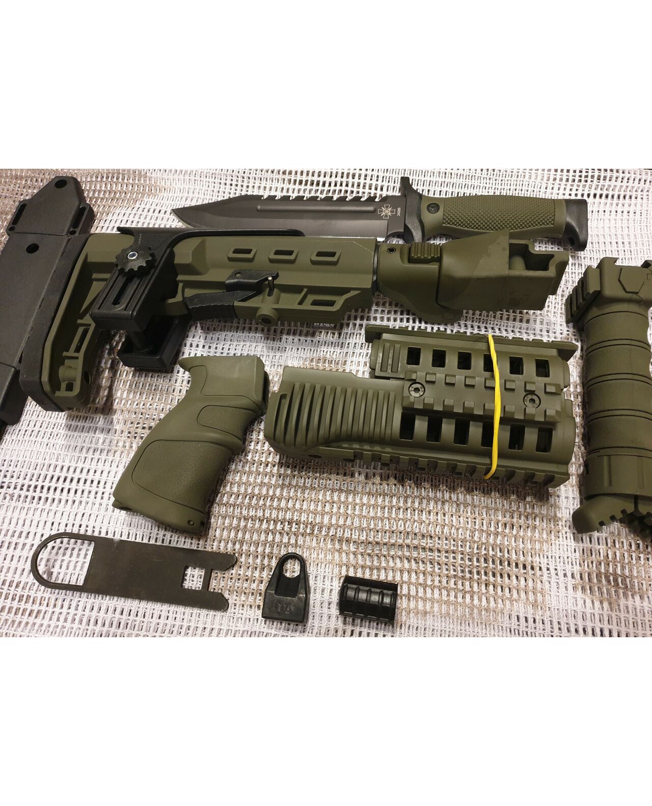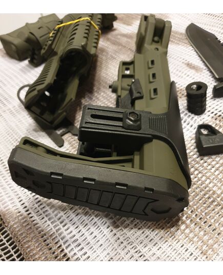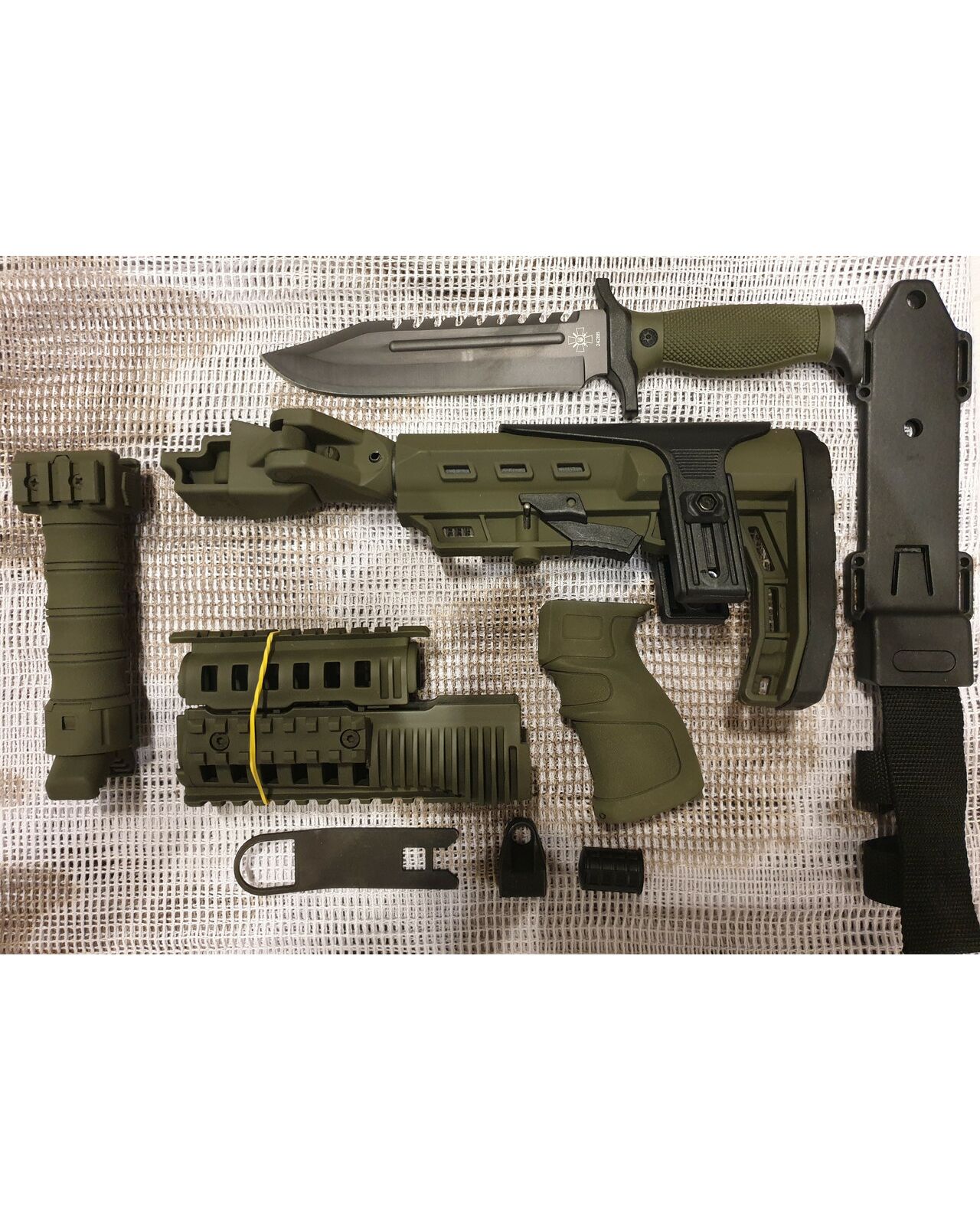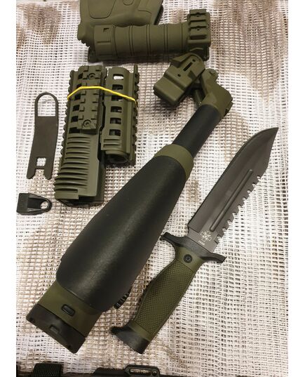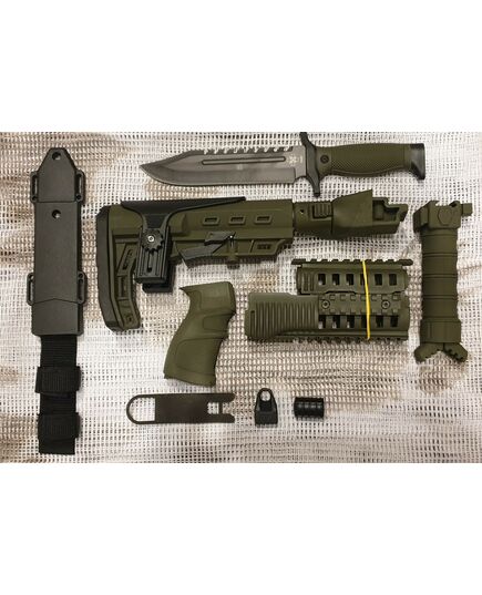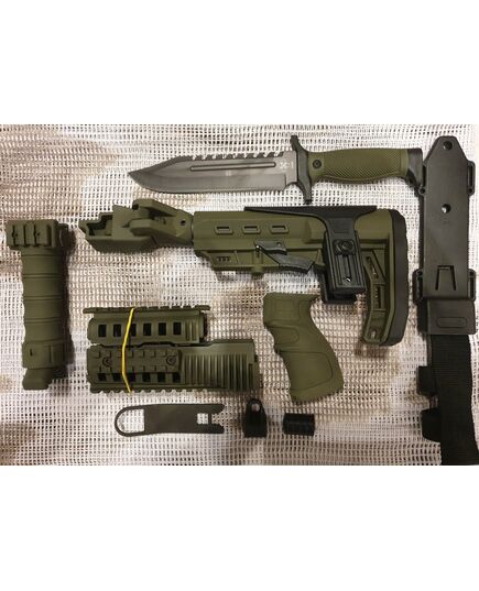 Комплект для апгрейда оружия от официального производителя аксессуаров для стрелкового оружия, фирмы Kral Arms Tactical.Набор состоит из следующих компонентов: скландой телескопический приклад с регулируемой щекой, цевье; накладка на газовую трубку; пистолетная рукоять; ручка переноски огня с интегрированными сошками, антабка, тромикс и боевой нож с тактическими ножнами. Доступный в оливковом цвете. Все монтажные саморезы в комплекте. Подходит на АК74. Идеальная замена штатного "весла" и цевья с накладкой на газовую трубку. Не люфтит, качественный пластик.Обвес изготовлен из термостойкого высококачественного армированного полимера.