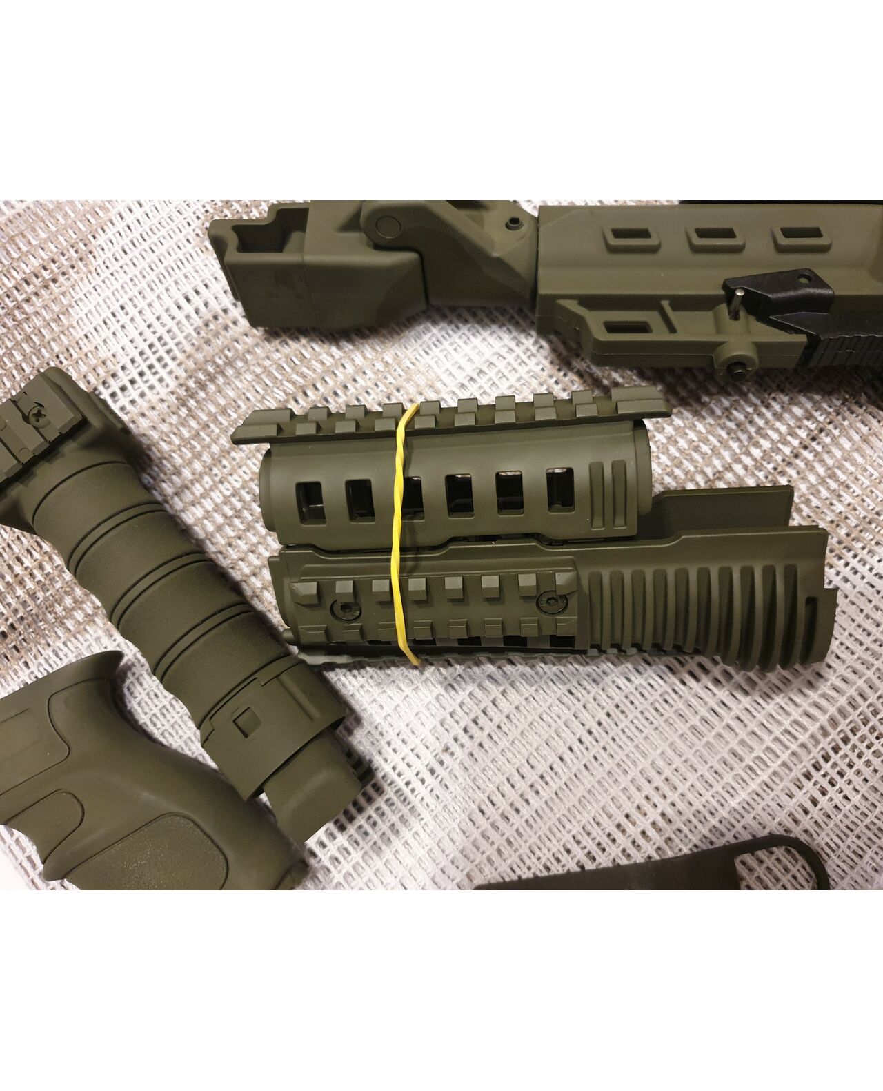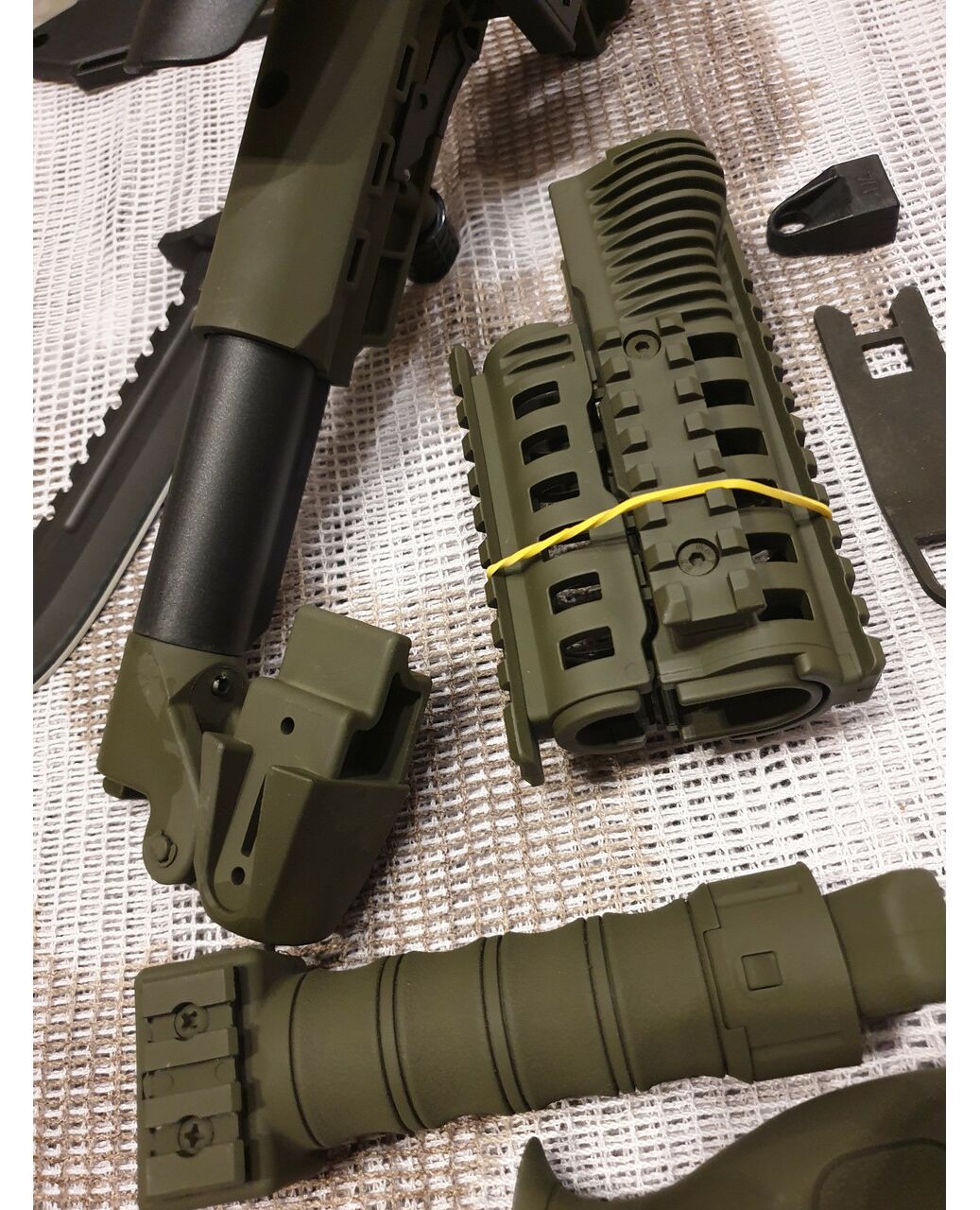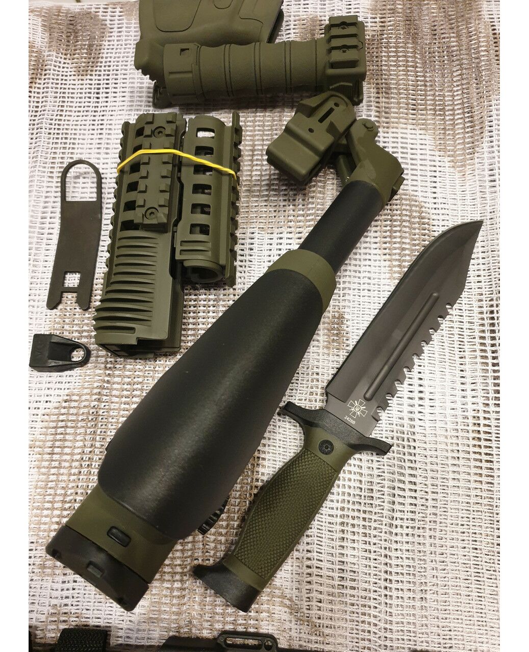 Комплект для апгрейда оружия от официального производителя аксессуаров для стрелкового оружия, фирмы Kral Arms Tactical.Набор состоит из следующих компонентов: скландой телескопический приклад с регулируемой щекой, цевье; накладка на газовую трубку; пистолетная рукоять; ручка переноски огня с интегрированными сошками, антабка, тромикс и боевой нож с тактическими ножнами. Доступный в оливковом цвете. Все монтажные саморезы в комплекте. Подходит на АК74. Идеальная замена штатного "весла" и цевья с накладкой на газовую трубку. Не люфтит, качественный пластик.Обвес изготовлен из термостойкого высококачественного армированного полимера.