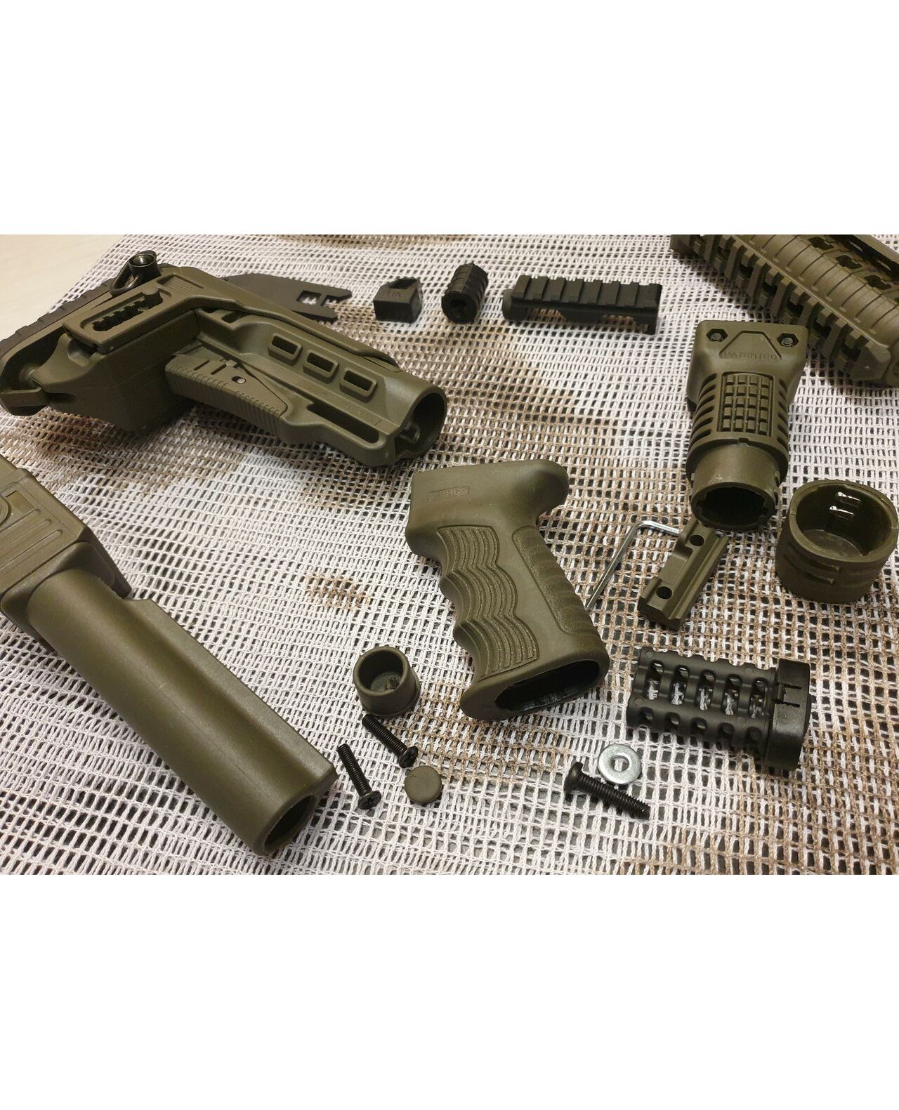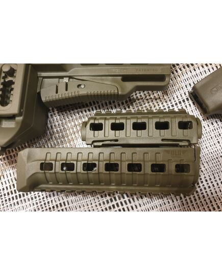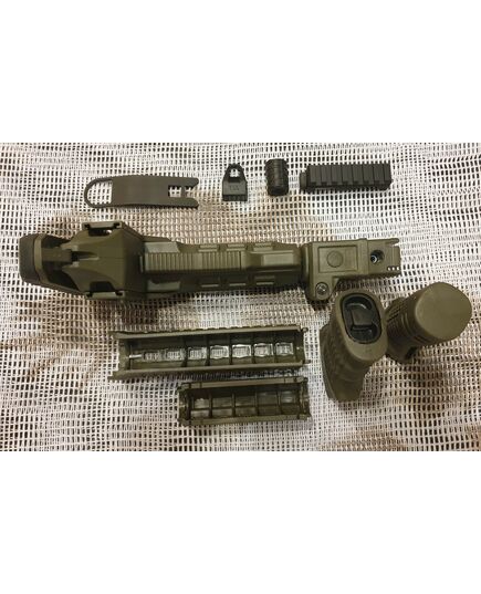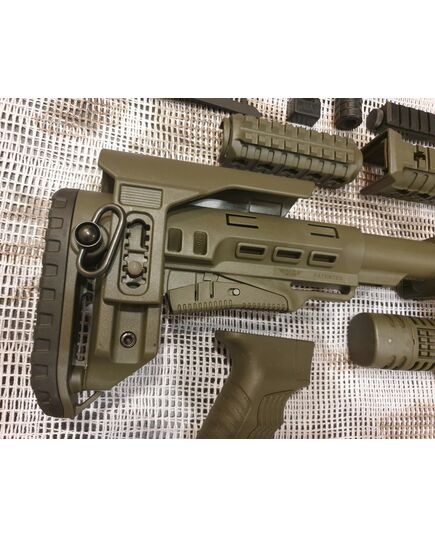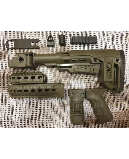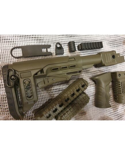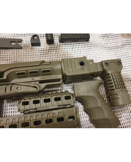 Комплект для апгрейда оружия от официального производителя аксессуаров для стрелкового оружия, фирмы DLG Tactical.Набор состоит из следующих компонентов: цевье; накладка на газовую трубку; прорезининая пистолетная рукоять; ручка переноски огня ; антабка; планка на целик для установки коллиматорных прицелов; тромикс на затвор; буфер отдачи; стальная антабка для складного приклада; складной в левую сторону телескопический приклад с регулируемой щекой. Доступный в оливковом цвете. Все монтажные саморезы в комплекте. Подходит на АК74. Идеальная замена штатного "весла" и цевья с накладкой на газовую трубку. На прикладе установлена быстросъемная антабка. Не люфтит, качественный термо пластик. Обвес изготовлен из термостойкого высококачественного армированного полимера.Не люфтит, легко устанавливается.