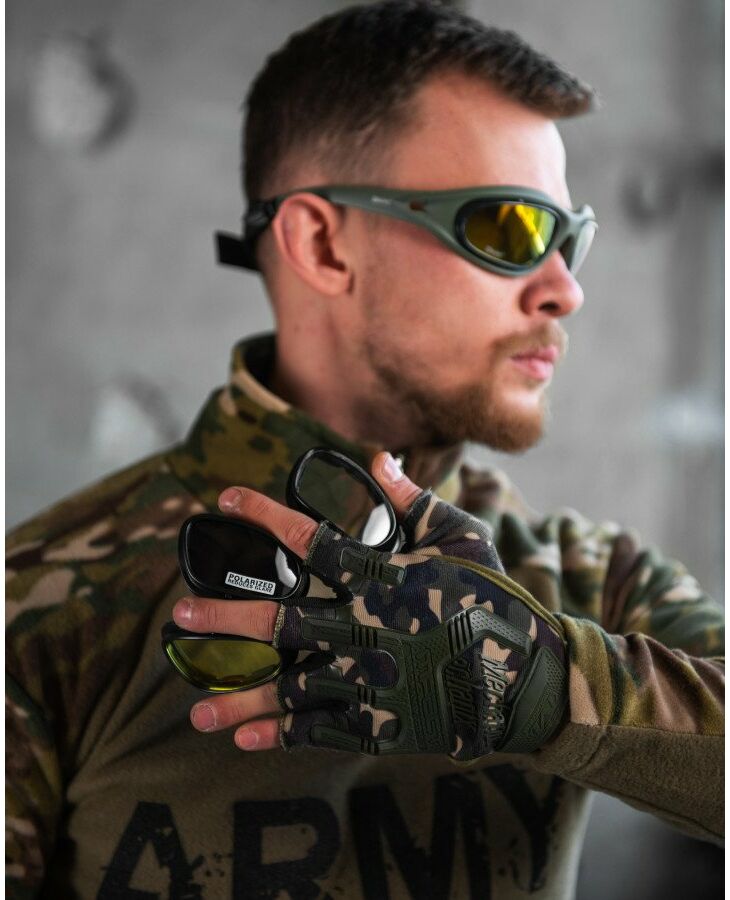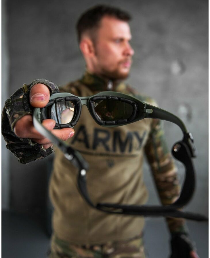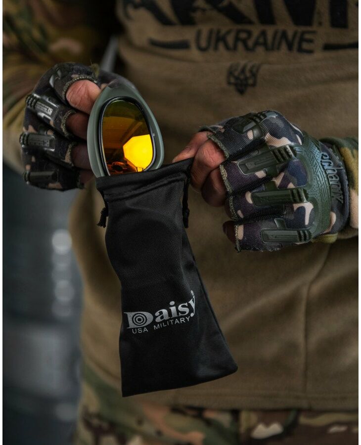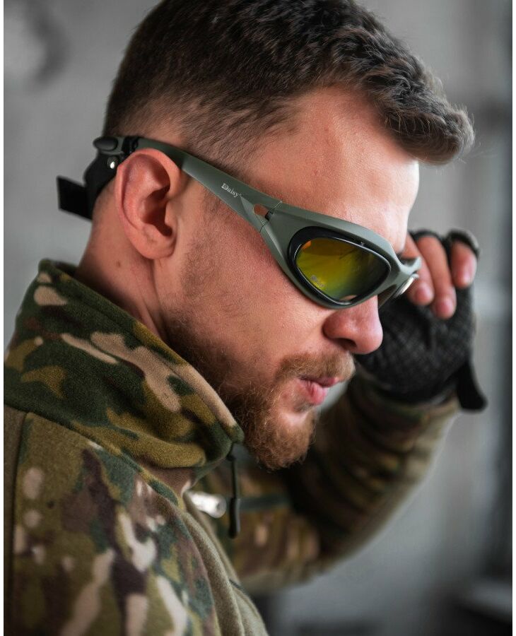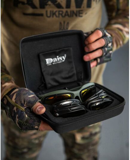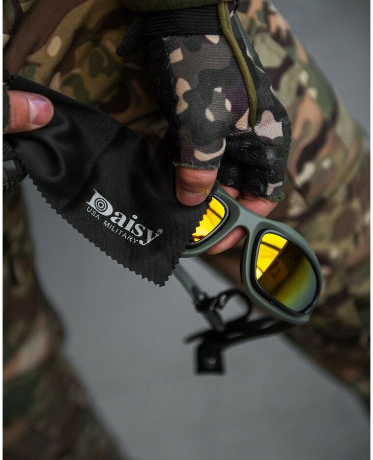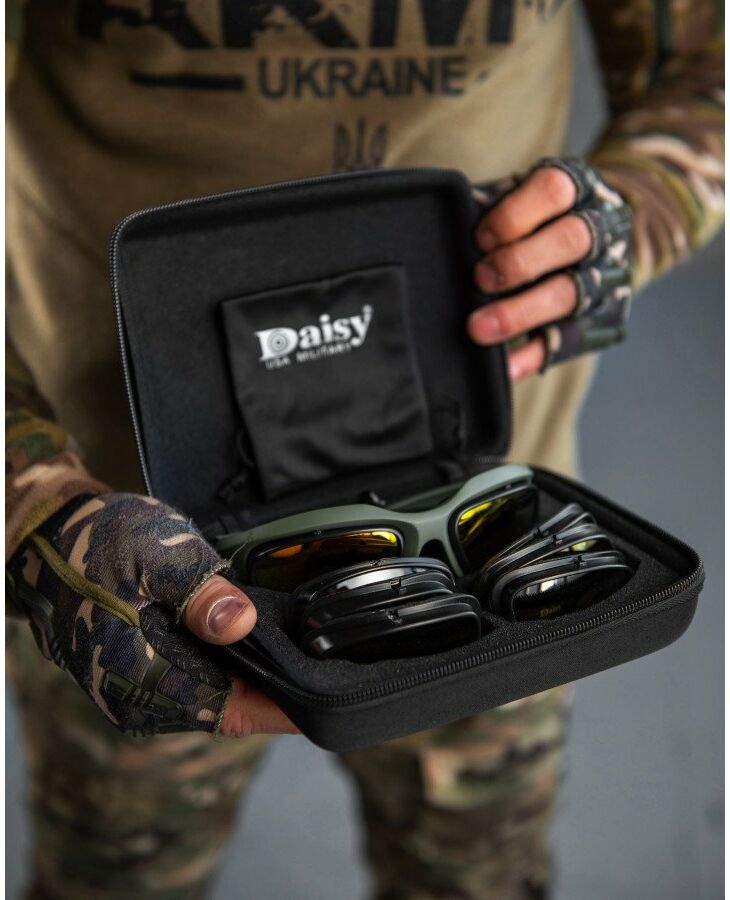 Тактичні очки зі змінними лінзами від компанії Daisy. Комфортно сидять на обличчі. У комплекті йде 4 змінні лінзи. Забезпечують надійний захист очей від фронтальних та бічних загроз.