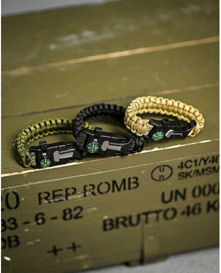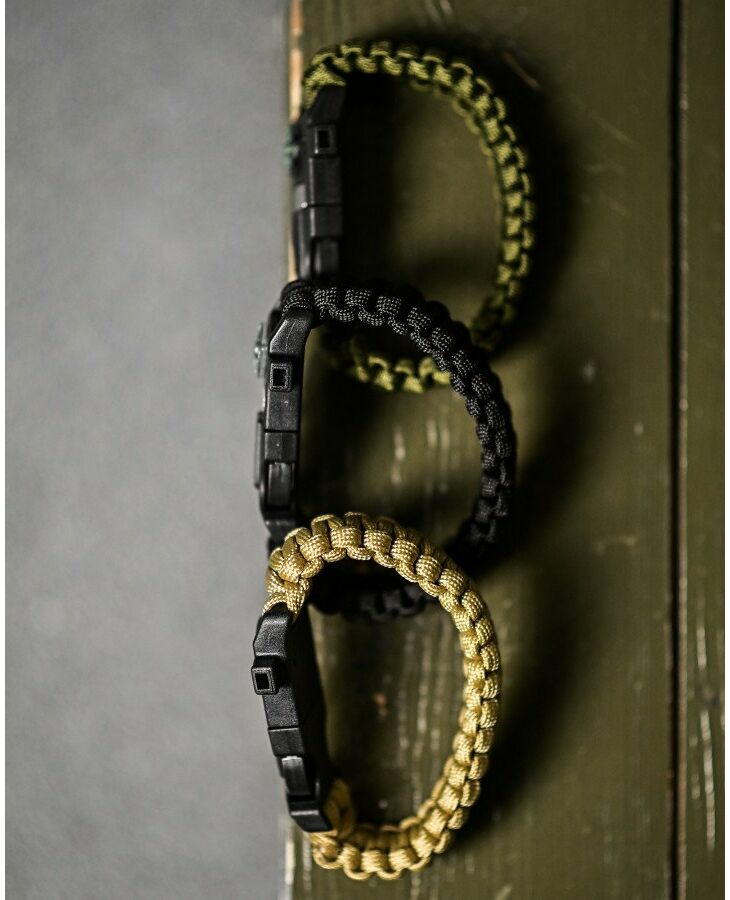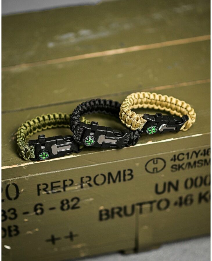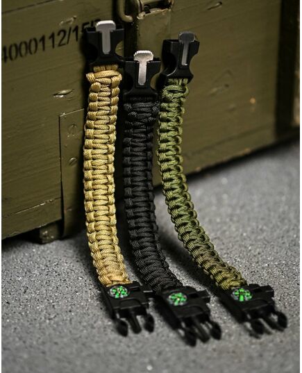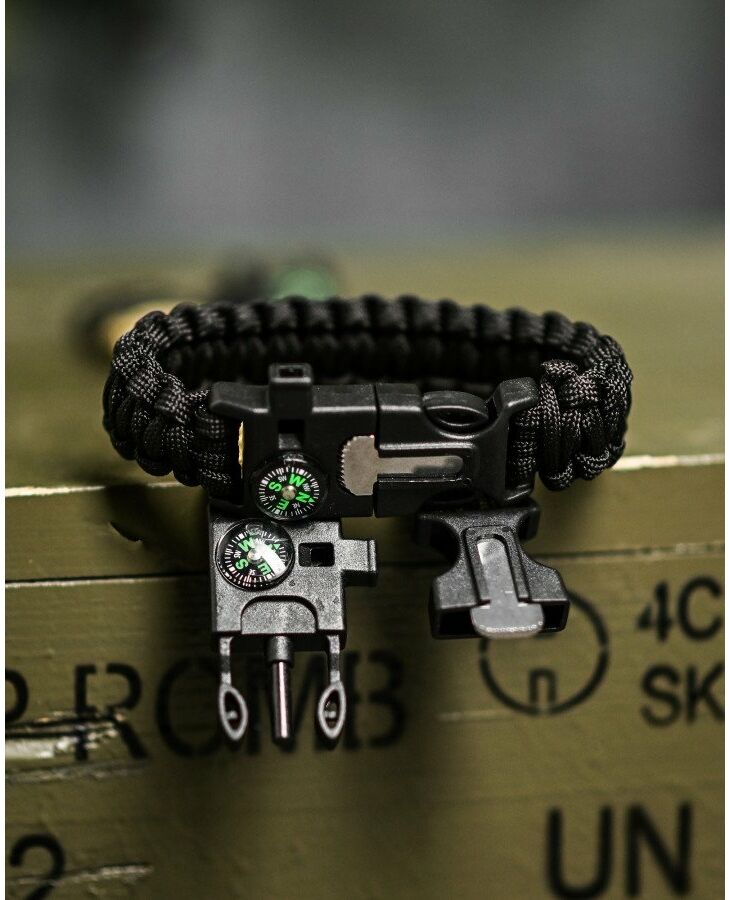Paracord браслет з вискорем, компасом та свисток незамінний у полі. Такий аксесуар популярний у військових, повітряних гравцях, мисливцях та рибалках. Функція створення є наявність довготривалого кавуна, довжина якого в плановому стані вражає 3 метри. Розтягування здатна протистояти до 200 кілограмів ваги. Браслет на FASTEX - прикладом. Компас допоможе визначити сторони світу, вогню - вирізати іскри для розведення вогонь, а свисток повинен використовувати звуковий сигнал.