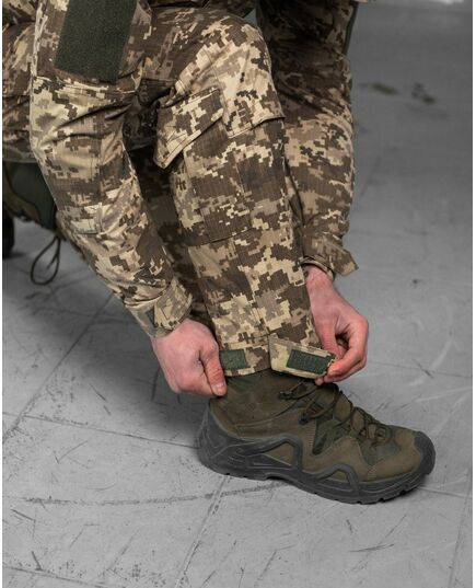 Вставной (ГОСТ) полевой костюм ВСУ на высоте ММ-14 (ACU PAT). Комплект состоит из кабеля (летнего куртка) и тактических штанов. Изготовлен из саржевой ткани (65% хлопка, 35% полиэстер) гладкой структуры. В зависимости от контракта и года производства, ткань может иметь незначительные отличия в оттенках и составе.