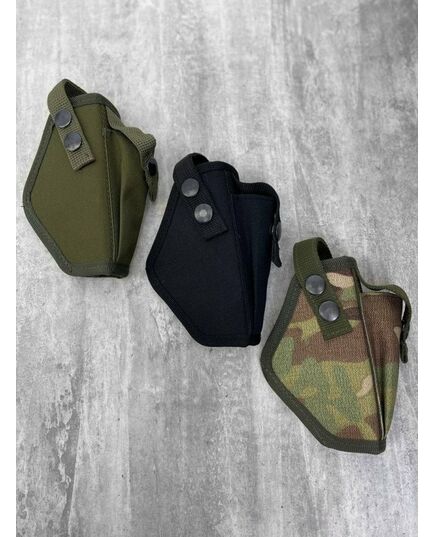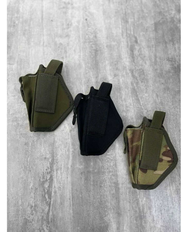Кобура тактическая поясная на системе Молли закрепляется регулируемым ремешком с кнопкой и липучкой поверх кнопки. Также поясная кобура имеет отделение для запасной обоймы. Тактическая кобура закрепляется на ремне, максимальная ширина которого составляет 5 см