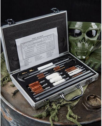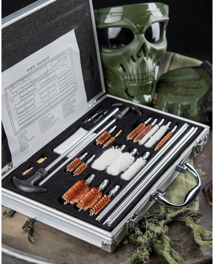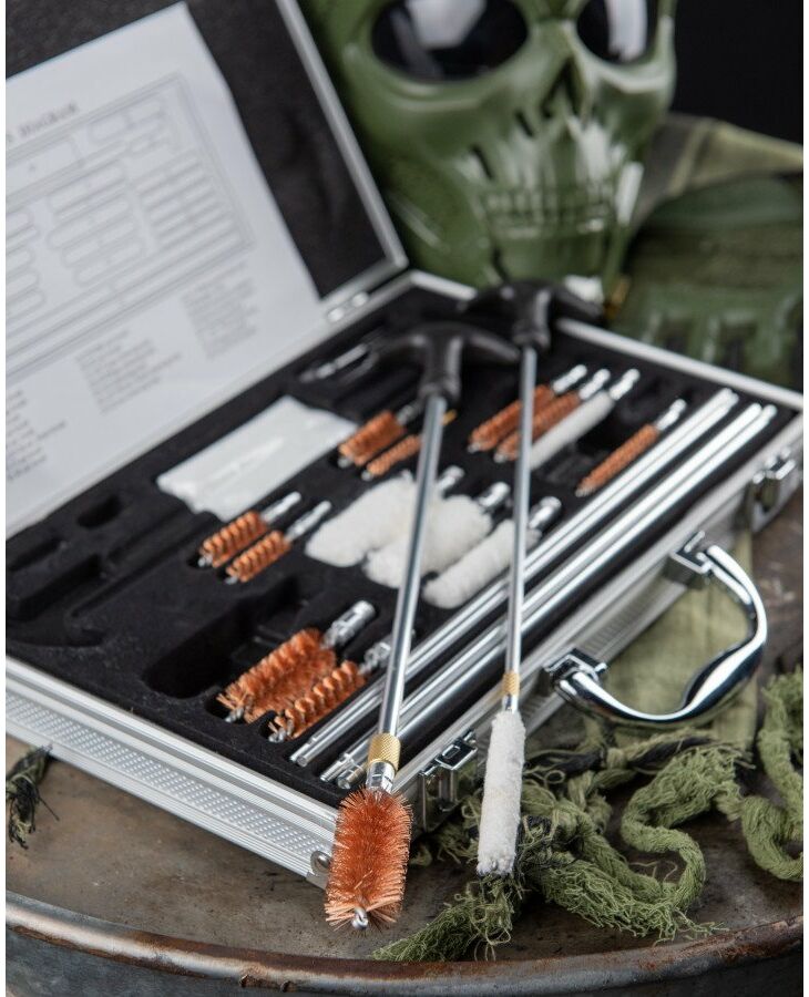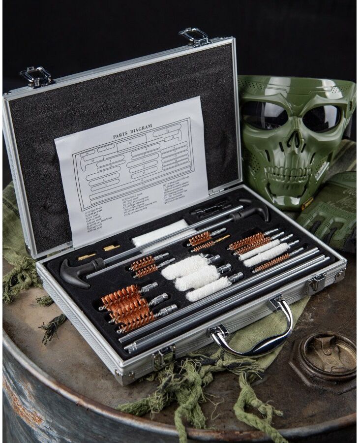 Универсальный набор для чистки оружия, имеющий в своем составе разборные шомпола, медные ершики, шерстяные пуховки и всевозможные переходники для оптимального соединения между собой составных частей и насадок. Набор помещается в небольшом алюминиевом чемоданчике с ручкой и содержит в себе инструменты для чистки оружия таких популярных калибров, как 12-й, 20-й, 7.62 (он же .30 cal.), 9 мм и других. Чтобы купить набор для чистки оружия 5.45 , 12 калибр, 9 мм, .22 и др., сформируйте заявку на нашем сайте.