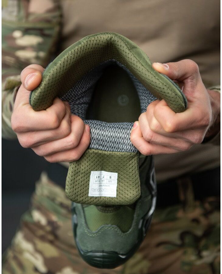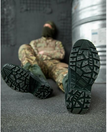 Ботинки пошиты из замши цвета ″койот″ и нейлоновой кордуры. Причем, крой настолько продуман и совершенен, что никаких сомнений в прочности и долговечности модели просто не возникает. Дышащая мембрана Gore-Tex® придает отличные водонепроницаемые свойства ботинкам, она же прекрасно удаляет излишки влажных испарений от ноги. Съемная анатомическая стелька, которая активно впитывает влагу и обладает прекрасными антибактериальными свойствами, исключает негативные последствия долгого пребывания в обуви. Охотники очень ценят наплыв подошвы на носок, что позволяет комфортно вести огонь, стоя на одном колене.