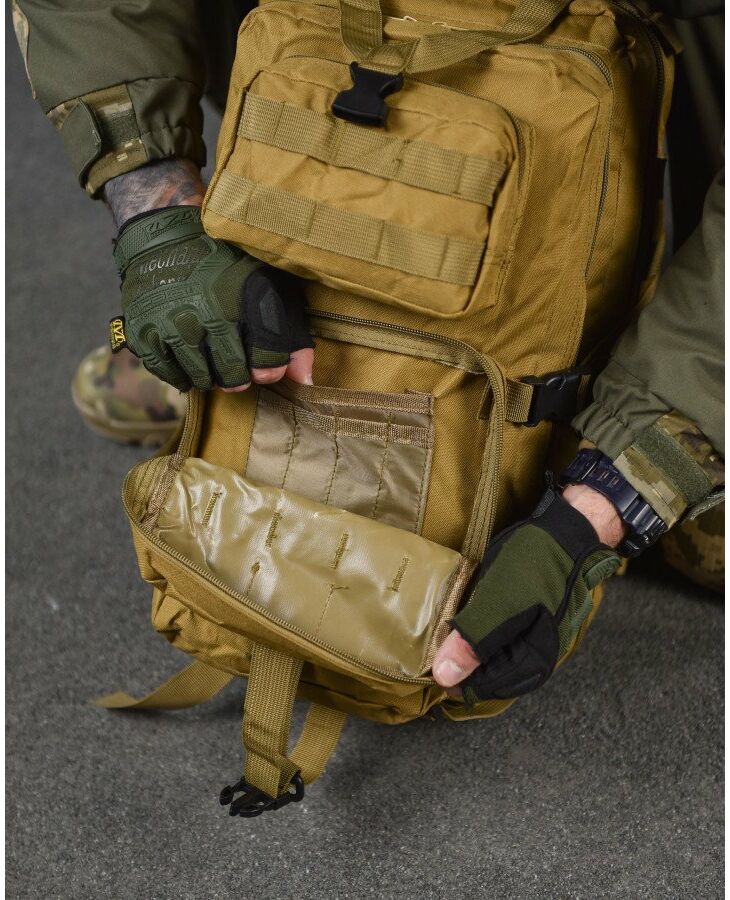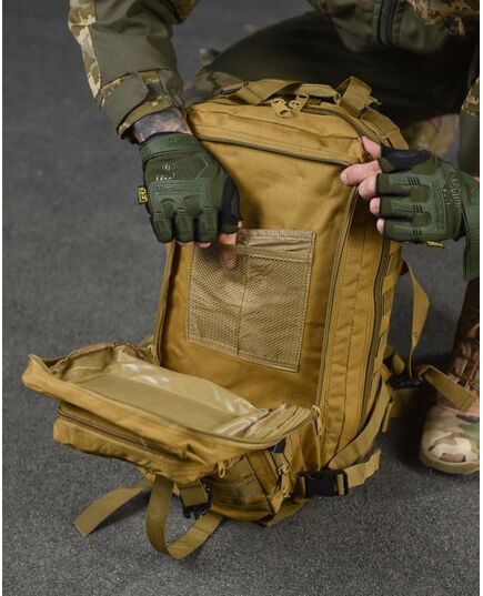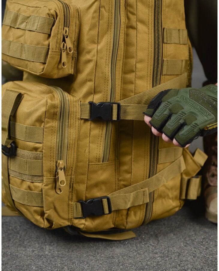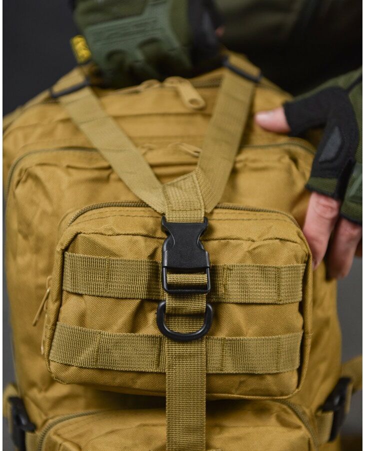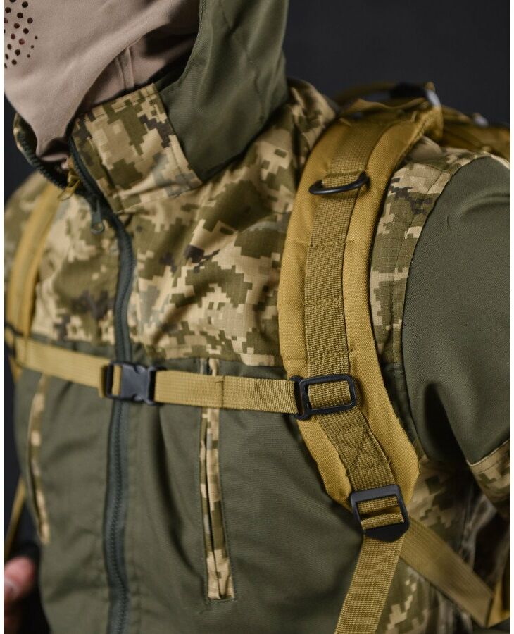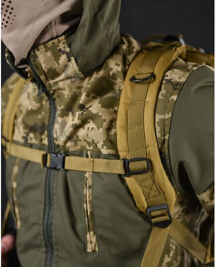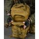 - Система быстрого отсоединения рюкзака - рюкзак имеет несущую систему, которая состоит из профилированных подтяжек с быстросъемными пряжками, это практичное решение и используется для мгновенного сброса рюкзака. За стабильную переносимость отвечает плавная регулировка профилированных подтяжек, нагрудный ремень и поясной ремень, который можно отсоединить - пояс позволяет снять нагрузку с позвоночника и плеч при ношении рюкзака – весь вес сосредоточен на бедрах. На передней части рюкзака и на нагруднике используются лямки PALS, которые позволяют закрепить опору в системе MOLLE - это позволяет устанавливать дополнительные карманы.