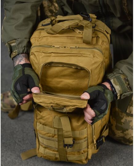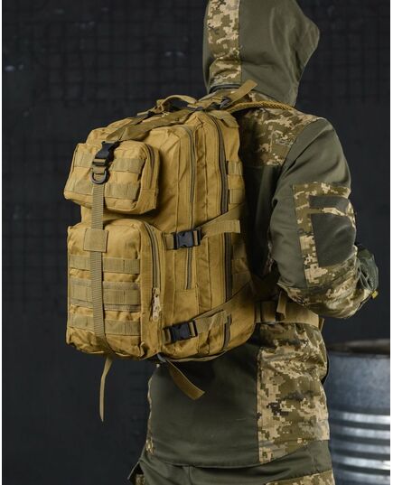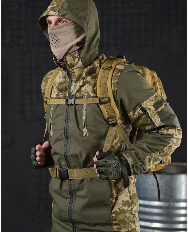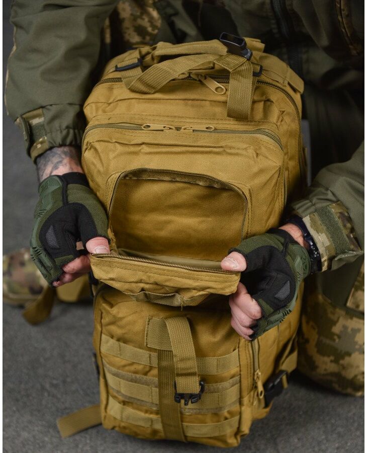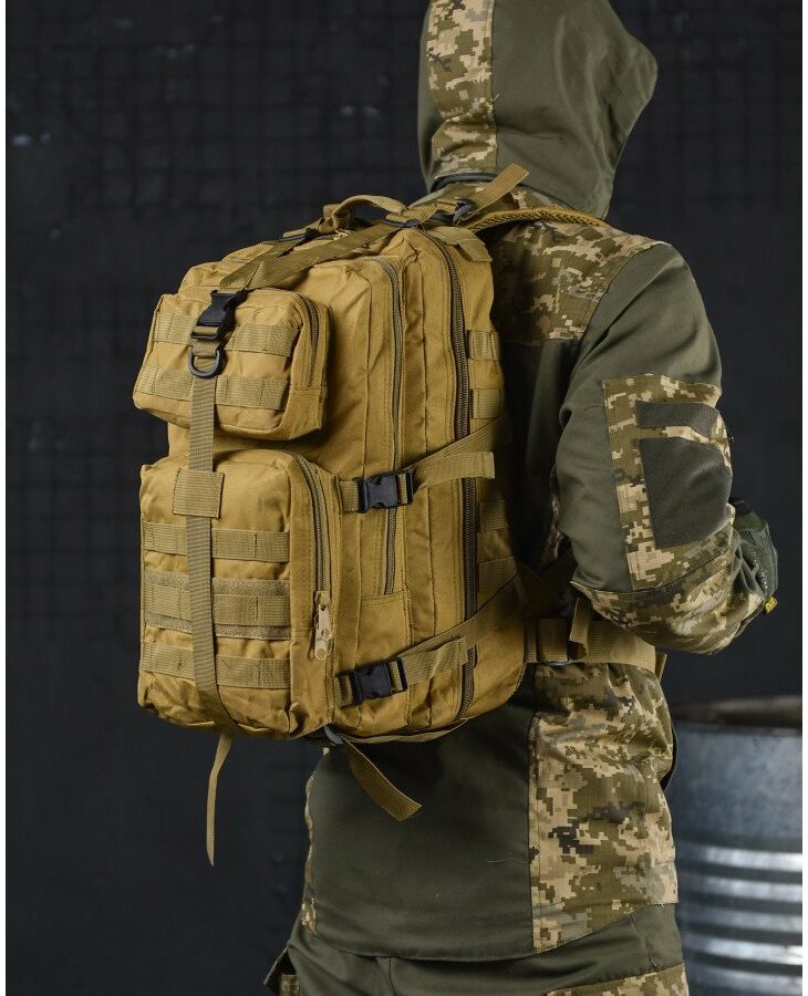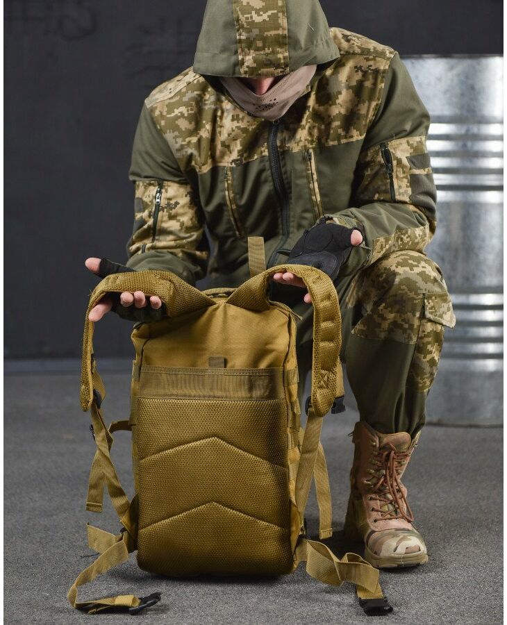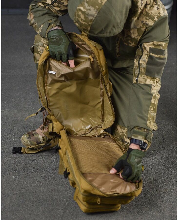 - Система быстрого отсоединения рюкзака - рюкзак имеет несущую систему, которая состоит из профилированных подтяжек с быстросъемными пряжками, это практичное решение и используется для мгновенного сброса рюкзака. За стабильную переносимость отвечает плавная регулировка профилированных подтяжек, нагрудный ремень и поясной ремень, который можно отсоединить - пояс позволяет снять нагрузку с позвоночника и плеч при ношении рюкзака – весь вес сосредоточен на бедрах. На передней части рюкзака и на нагруднике используются лямки PALS, которые позволяют закрепить опору в системе MOLLE - это позволяет устанавливать дополнительные карманы.