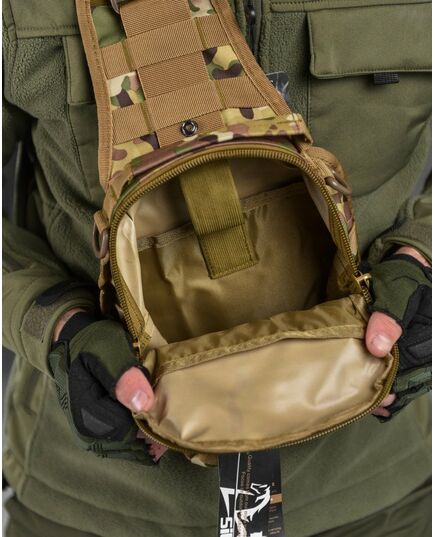 Тактический рюкзак носят с помощью короткой эргономичной ручки, через плечо, а также на спине. Наличие полуавтоматической застежки (фастекса) позволяет максимально быстро отсоединить рюкзак от основной лямки в случае необходимости. В тактическом рюкзаке есть вместительное основное отделение, объемный фронтальный карман, большой задний карман, прилегающий к стенке рюкзака. Задний карман можно использовать под питьевую систему. На фронтальном кармане расположен внешний карман на молнии. В основном отделении находится внутренний карман. На передней части рюкзака есть также эластичная петля для фиксации и переноски того или иного элемента снаряжения.
