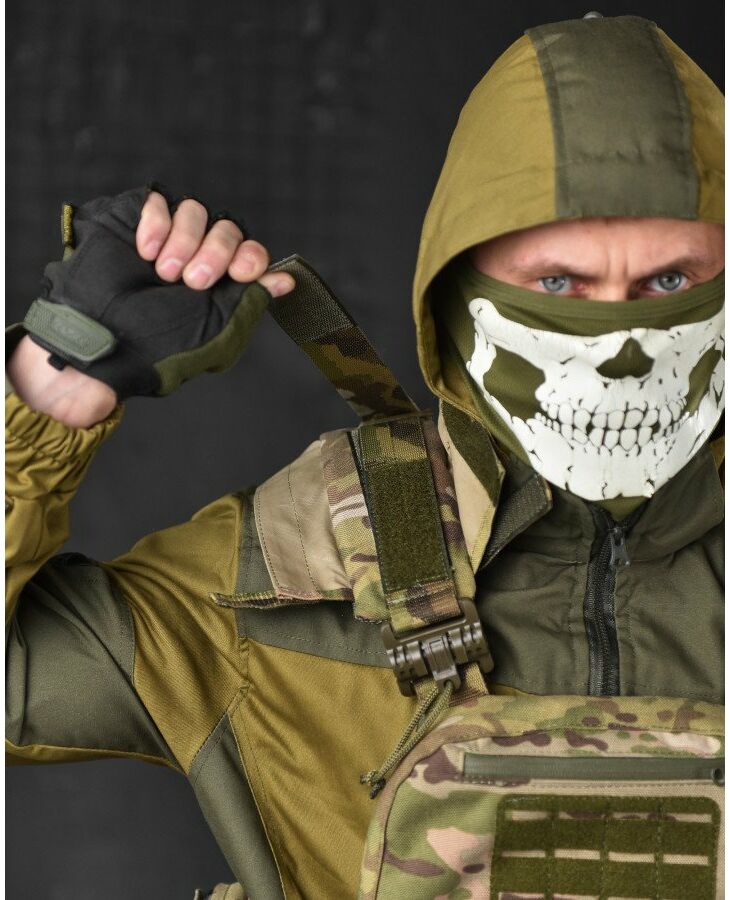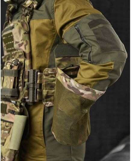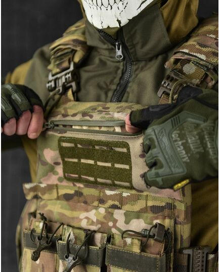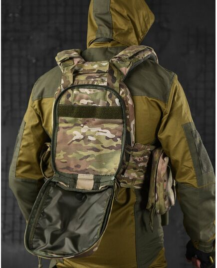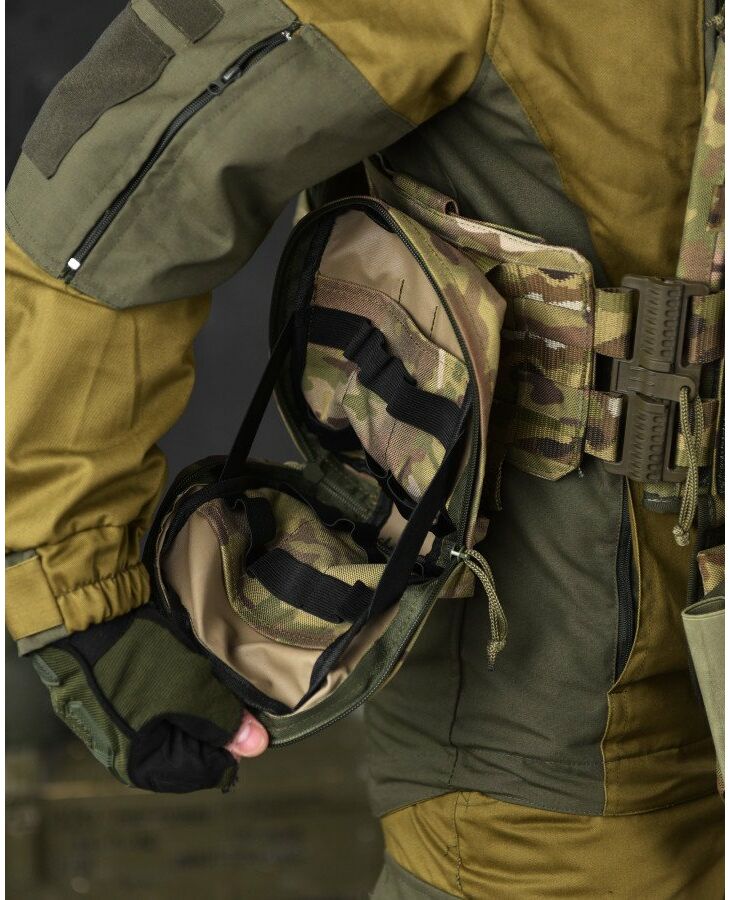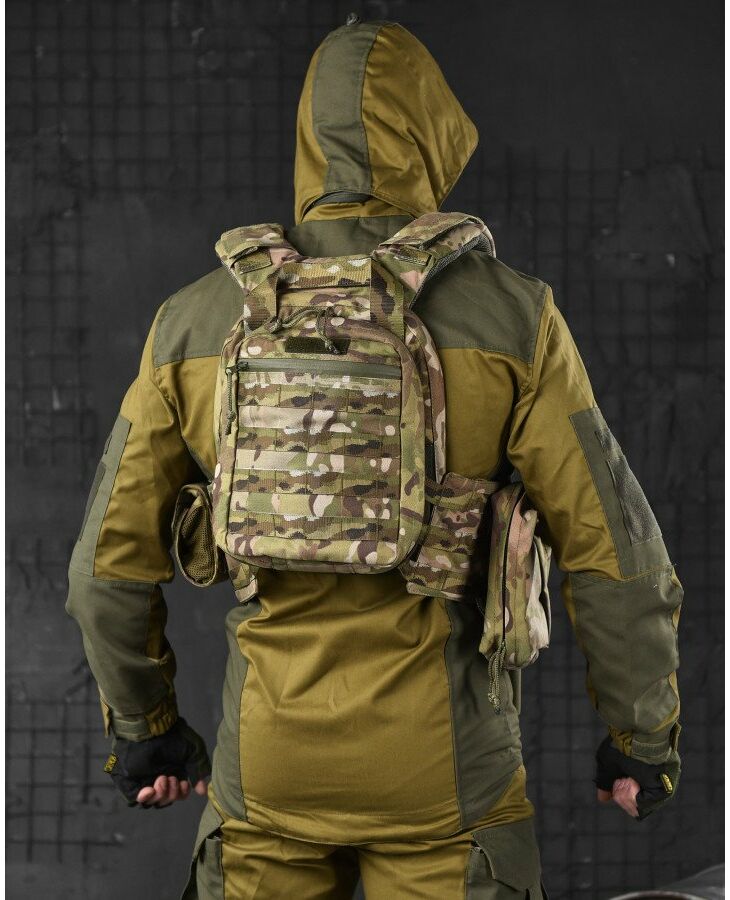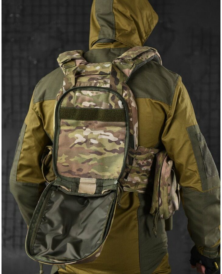 Крепление – по всему периметру (перед, боковины, зад) есть возможность закрепления подсумков  с системой Molle + дополнительные липучки.