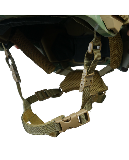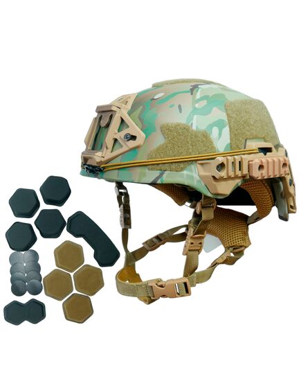 Шлем имеет все необходимые усиленные крепления: для прибора ночного видения, боковых рельсов для фонаря, камер и других аксессуаров. Велкро-панели для крепления кавера или размещения непосредственно на шлеме идентификационных патчей, инфракрасных маячков, стробоскопов и т.п.
