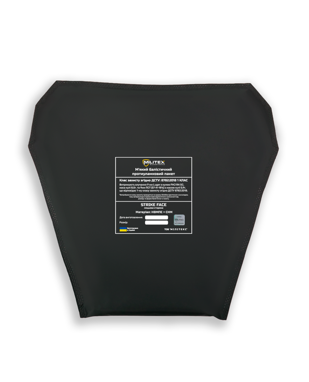 - шаром 9х19 мм Luger (скорость 401±1 м/c) в цельнометаллической оболочке из медного сплава с носовой частью полусферической формы с мягким (свинцовым) сердечником в соответствии с требованиями п. 6.1.2. (при нормальных условиях эксплуатации), п. 7.1. 1, табл. 1 ДСТУ 8782:2018 Средства индивидуальной защиты. Бронежилеты.”, относительно 1 класса защиты; максимальная глубина внепрепятственной деформации – 20,0 мм.