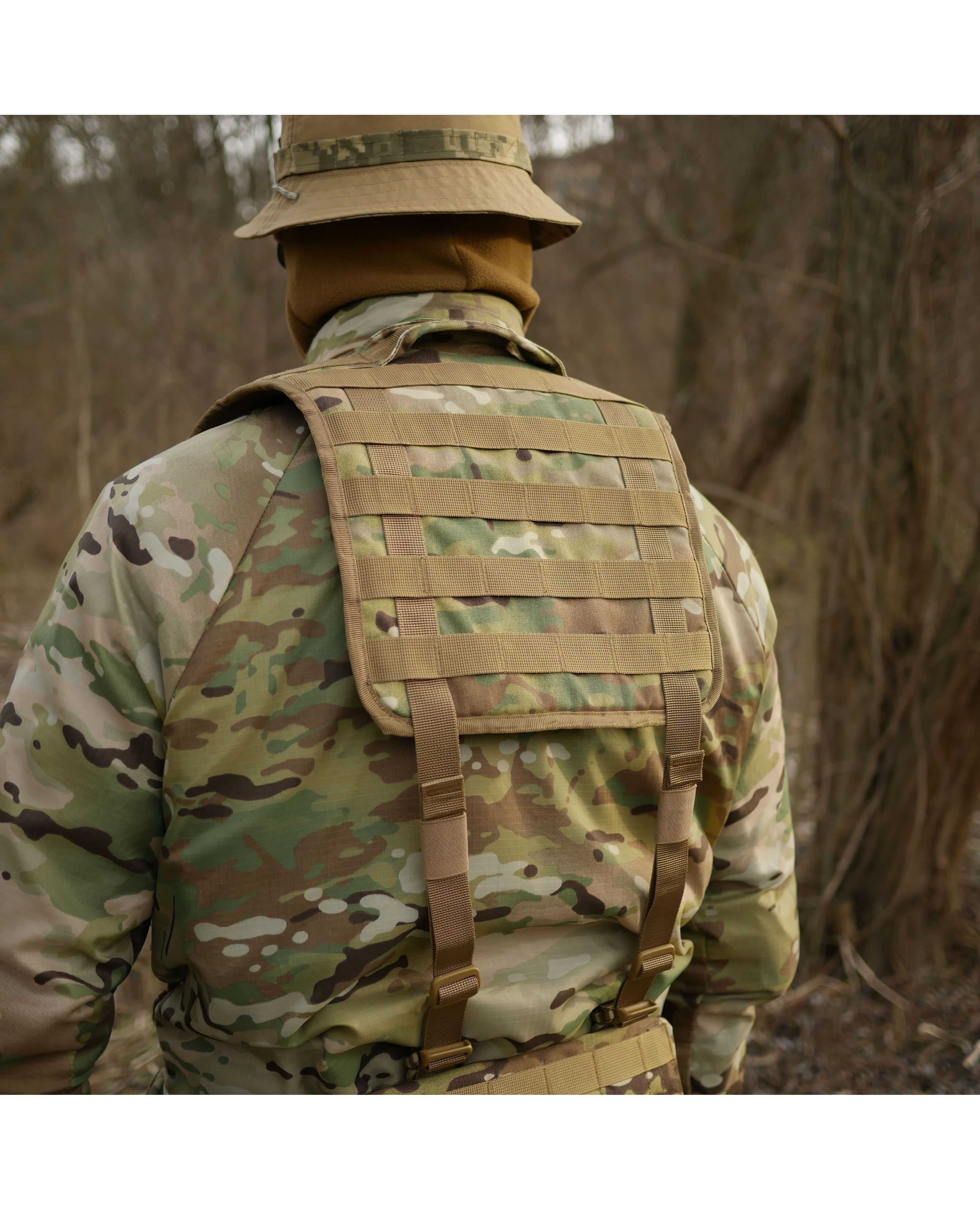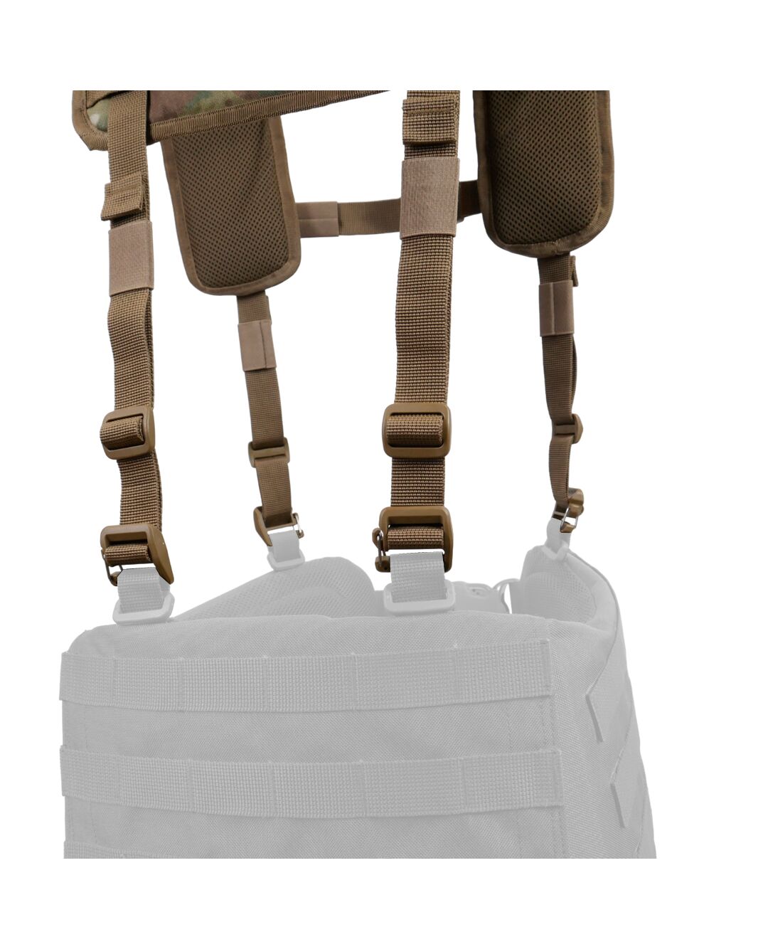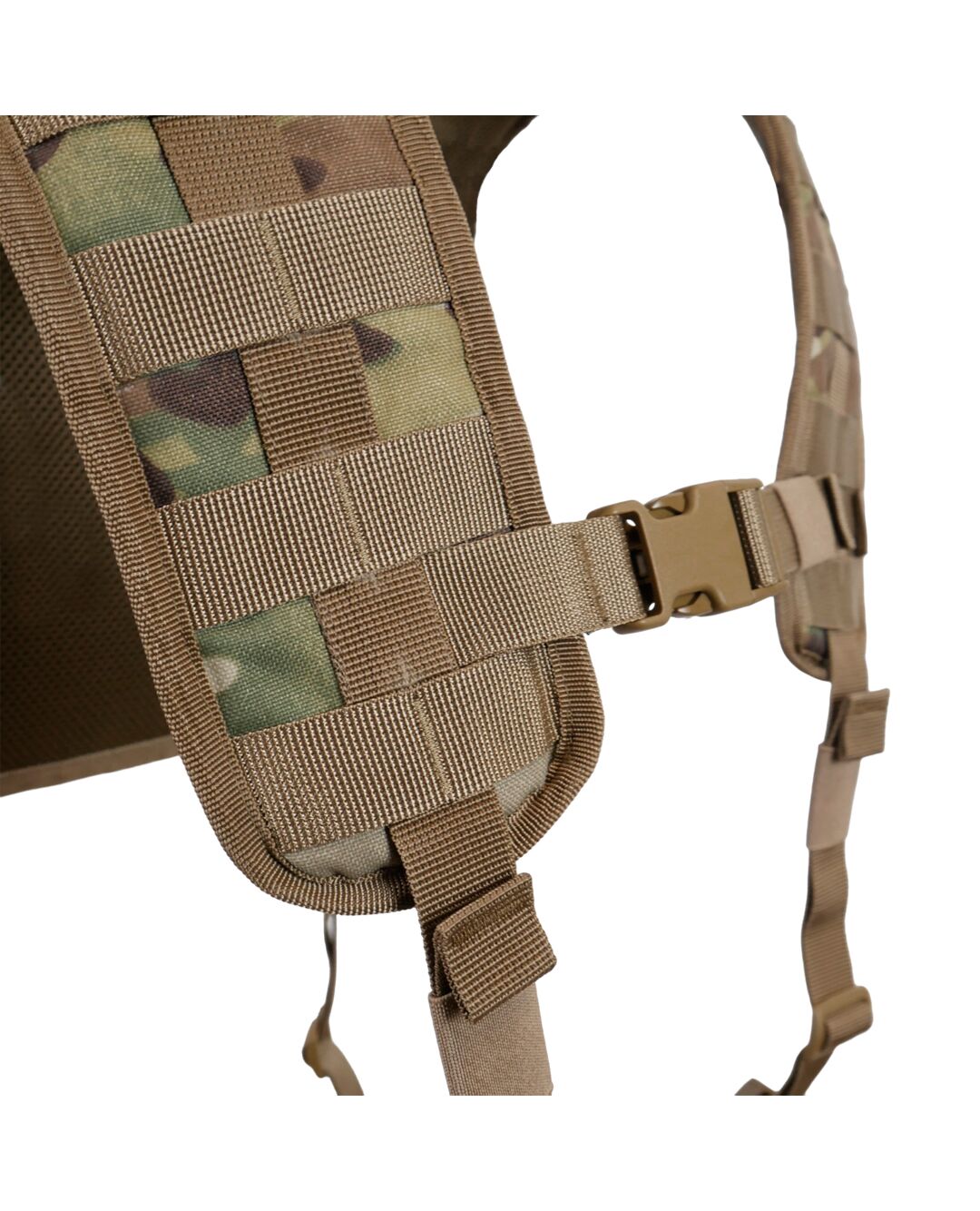 Конструкция. Плечевые лямки имеют рюкзачную конструкцию с системой MOLLE на спине для закрепления дополнительного снаряжения. Обладают внутренним демпферным слоем пены толщиной 5 мм и мягкой 3D сеткой для вентиляции. На лямках предусмотрено 5 рядов MOLLE по спине и по 4 спереди. Нагрудный соединительный ремень позволяет регулировать ширину лямок.