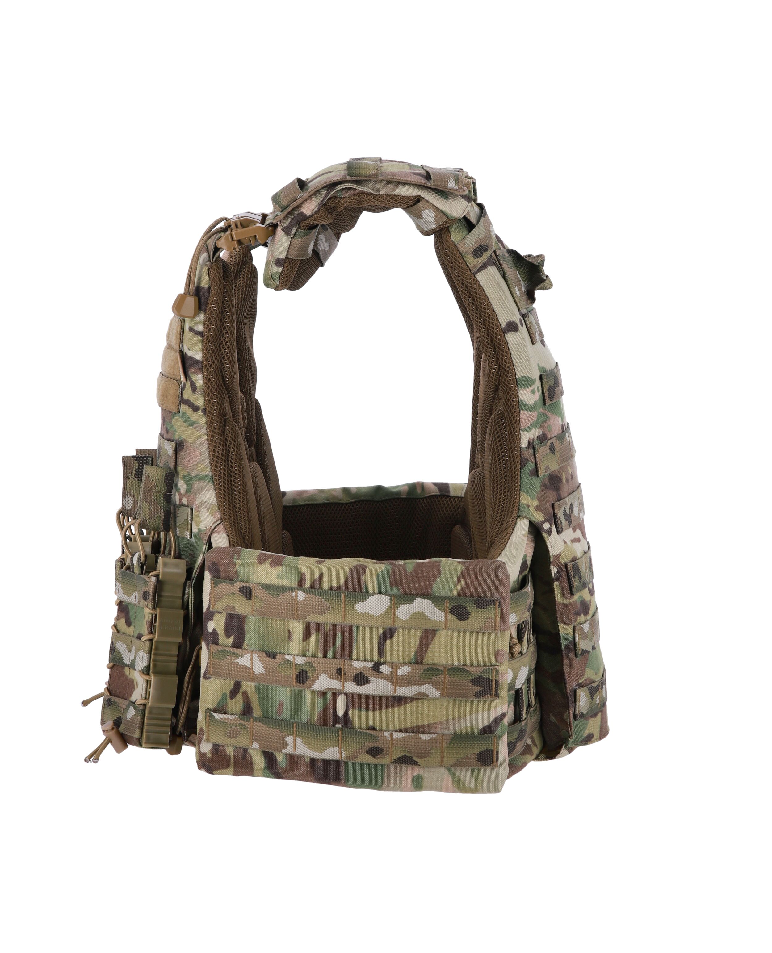 Лямки имеют двойную фиксацию регулировки роста, которая защищена клапаном с дополнительными MOLLE для крепления итогов под рацию или турникет. Также на лямках предусмотрены крепления для защиты шеи и плеч.