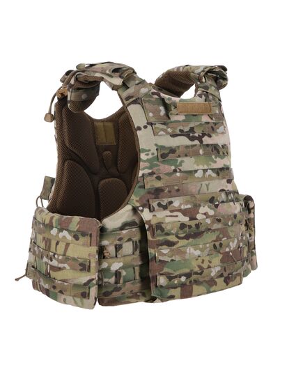 Конструктивно верхние скоросбросы расположены ближе к плечу, благодаря чему освобождаются больше места для приклада. Боковые модули быстрого сброса камербанда частично скрыты под защитную планку. Внутри жилет имеет два отдельных кармана под плиту и баллистический пакет, можно использовать плиты любого размера благодаря удобной регулировке с помощью ремней.
