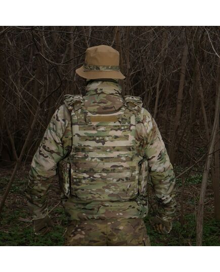 Задняя часть бронежилета также имеет увеличенное количество MOLLE-позиций, для крепления еще большего количества дополнительного снаряжения. Широкая плотная эвакуационная ручка по военным рекомендациям была усилена специальными закрепками и фиксируется к плитоноске на Velcro.