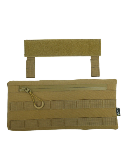 На фронтальной части итога есть два ряда системы molle для крепления дополнительного снаряжения, также для удобства мы добавили карман с прорезиненным бегунком и пулером для размещения в нем карт, документов или мелких личных вещей.