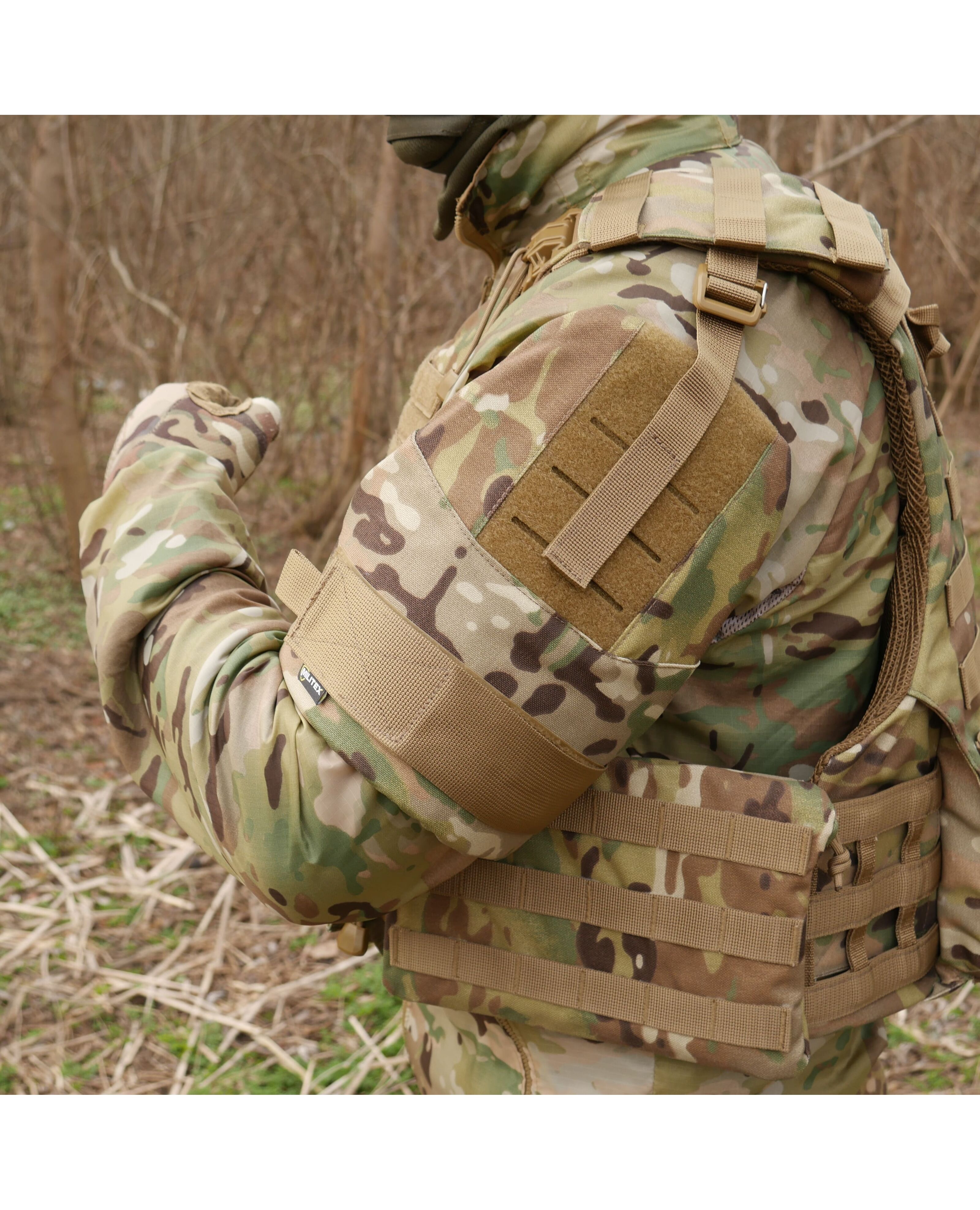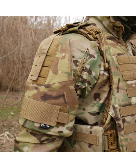 Рекомендуется крепить данный элемент защиты на бронежилет Militex. Плечевая защита крепится к плечевой части плитоноски с помощью велкро панели. Пластиковая рамка с замком от японского производителя WJ в форме D-кольца служит соединительным элементом и помогает при необходимости снять плечевую систему. Особое внимание при разработке плечевой защиты было уделено анатомической форме изделия. Плечо сконструировано таким образом, что высота крепления к плитоноске регулируется благодаря вертикальной стропе с велкролипучкой. Плечевая защита также настраивается по объему руки и фиксируется специальной горизонтальной стропой с перетяжкой 4мм.