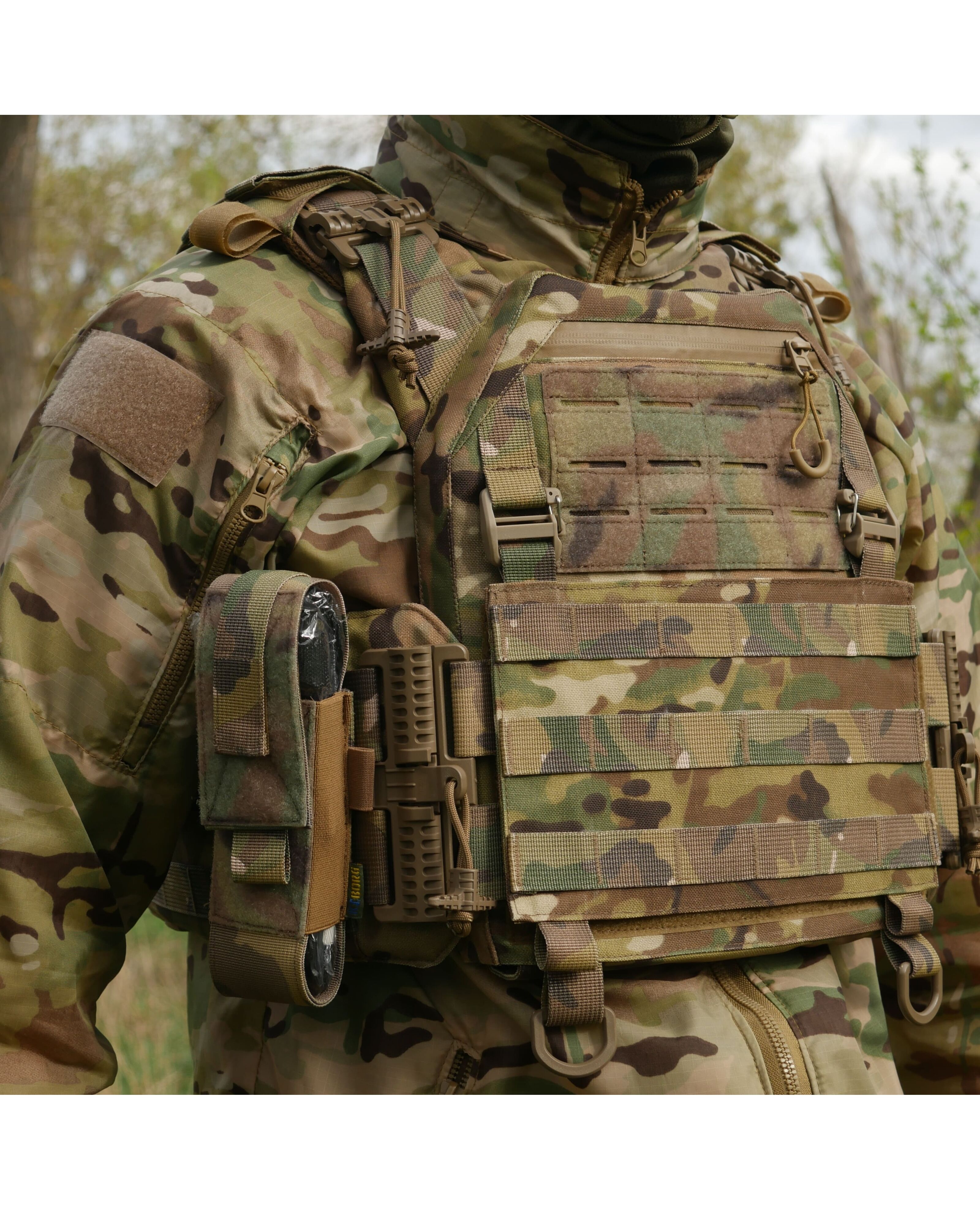 Крепление осуществляется с помощью системы Molle, а также возможность регулировки высоты и глубины с помощью липучек сверху и резинок по бокам. Удобно открывается одной рукой.