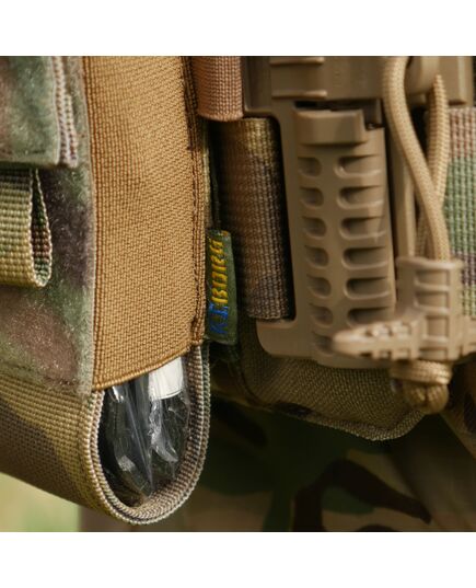 Открытый подсумок, содержащий различные виды турникетов, оснащен отсеком для ножниц, дополнительно закрепляемым стропой, и резинкой со стороны для надежного крепления маркера.