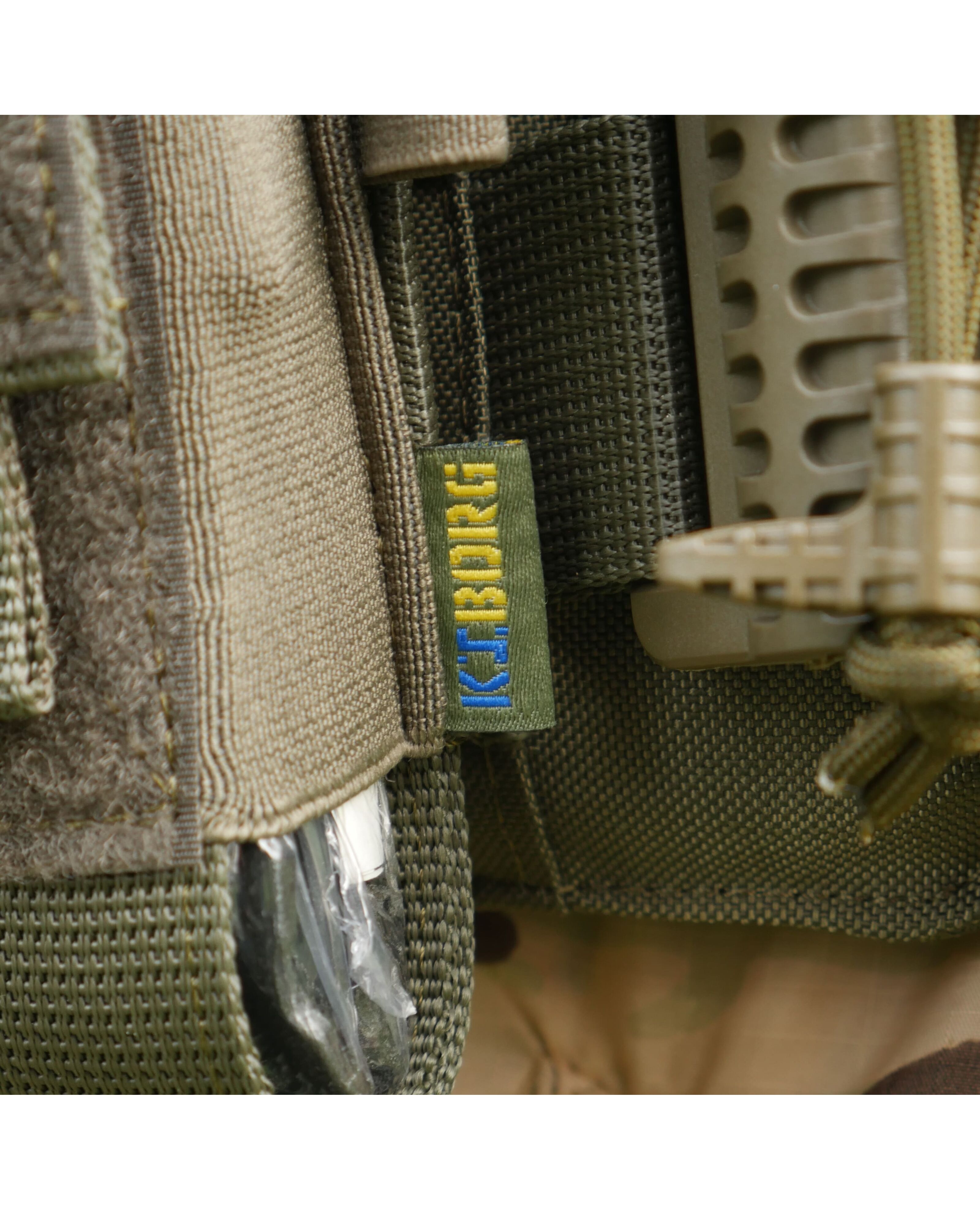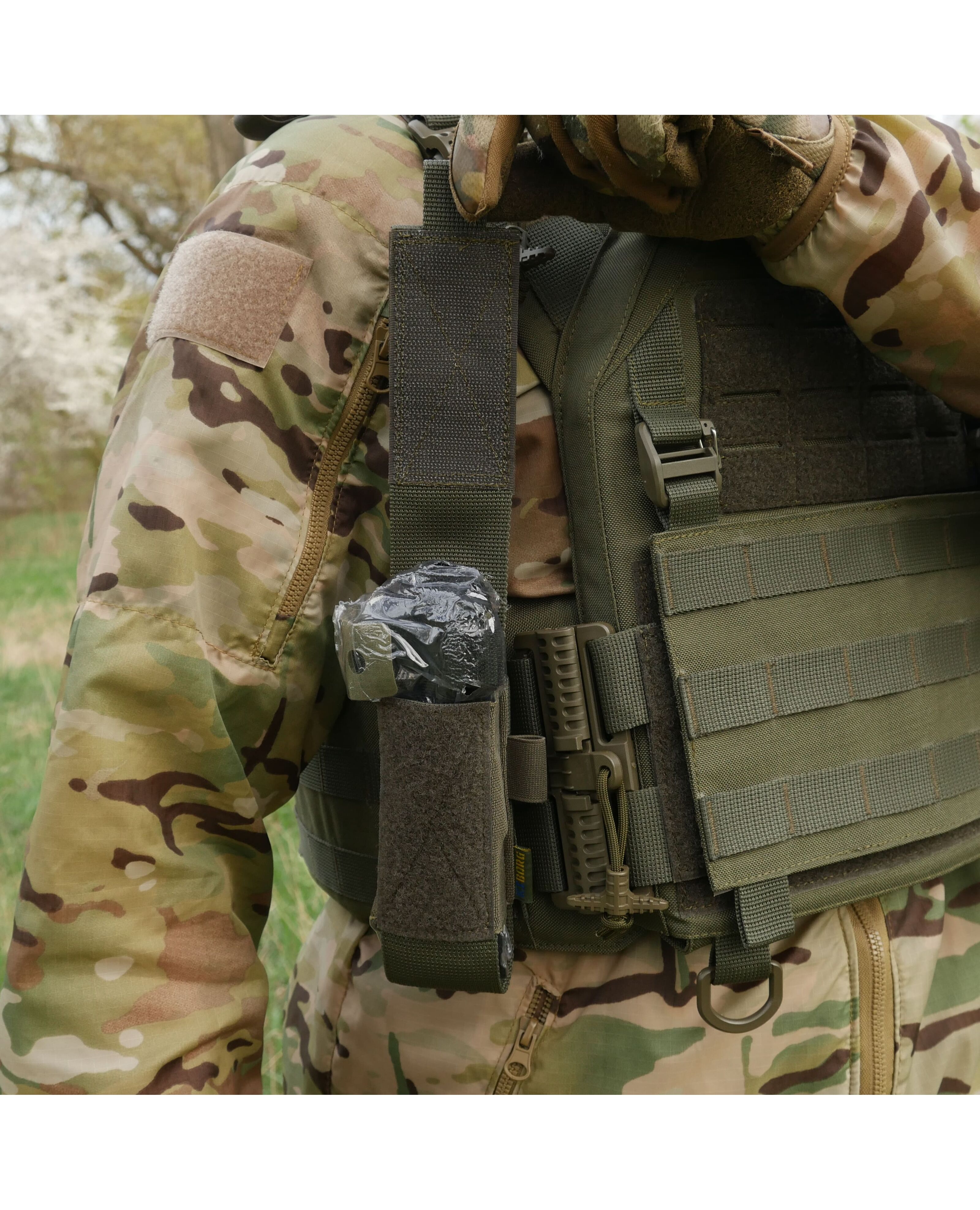 Открытый подсумок, содержащий различные виды турникетов, оснащен отсеком для ножниц, дополнительно закрепляемым стропой, и резинкой со стороны для надежного крепления маркера.