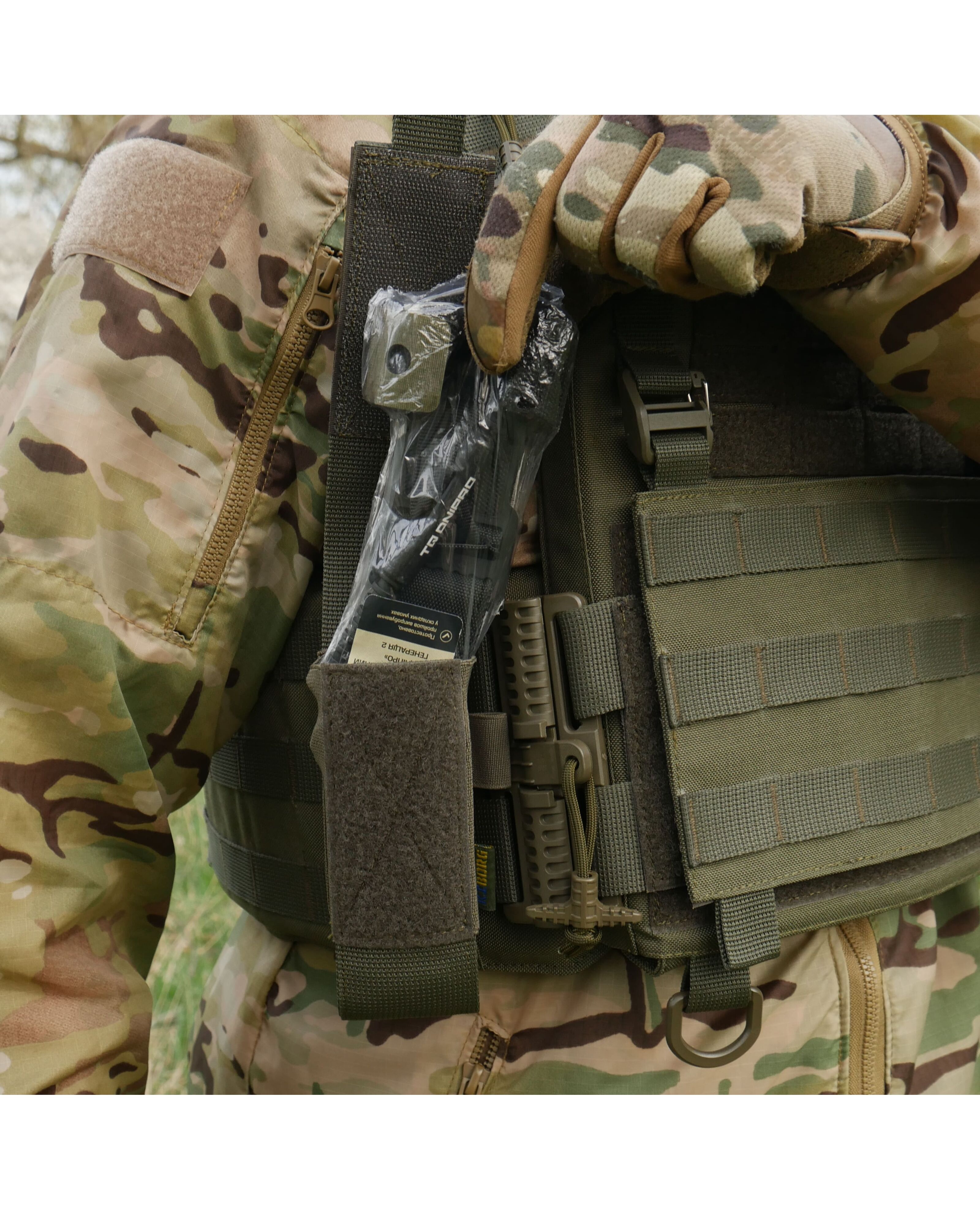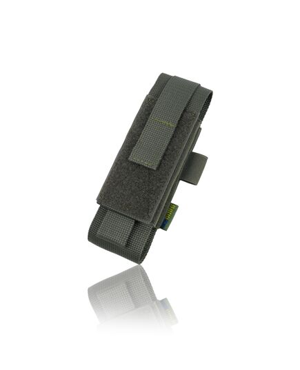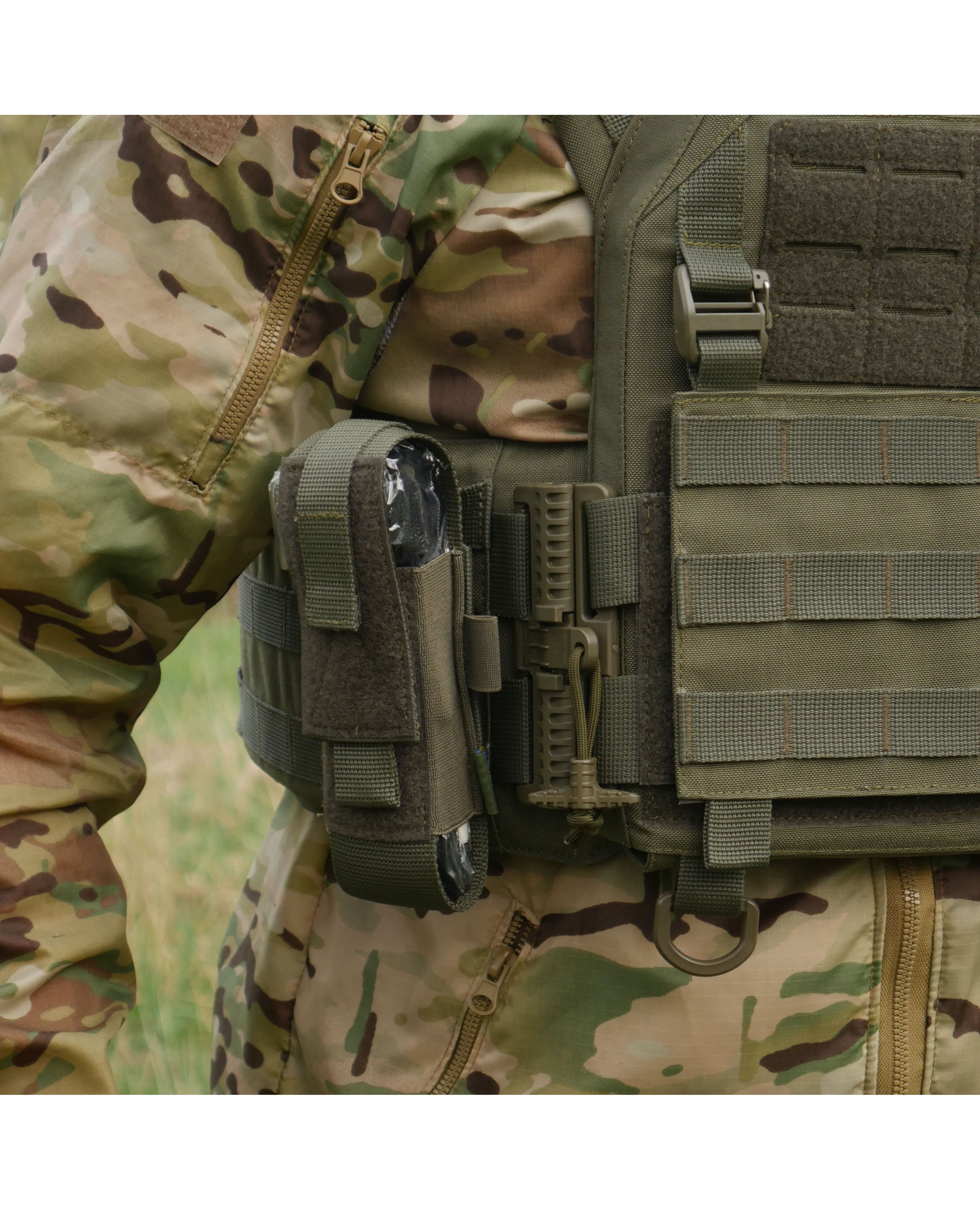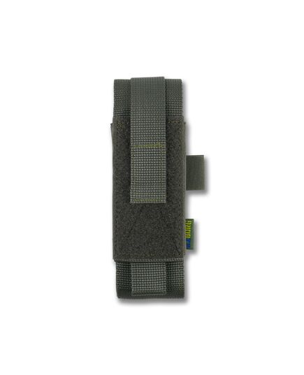 Крепление осуществляется с помощью системы Molle, а также возможность регулировки высоты и глубины с помощью липучек сверху и резинок по бокам. Удобно открывается одной рукой.