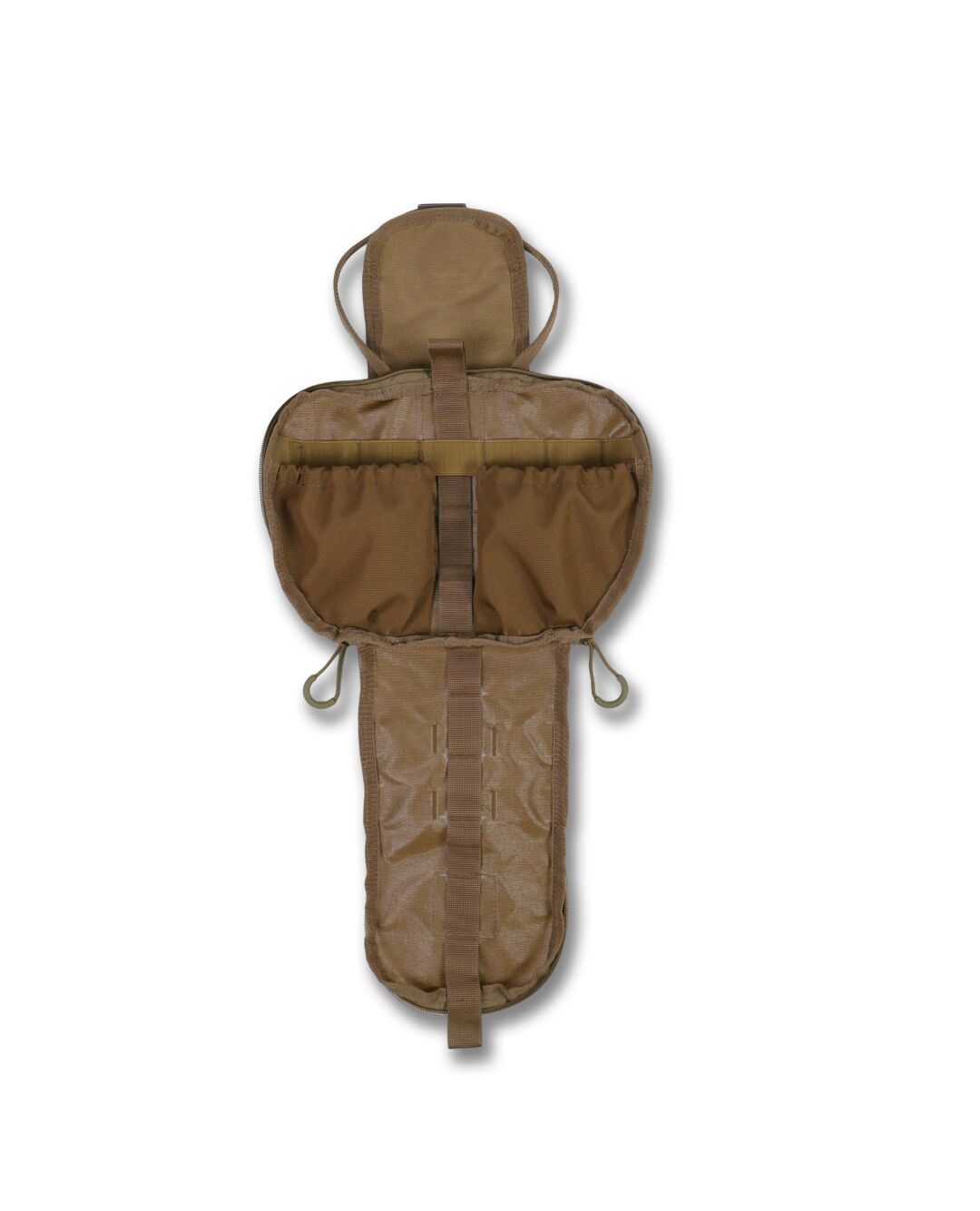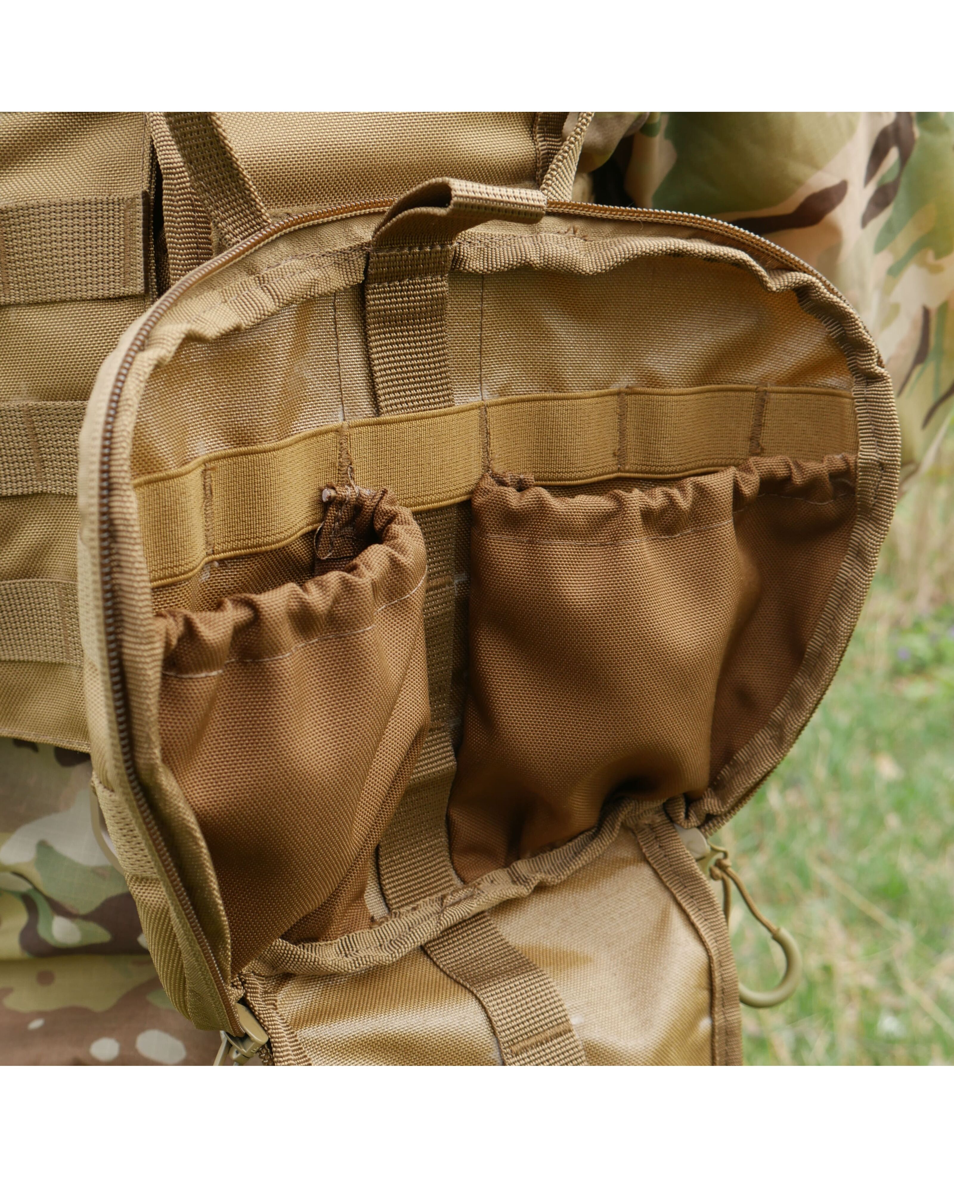 Внутреннее пространство итога сделано в виде органайзера за счет строп Molle, переплетенных резинок и двух карманов, благодаря чему медикаменты и комплектующие аптечки можно удобно и надежно зафиксировать в итоге.