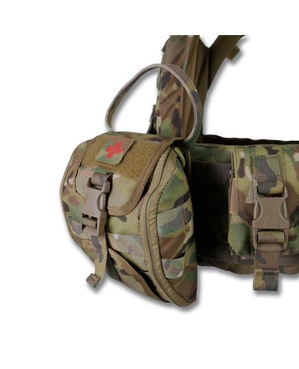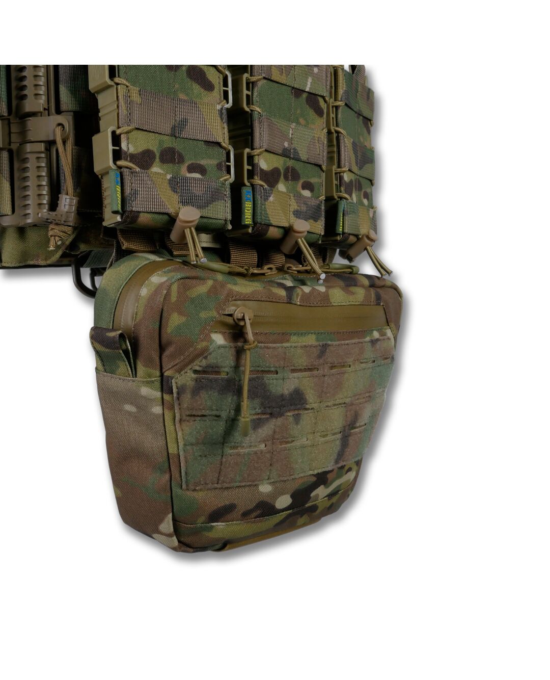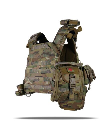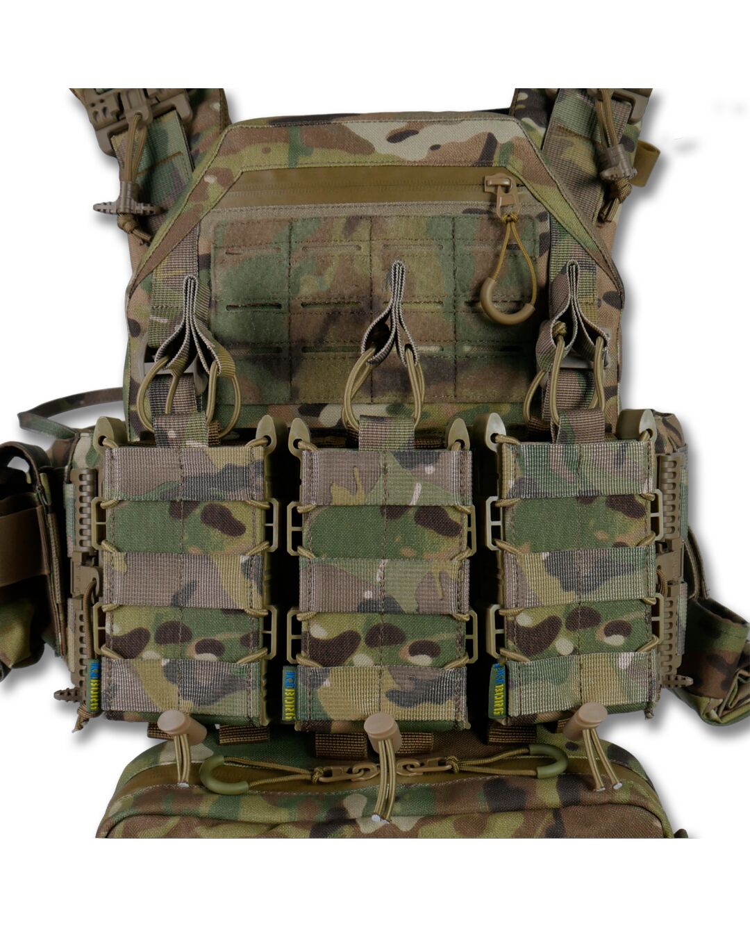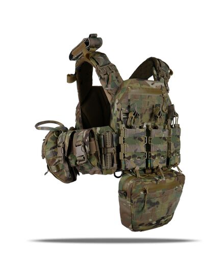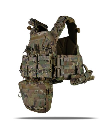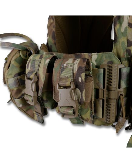 Плитоноска оснащена съемной передней Molle панелью, которая крепится к основанию на Velcro и дополнительно двумя карабинами Woojin. На ней удобно размещаются 3 итога под 1 или два магазина, или другое Molle-совместимое снаряжение. Эту панель можно быстро заменить другой с закрёклым на нее заранее набором нужных итогов.