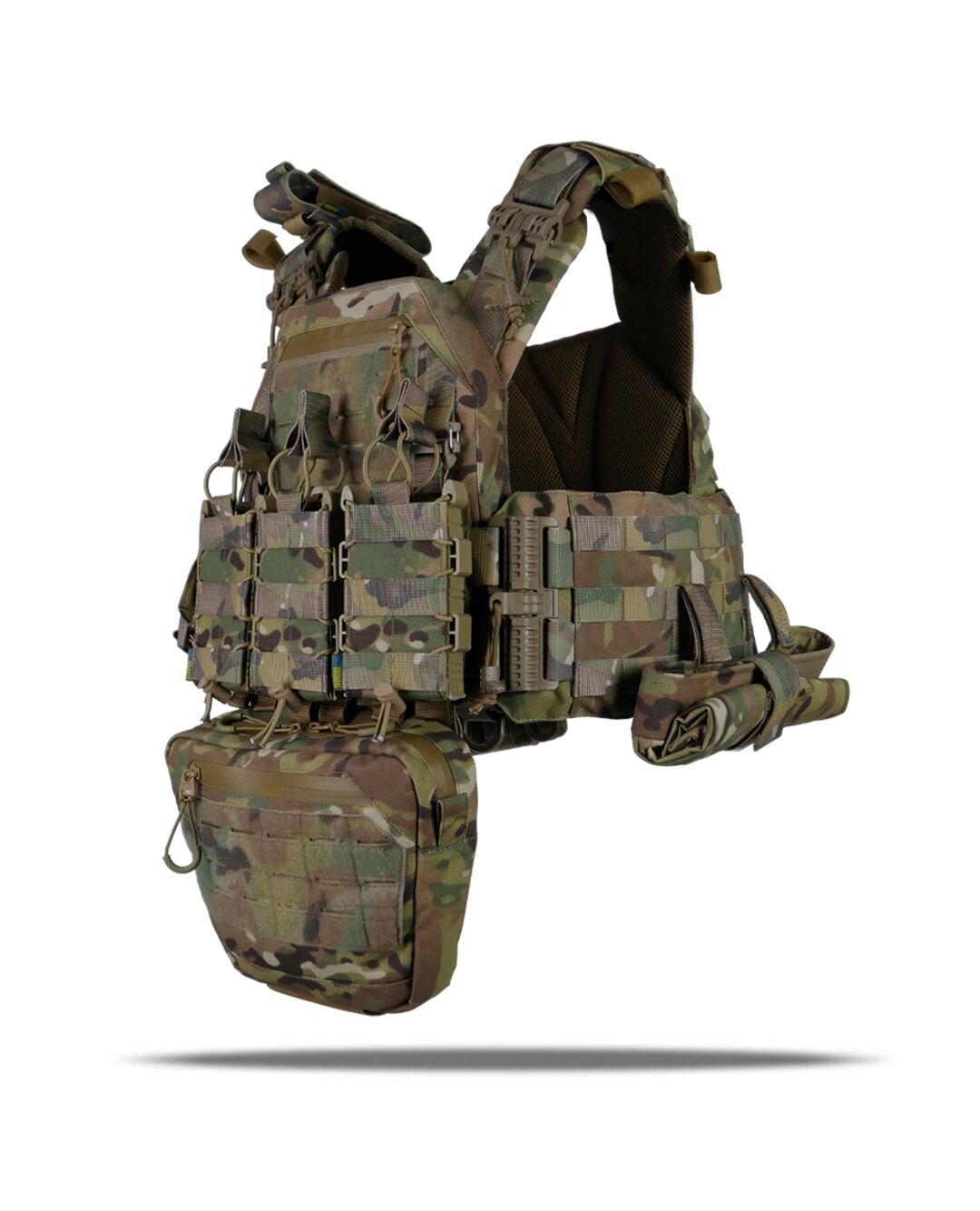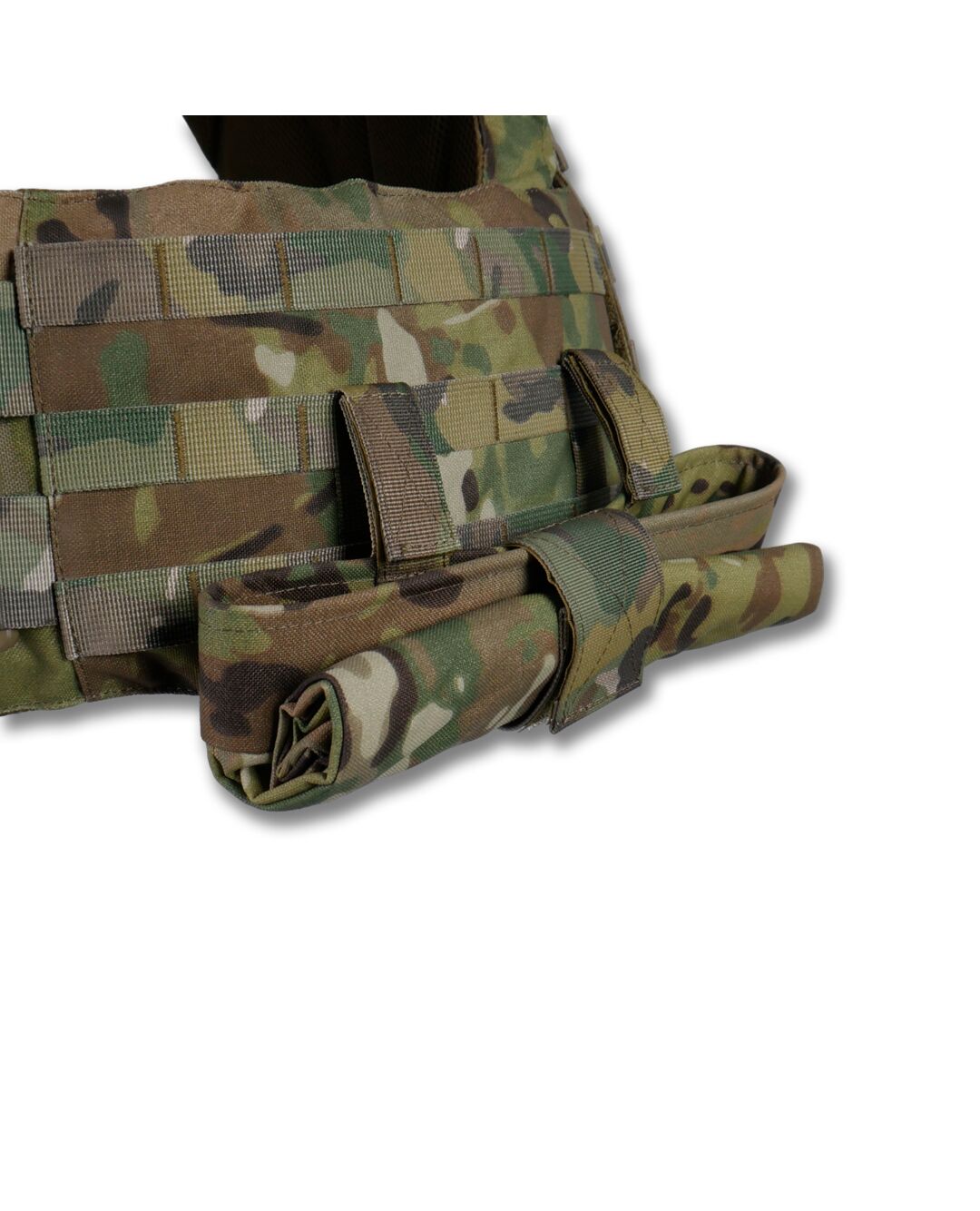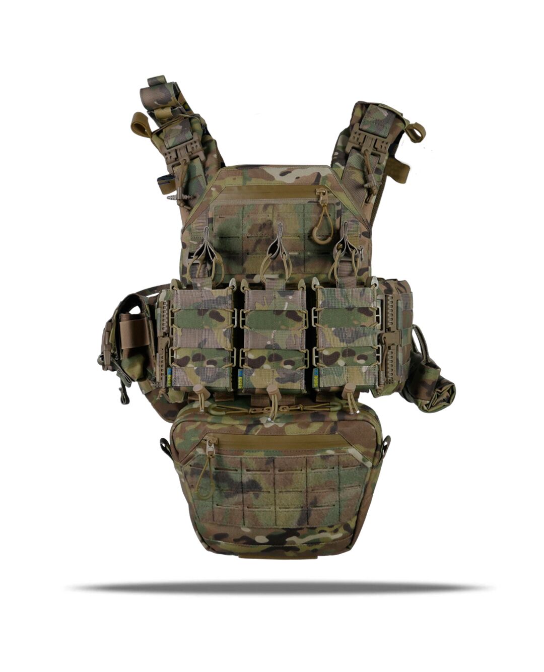 Плитоноска оснащена съемной передней Molle панелью, которая крепится к основанию на Velcro и дополнительно двумя карабинами Woojin. На ней удобно размещаются 3 итога под 1 или два магазина, или другое Molle-совместимое снаряжение. Эту панель можно быстро заменить другой с закрёклым на нее заранее набором нужных итогов.