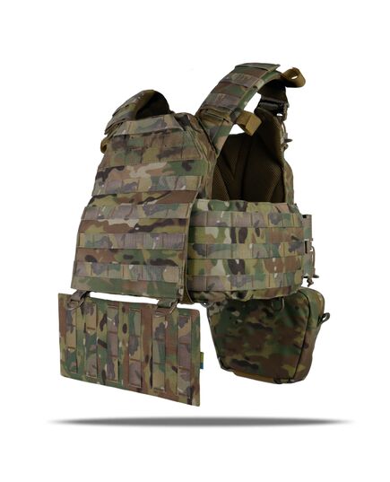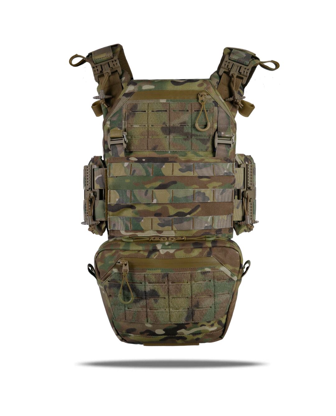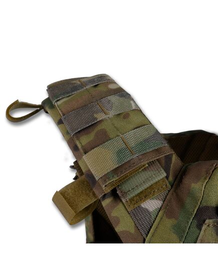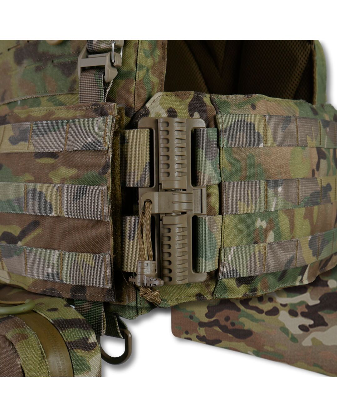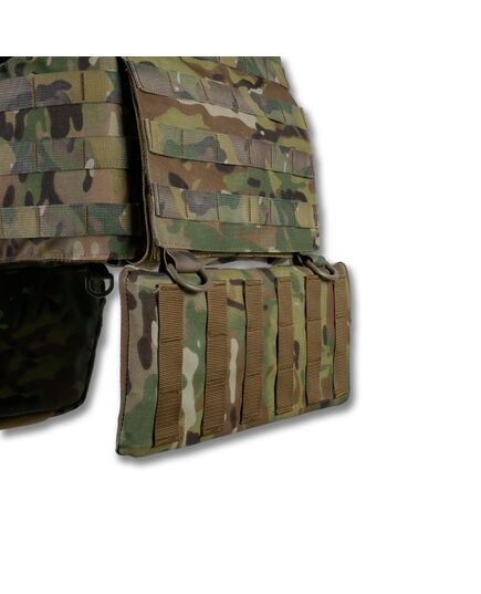 Плитоноска оснащена съемной передней Molle панелью, которая крепится к основанию на Velcro и дополнительно двумя карабинами Woojin. На ней удобно размещаются 3 итога под 1 или два магазина, или другое Molle-совместимое снаряжение. Эту панель можно быстро заменить другой с закрёклым на нее заранее набором нужных итогов.