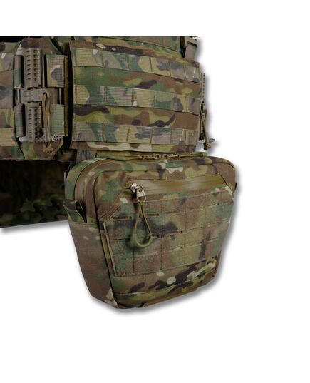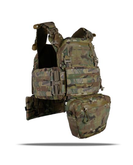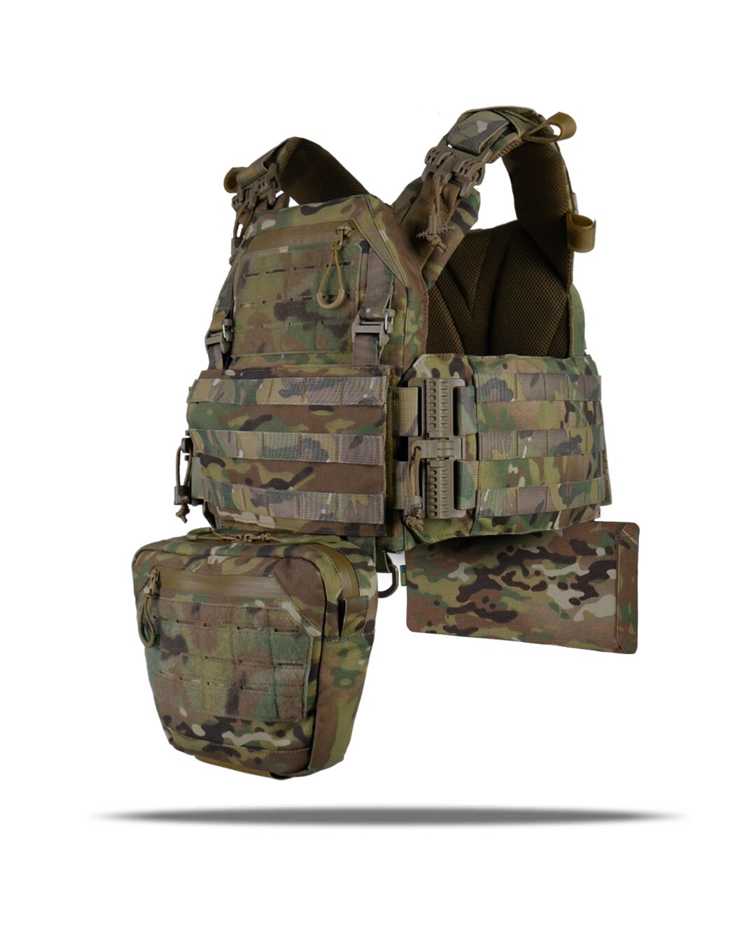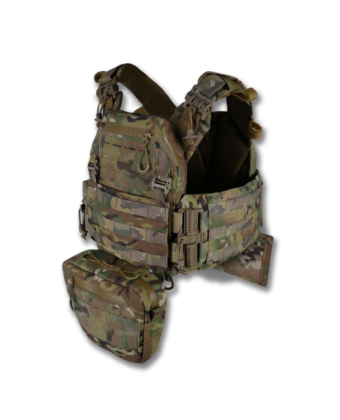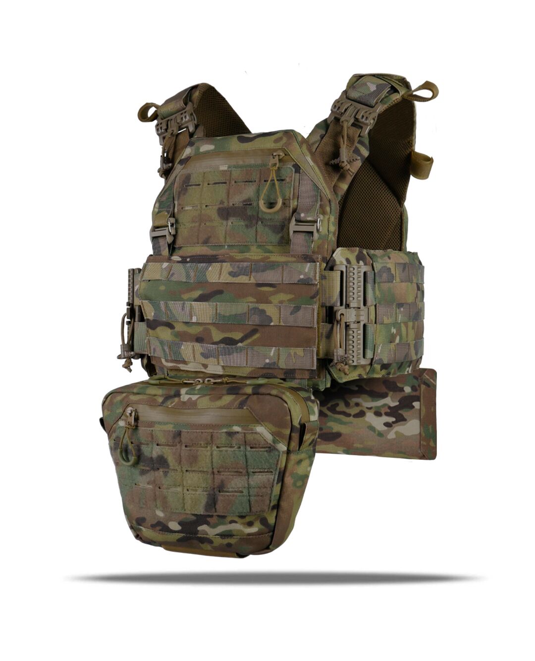 Плитоноска оснащена съемной передней Molle панелью, которая крепится к основанию на Velcro и дополнительно двумя карабинами Woojin. На ней удобно размещаются 3 итога под 1 или два магазина, или другое Molle-совместимое снаряжение. Эту панель можно быстро заменить другой с закрёклым на нее заранее набором нужных итогов.