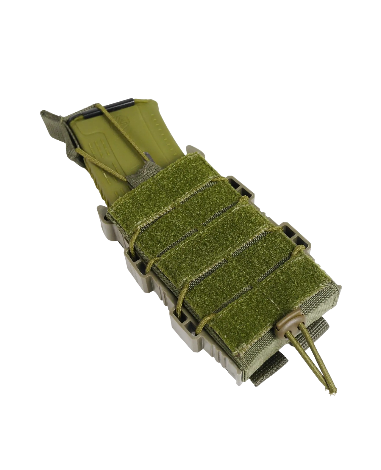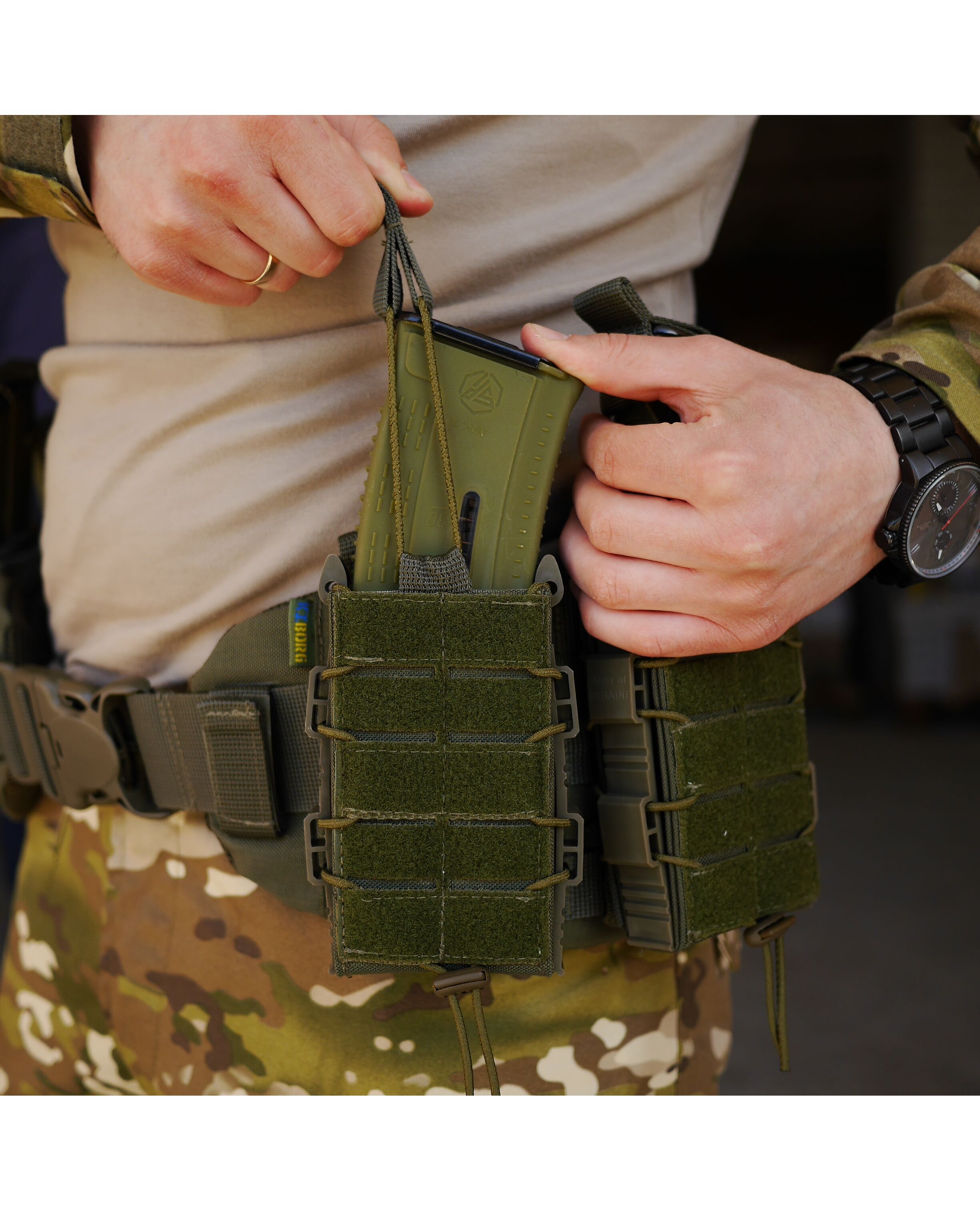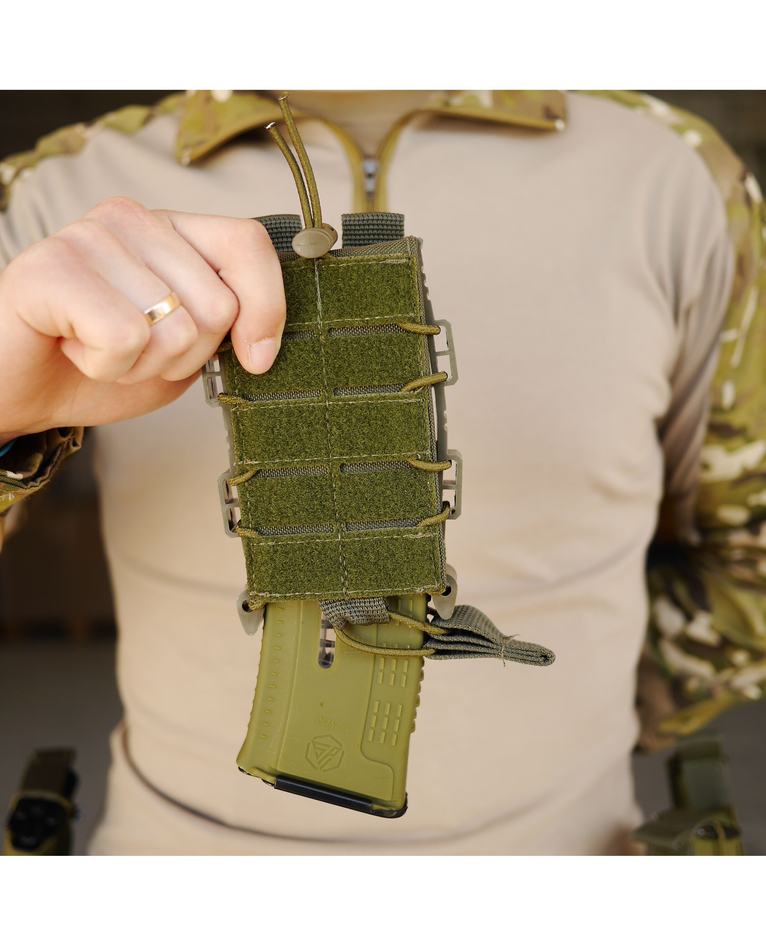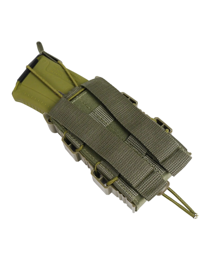 Сила сжатия магазина регулируется шнурком с качественным фиксатором, которым стянут подсумок. Сверху имеется дополнительный съемный фиксатор на резинке.
