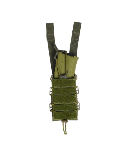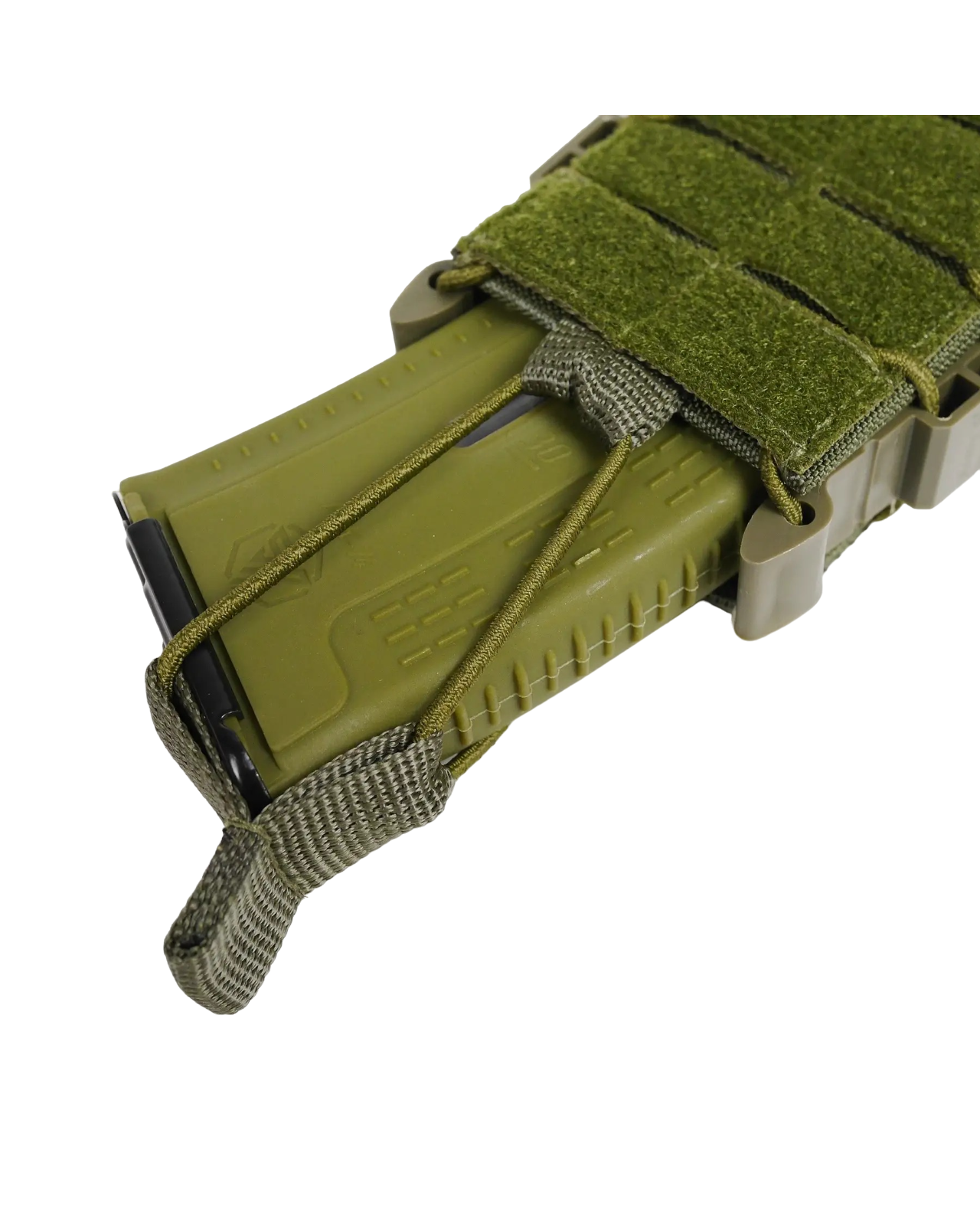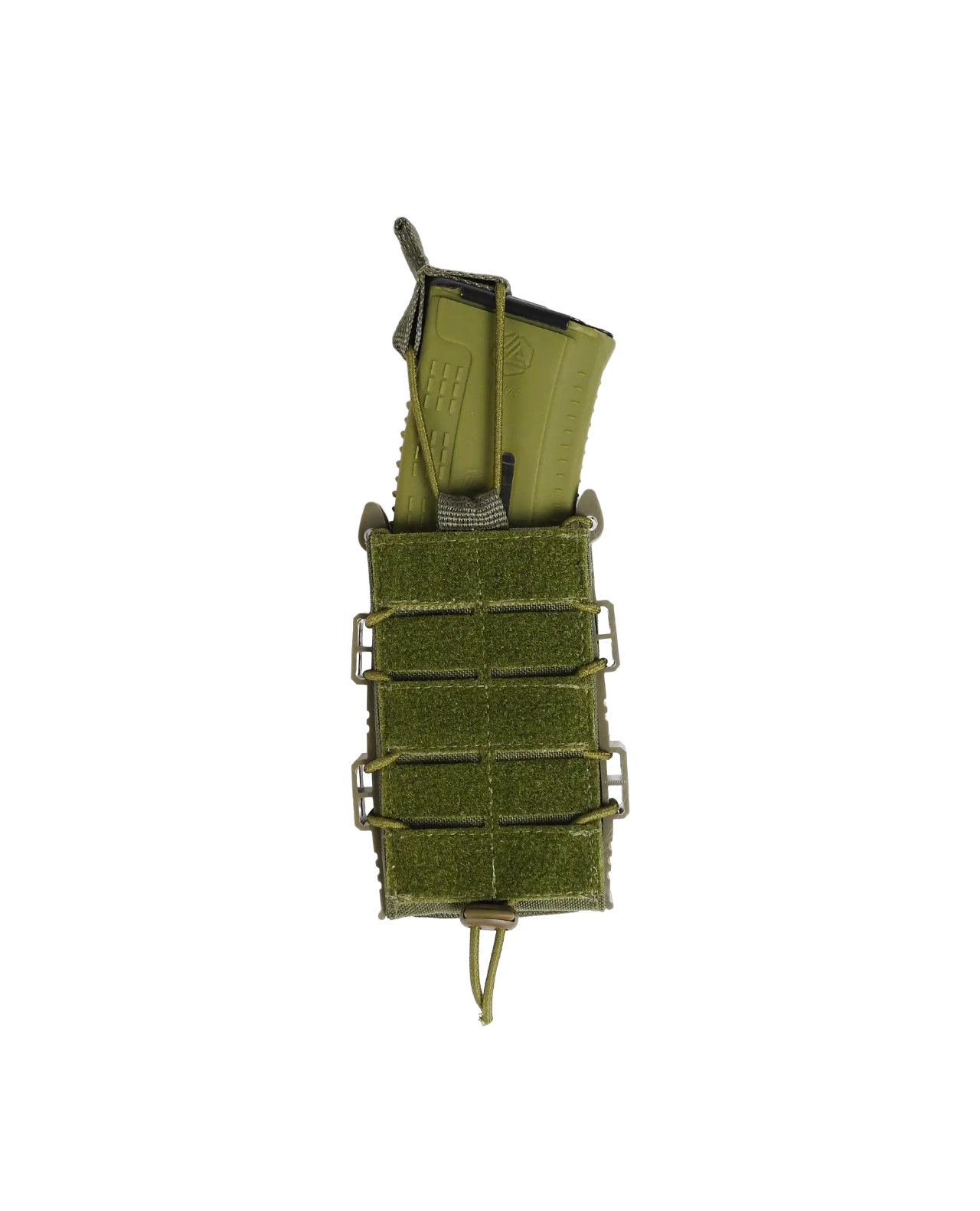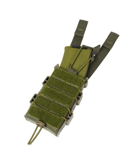 Сила сжатия магазина регулируется шнурком с качественным фиксатором, которым стянут подсумок. Сверху имеется дополнительный съемный фиксатор на резинке.