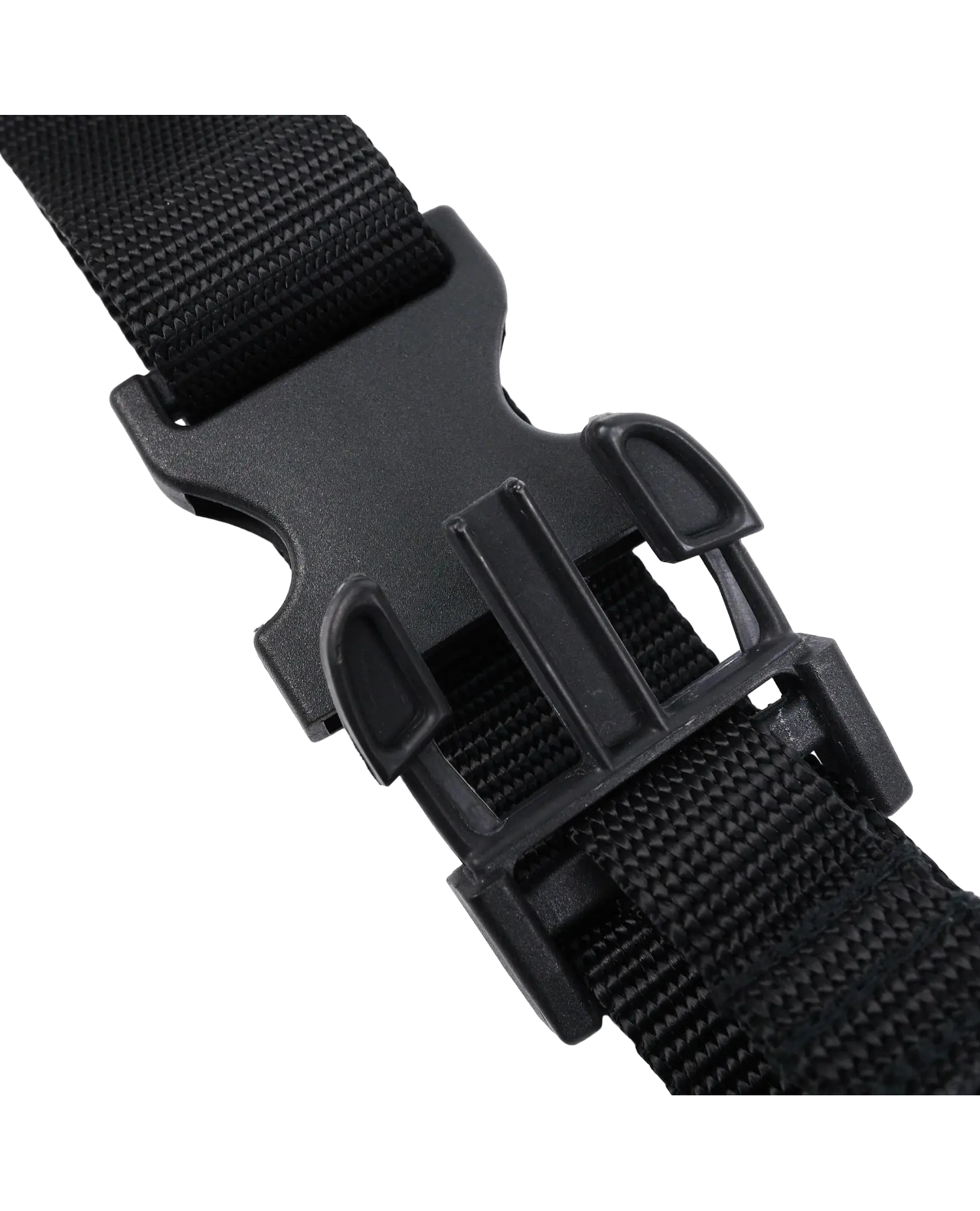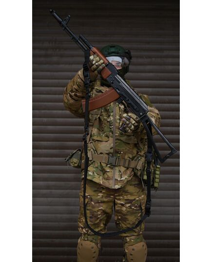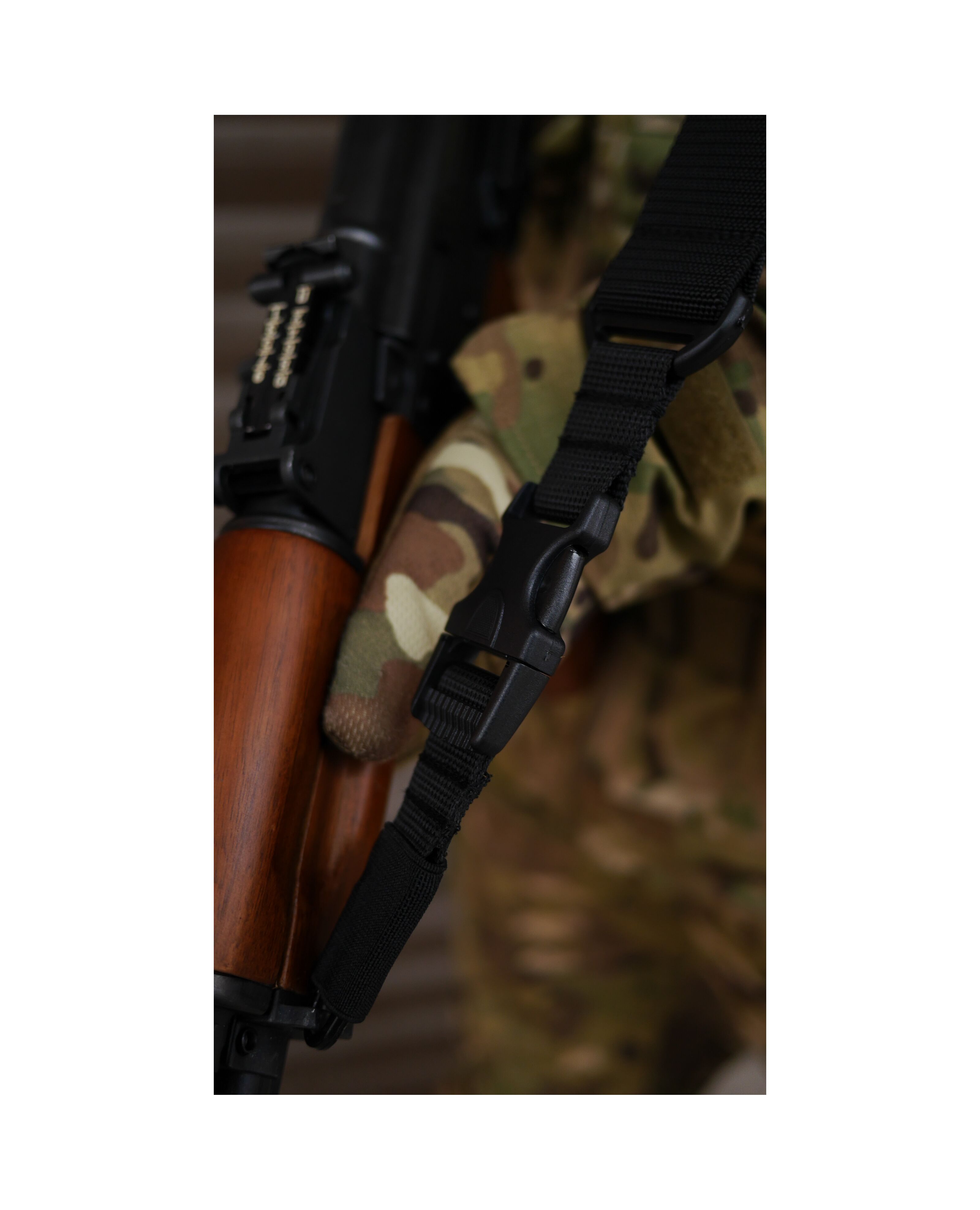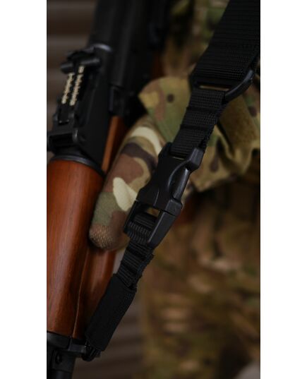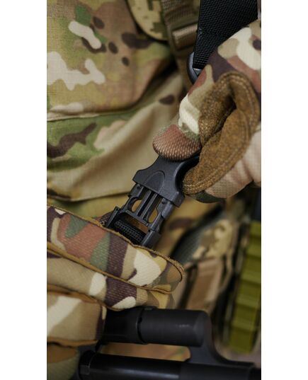Крепление ремня к оружию осуществляется с помощью перетяжек, которые в отличие от металлических карабинов исключают демаскующий лязг и звон. Функция быстрого сброса оружия обеспечивается крепким 40 мм фастексом.