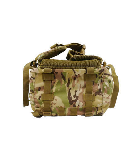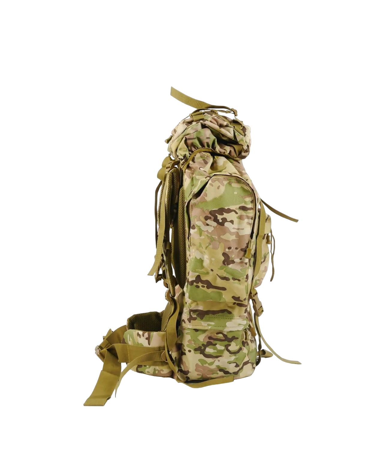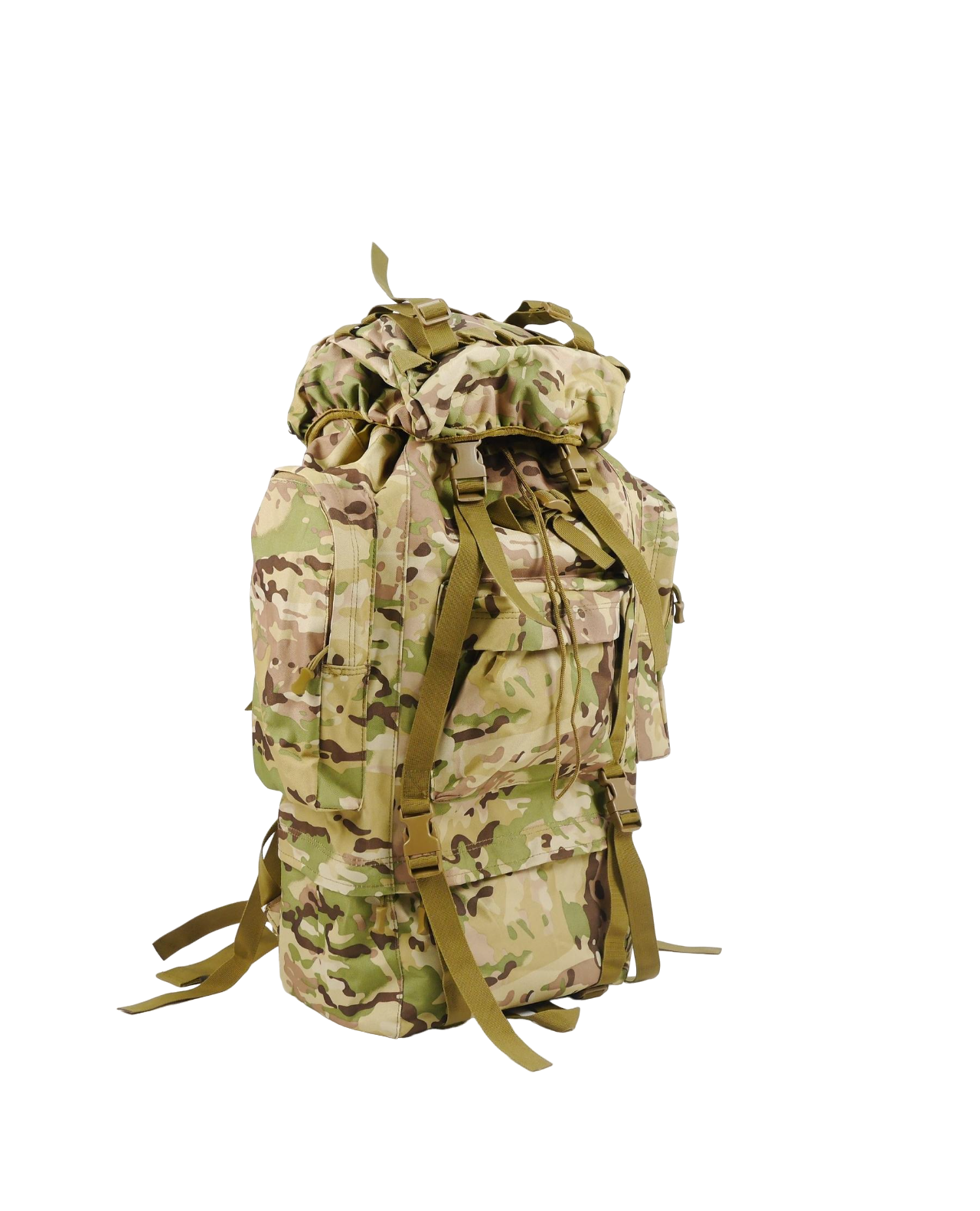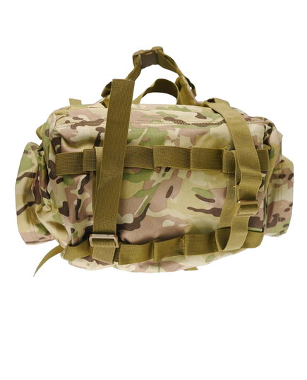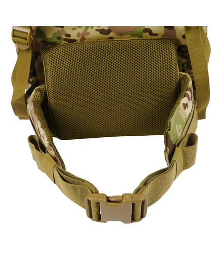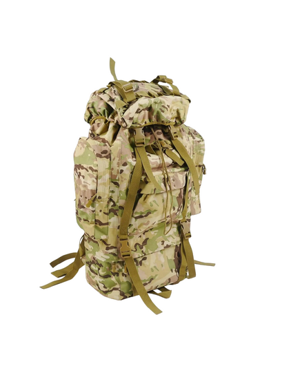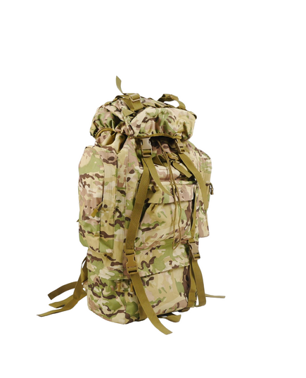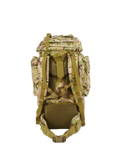 Изготовлен из крепкой ткани Oksford 600D. Рюкзак имеет большой основной отсек, две накладные карманы спереди и 4 кармана по бокам. Карманы влагостойкие, закрываются на застежки типа молния. Плечевые подтяжки регулируемые. Имеет алюминиевый каркас с мягкой спинкой. На бретельках нагрудный ремень на защелке фастекс для лучшего распределения веса. Для большего комфорта и оптимального распределения веса также есть широкий поясной ремень. Рюкзак оборудован системой строп Molle для дополнительного размещения на нем экипировки и оборудования. Эта модель разработана для использования военными и отлично подходит при продолжительных рейдах.