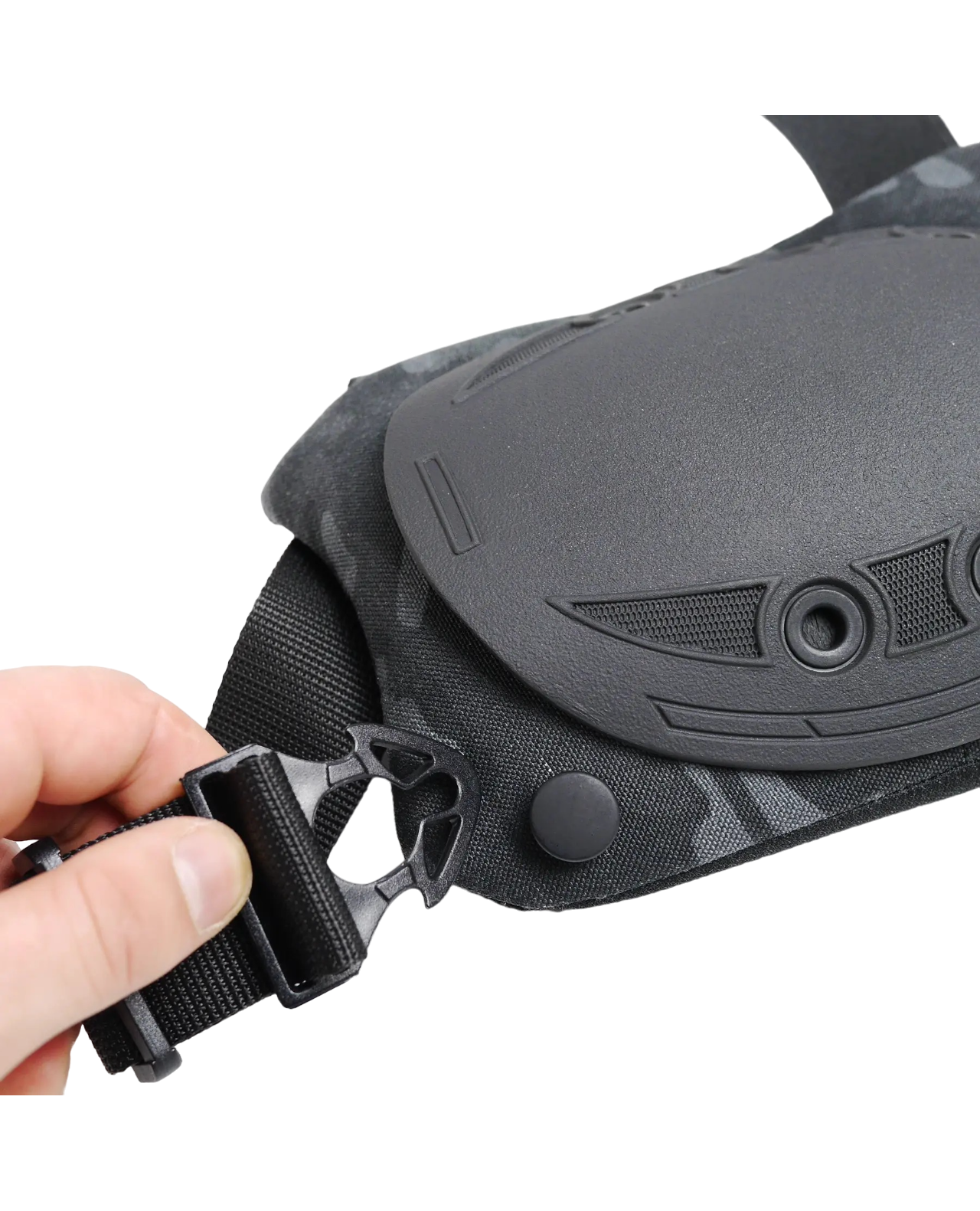 Одеваются и снимаются наколенники очень быстро и просто благодаря функции быстрого сброса (специальные прочные зацепы на концах застежек и кнопка фиксации на самих наколенниках).
