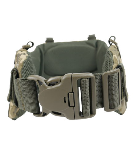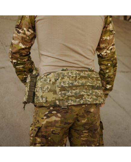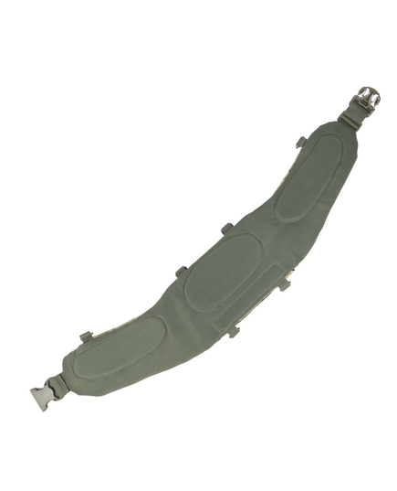 Пояс имеет анатомический крой и выглядит треугольником, имеет подсредний угол, который предотвращает спадание. На верхней части пояса имеются четыре точки крепления, что дает возможность использовать его с любой подвесной системой и сделать из пояса полноценный РПС. На нижней части два крепления для тактической сидушки или каремата.