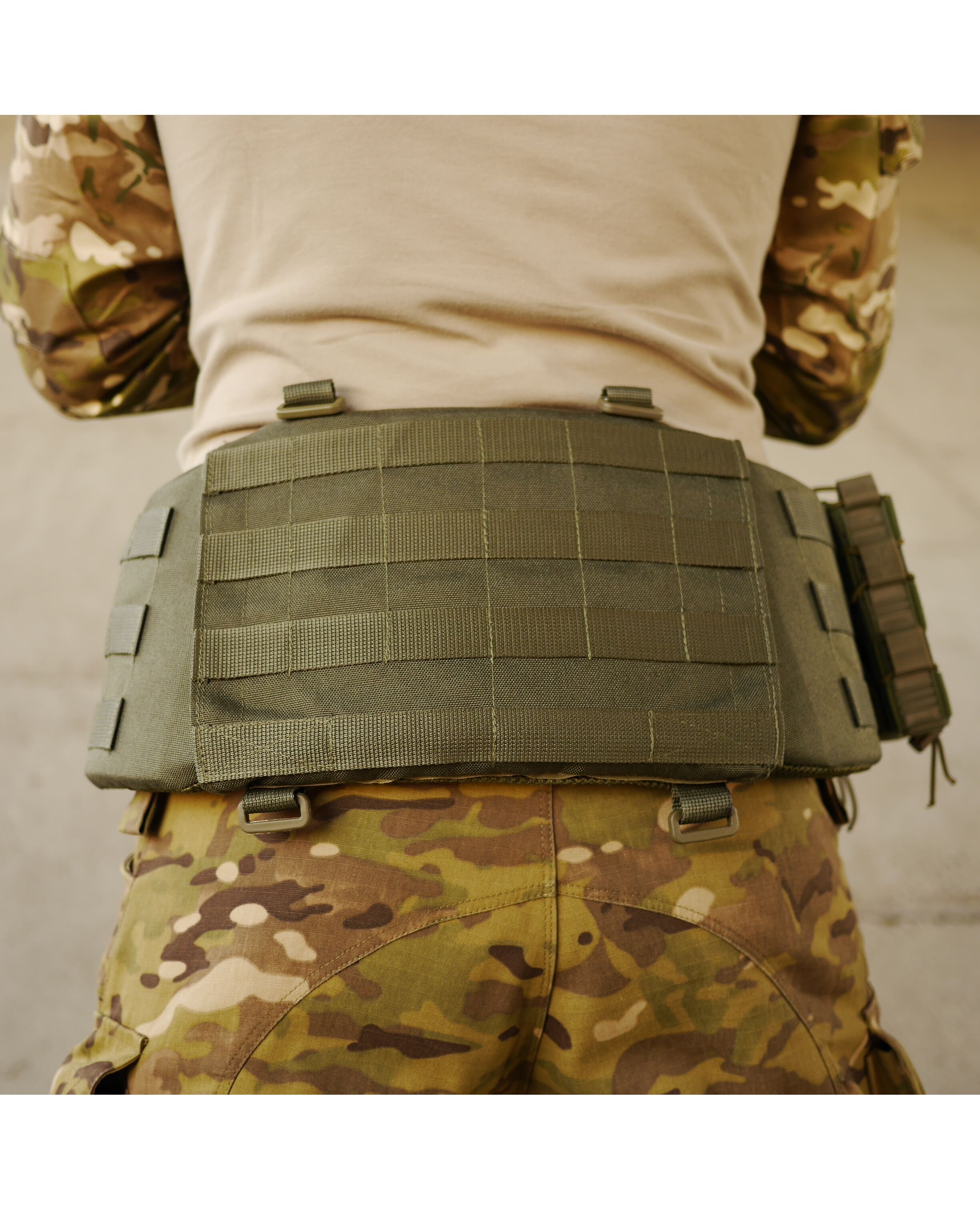 Пояс имеет анатомический крой и выглядит треугольником, имеет подсредненный угол, который предотвращает убывание. На верхней части пояса есть четыре точки крепления, что дает возможность использовать его с любой подвесной системой и сделать из пояса полноценный РПС. На нижней части два крепления для тактической сидушки или каремата.