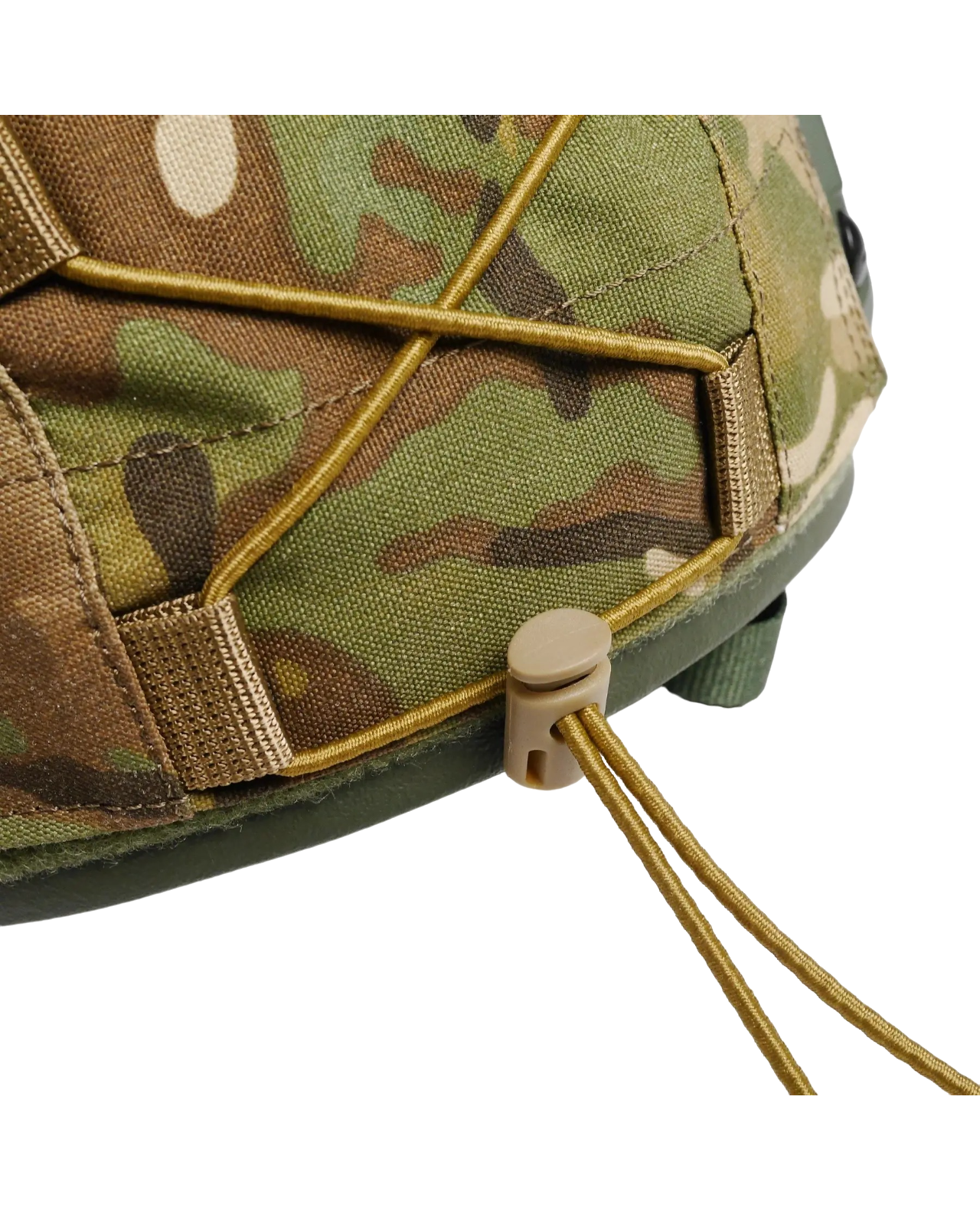 Фиксация на шлем происходит за счет твердой части липучек велкро на кавере, к мягкой части на поверхности баллистического шлема. Благодаря стяжке на резинке легко регулируется и может добавлять элементы маскировки.