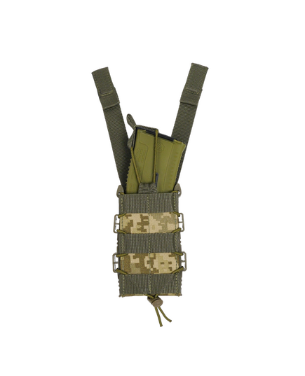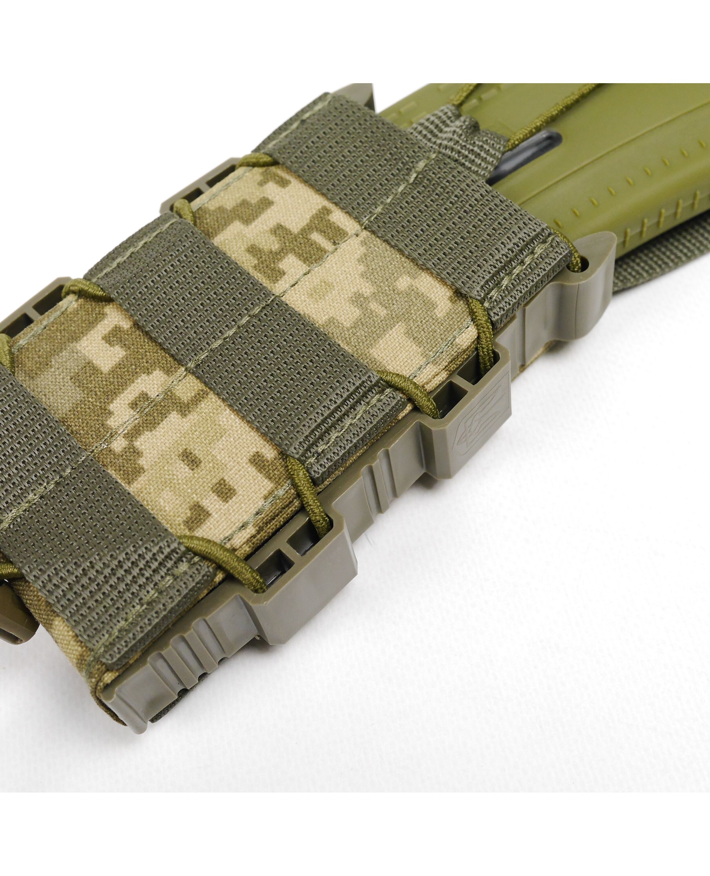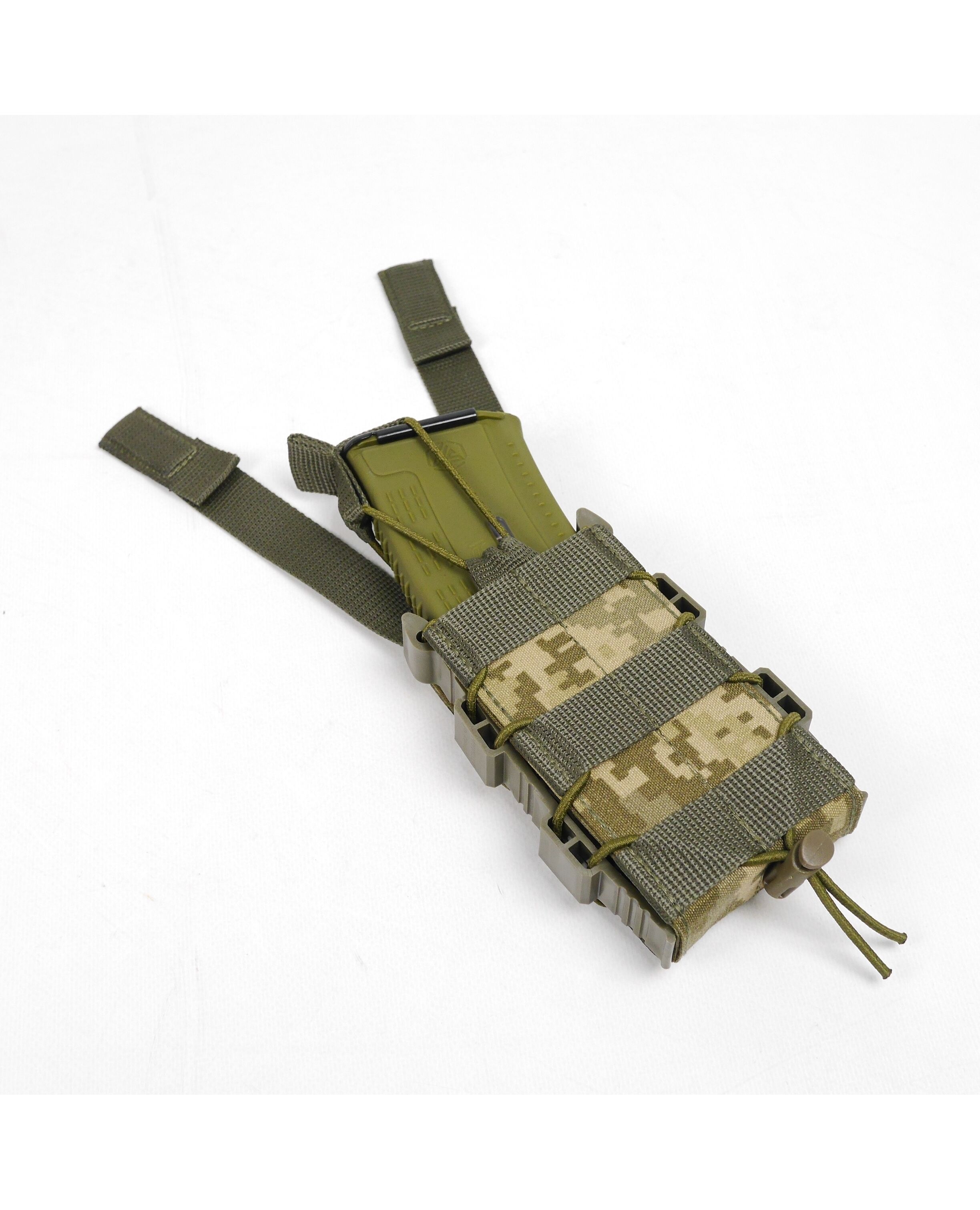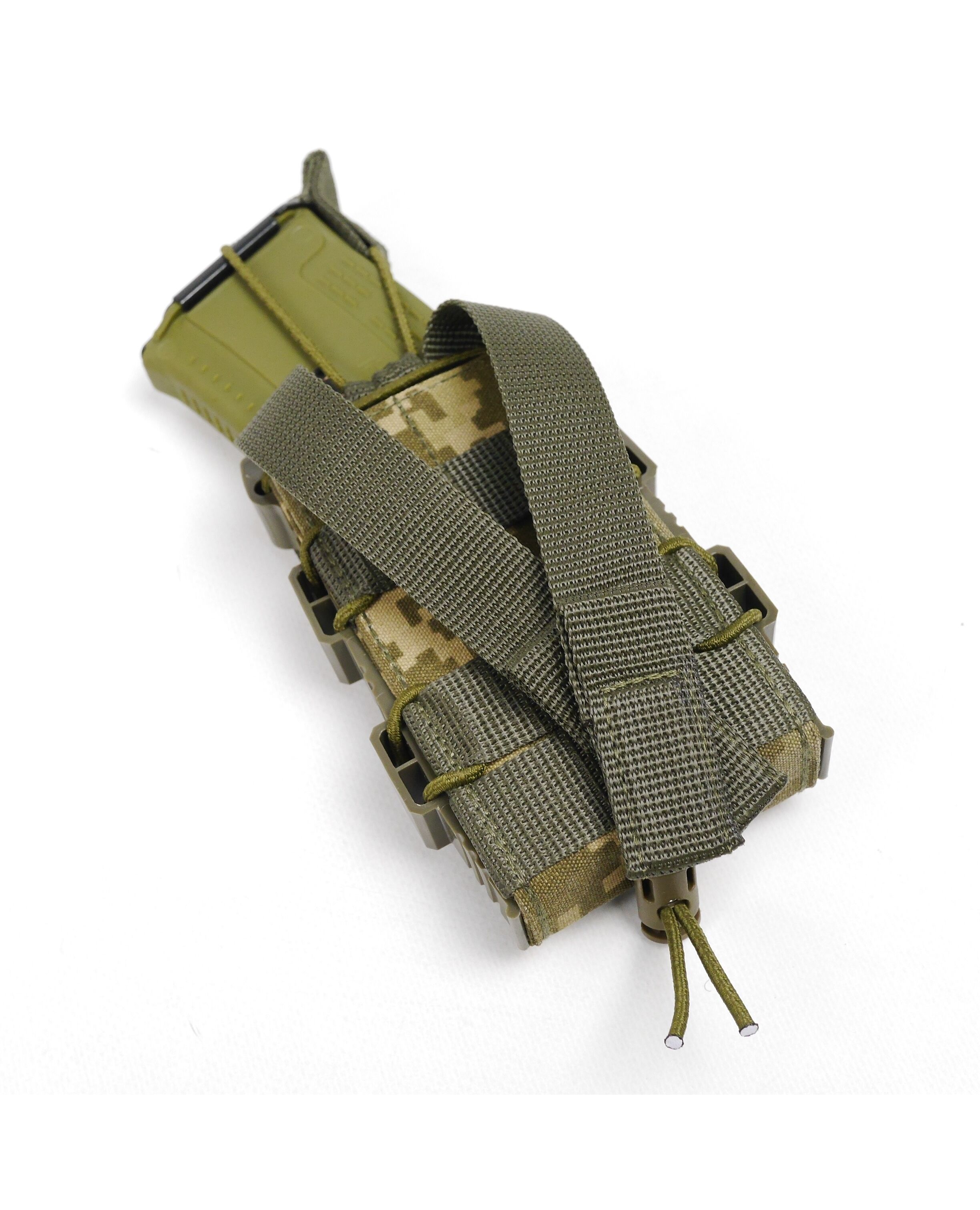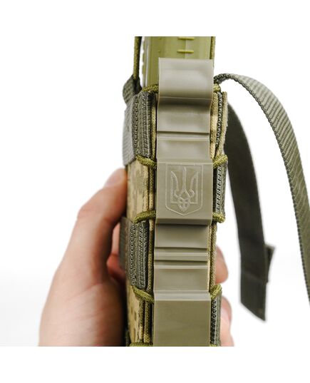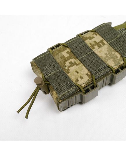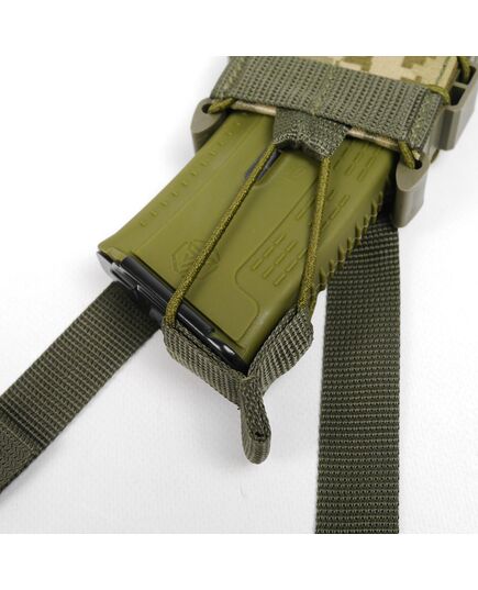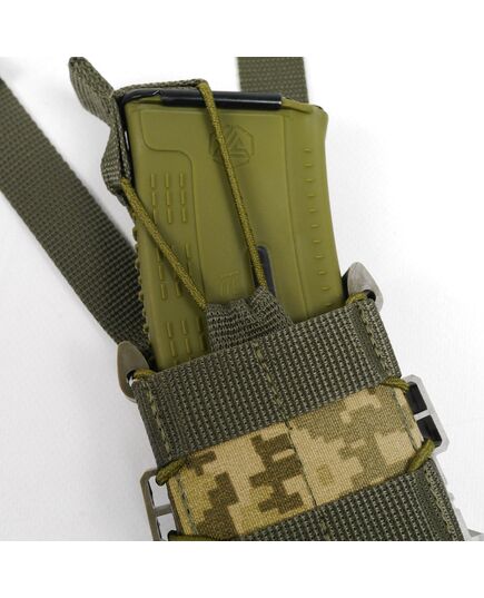 Сила сжатия магазина регулируется шнурком-резинкой с качественным фиксатором, которым стянут подсумок. Сверху есть дополнительный фиксатор на резинке, который при необходимости можно снять.