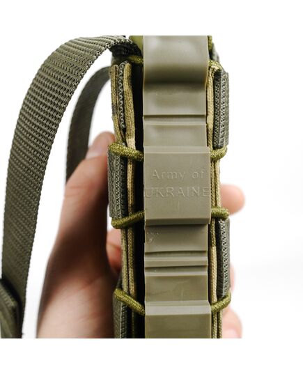 Боковые стенки и низ подсумка представляют собой цельный прочный каркас из ударопрочного полимера, который выдерживает от -40 до +80С. Благодаря ему осуществляется основная фиксация магазина внутри подсумка.