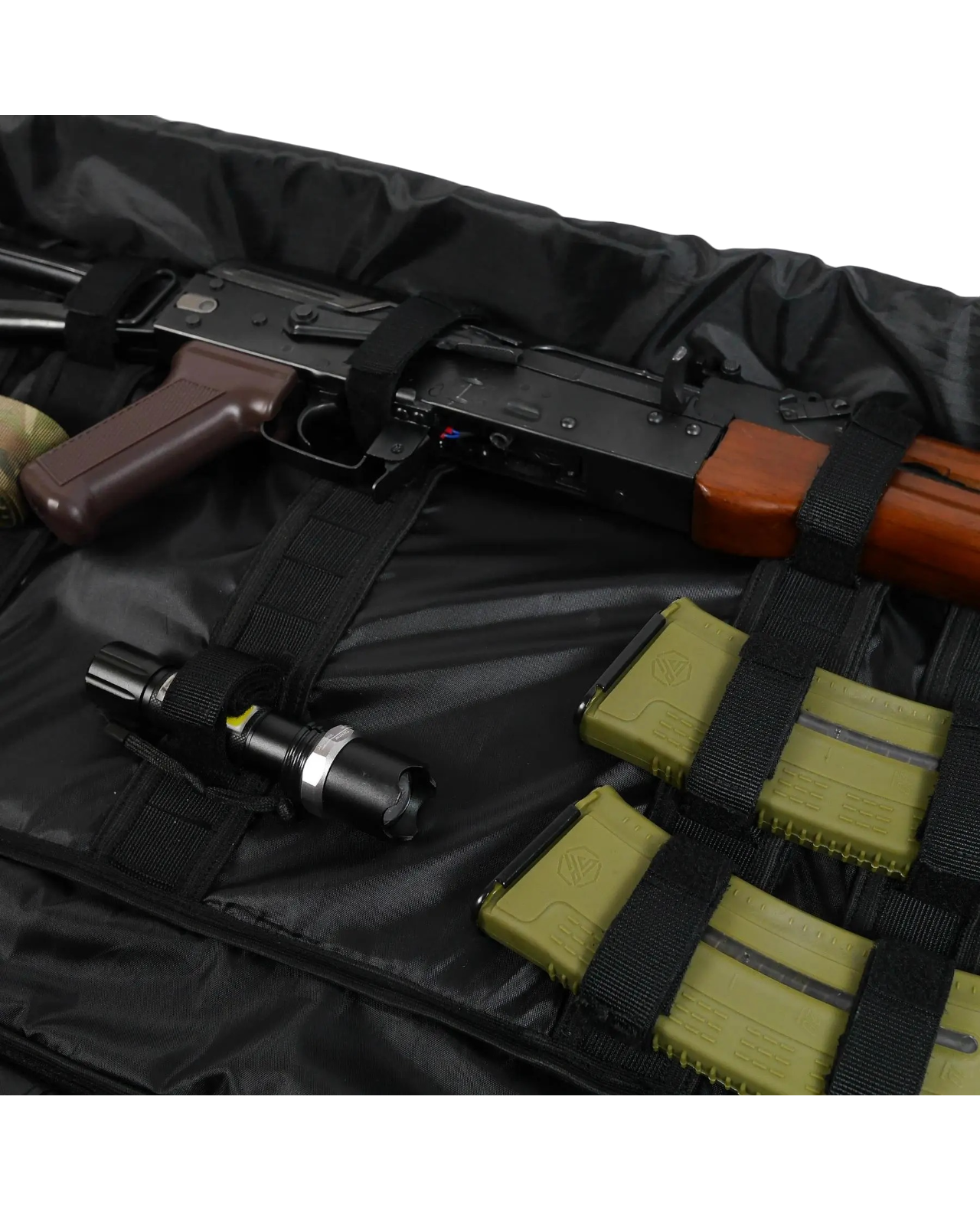 Внутри имеются 7 специальных панелей с системой Molle, к которым крепятся съемные фиксаторы. Фиксаторы из полиамидной стропы 25мм. регулируемые по длине с помощью нашитых липучек. Всего в комплект входит 14 таких креплений, соответственно у владельца кейса будет 14 точек для фиксации оружия, аксессуаров и личных вещей.