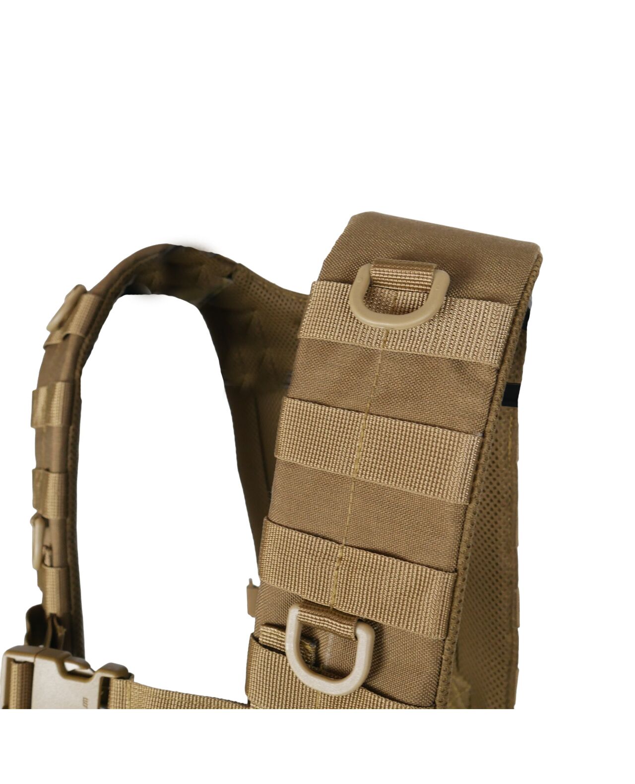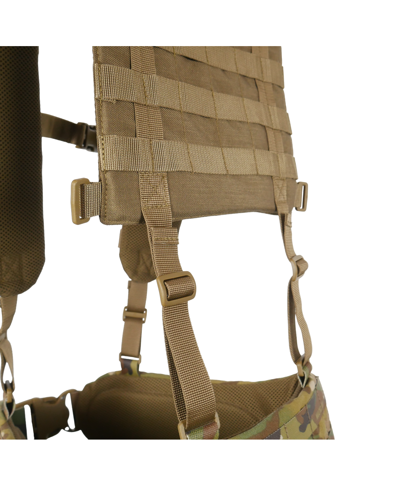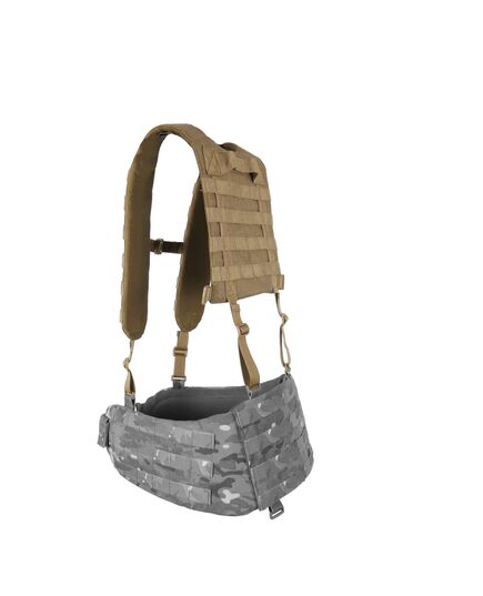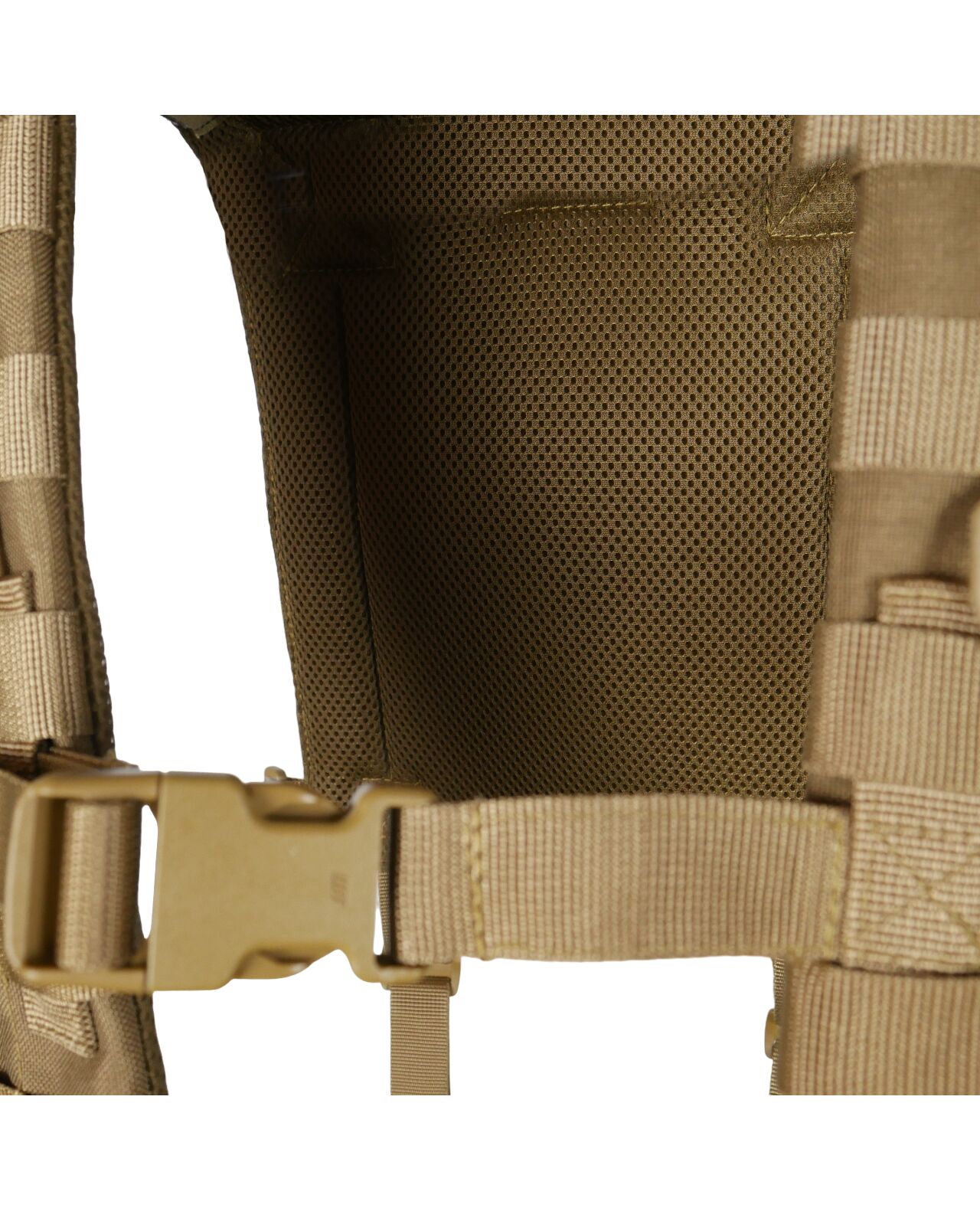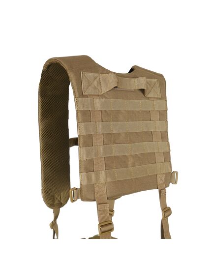 Конструкция. Плечевые лямки имеют рюкзачную конструкцию с ячейками MOLLE на спине для закрепления дополнительных итогов. Имеет внутренний слой полифома толщиной 5 мм и мягкую сетку для вентиляции. На лямках предусмотрено по 7 рядов MOLLE и нагрудный соединительный ремень на фастексе.