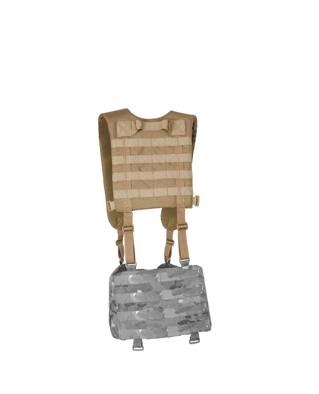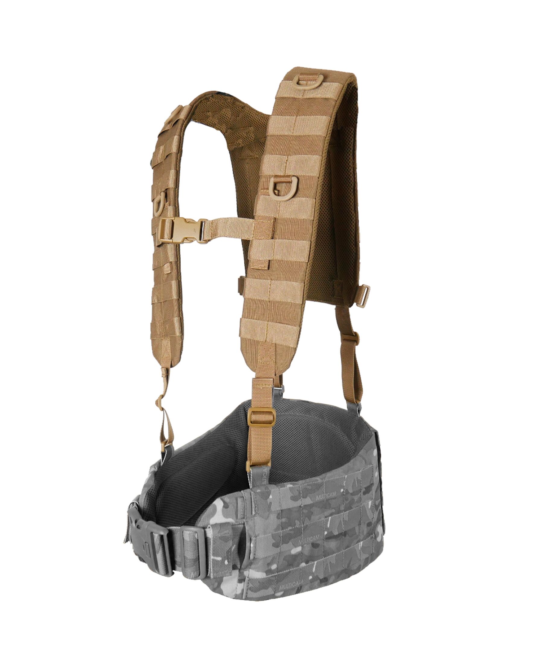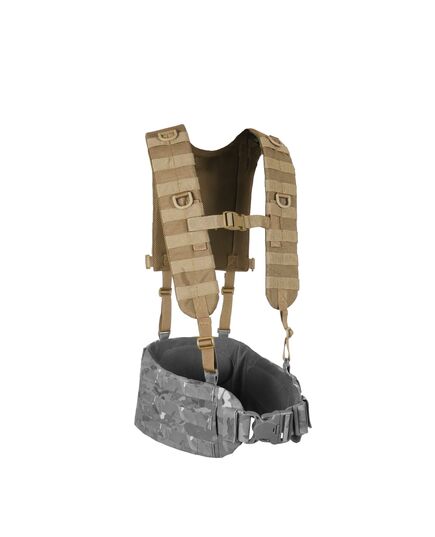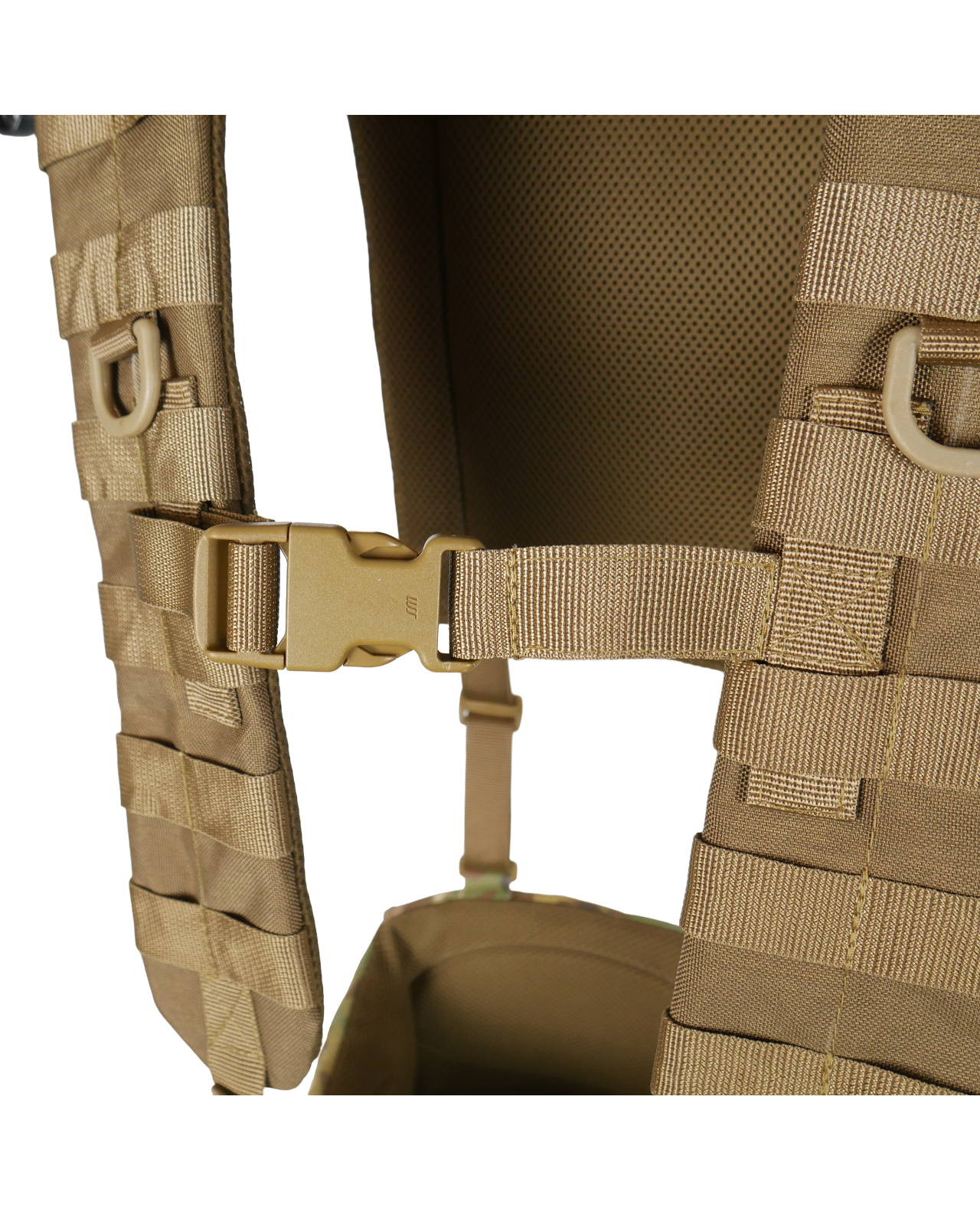 Конструкция. Плечевые лямки имеют рюкзачную конструкцию с ячейками MOLLE на спине для закрепления дополнительных итогов. Имеет внутренний слой полифома толщиной 5 мм и мягкую сетку для вентиляции. На лямках предусмотрено по 7 рядов MOLLE и нагрудный соединительный ремень на фастексе.