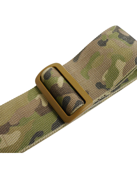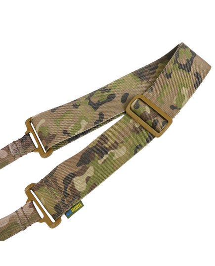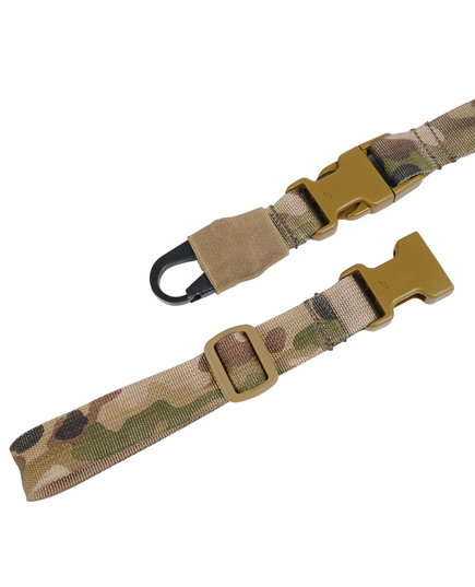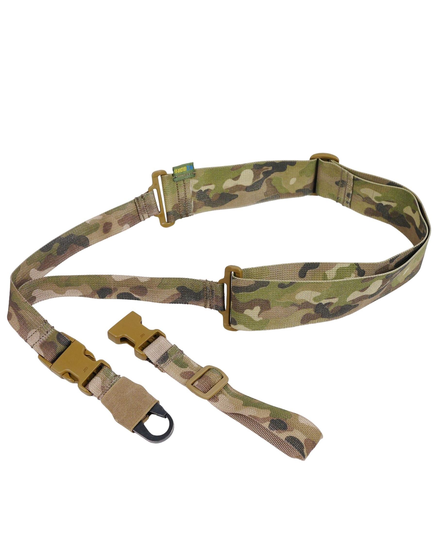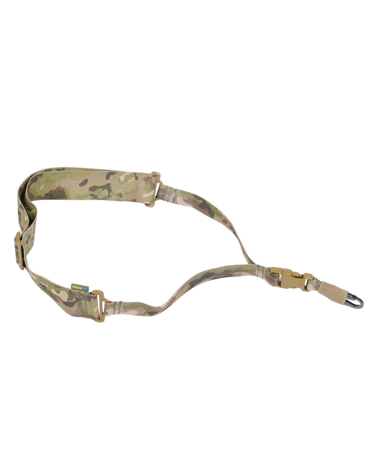 Камуфлированная с лицевой и оборотной стороны стропа не меняет цвет и не выгорает на солнце. Ремень имеет систему быстрого сброса и регулируется по длине.