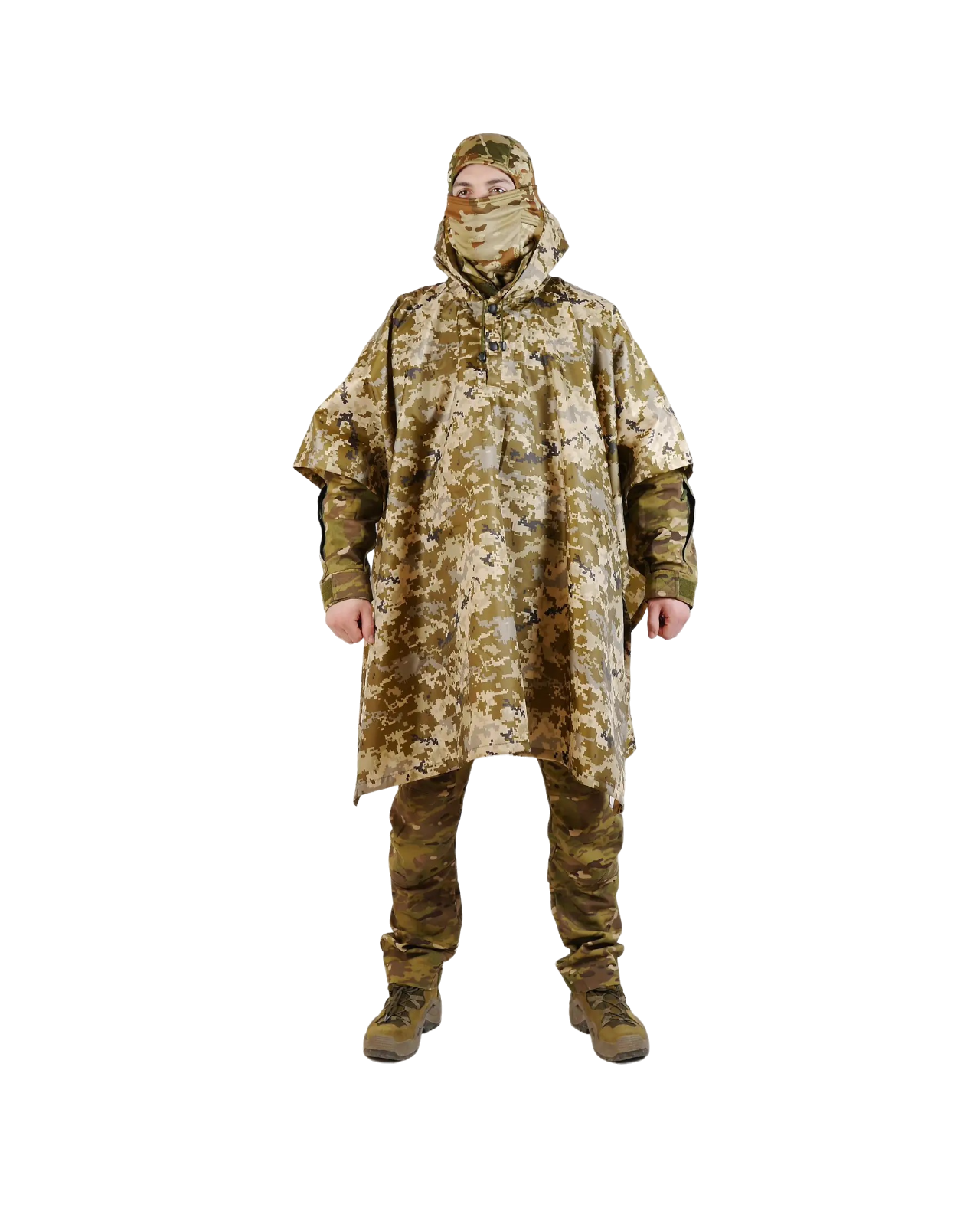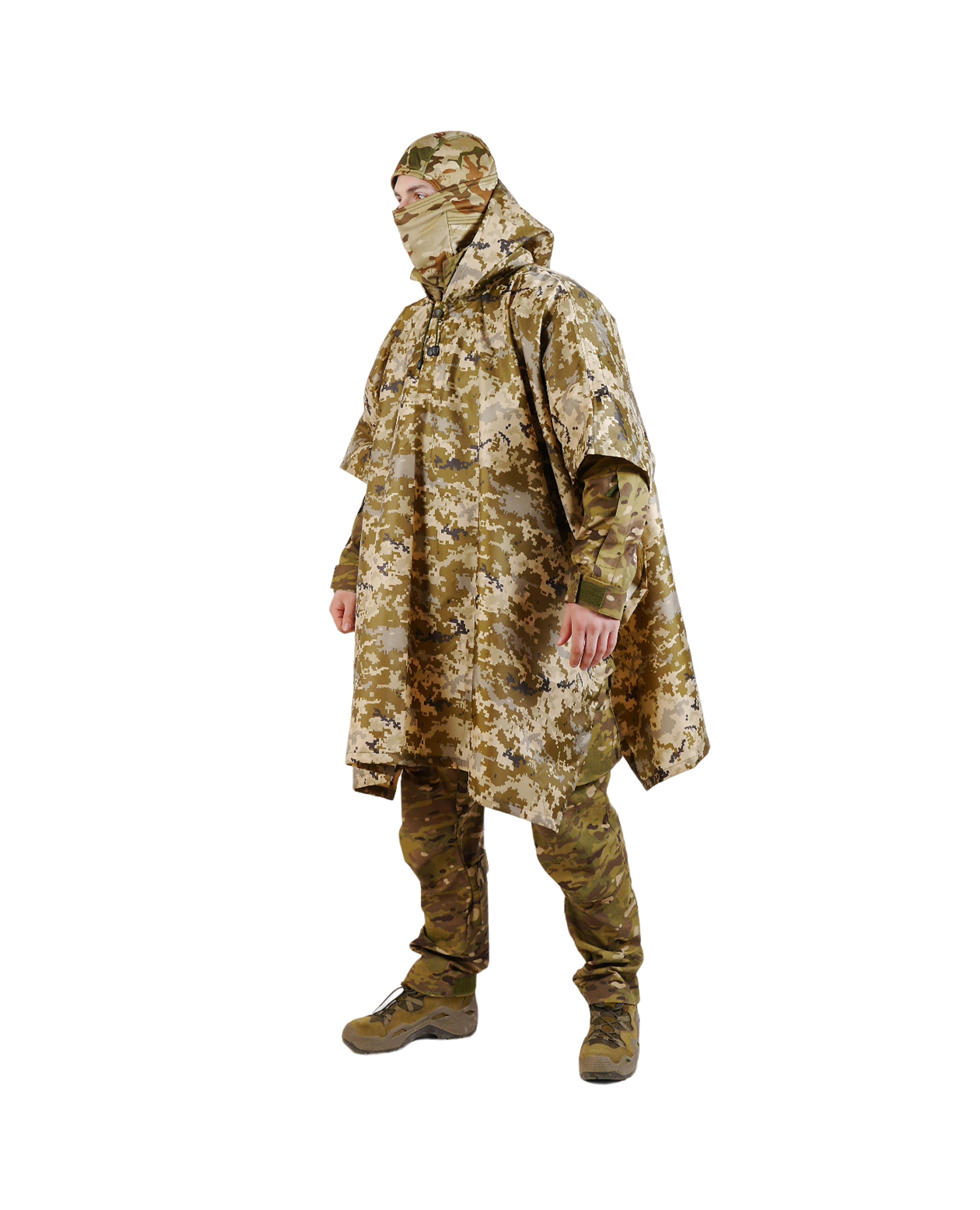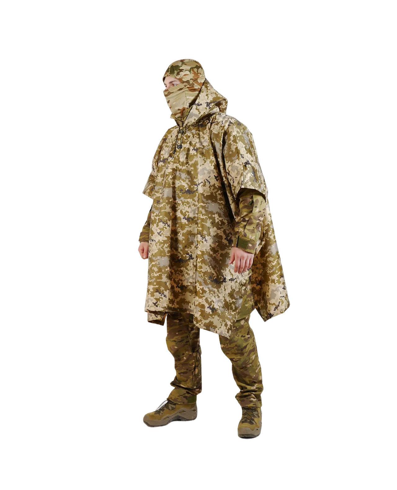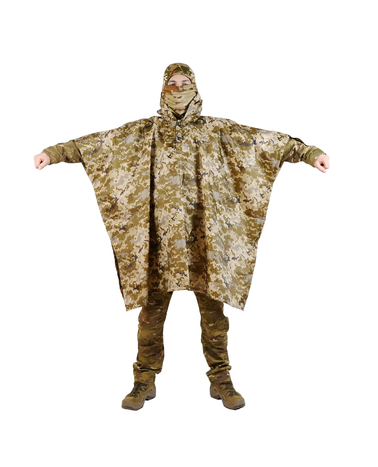 Прикрывает руки, тело и большую часть ног. Пошив пончо позволяет его одевать поверх одежды и амуниции. Имеются дополнительные резинки на рукавах для фиксации изделия на руках.