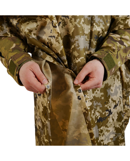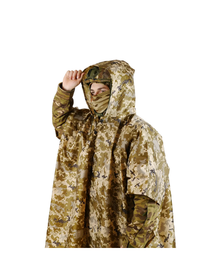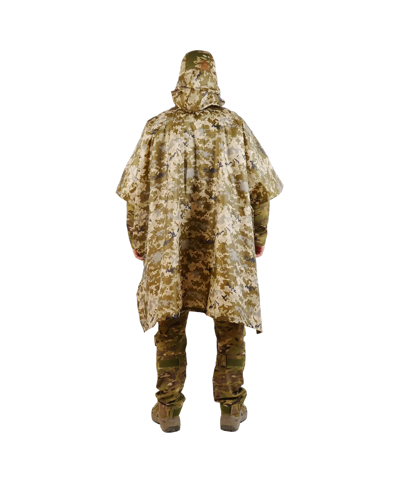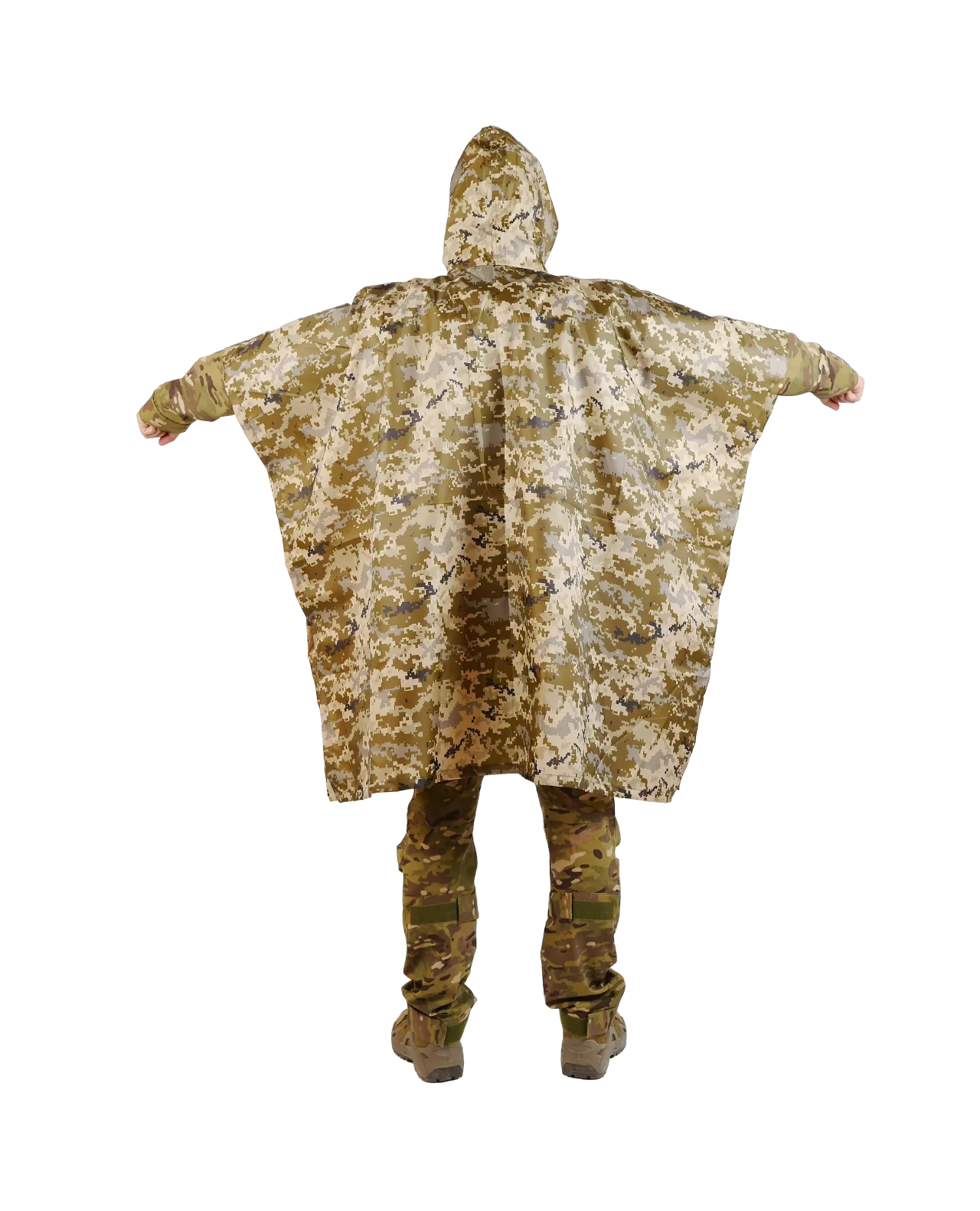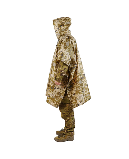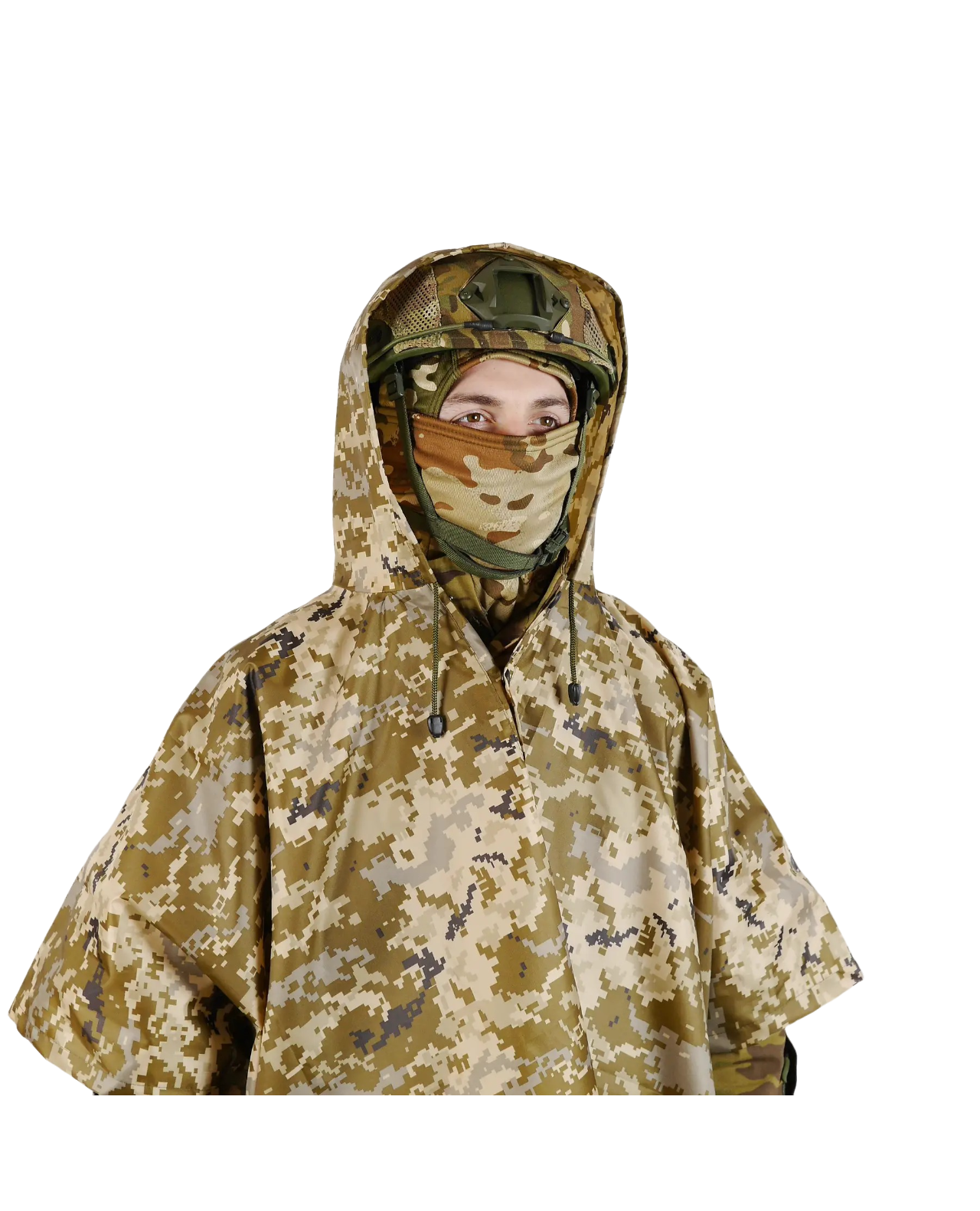 Прикрывает руки, тело и большую часть ног. Пошив пончо позволяет его одевать поверх одежды и амуниции. Имеются дополнительные резинки на рукавах для фиксации изделия на руках.