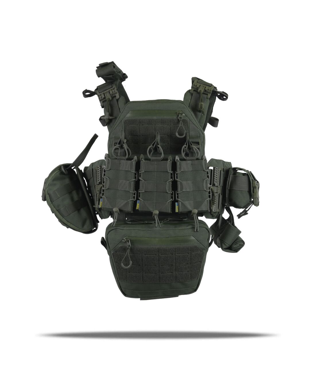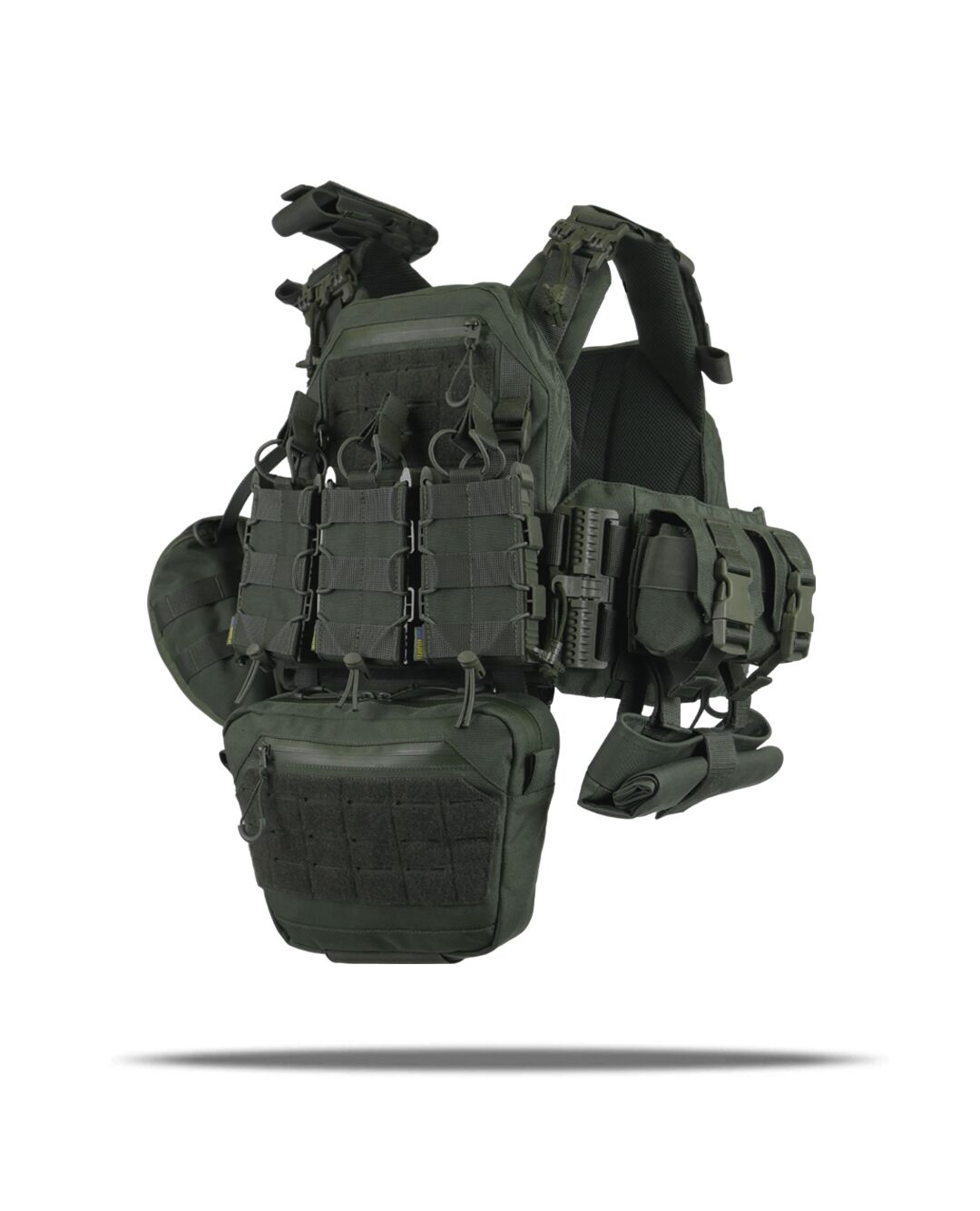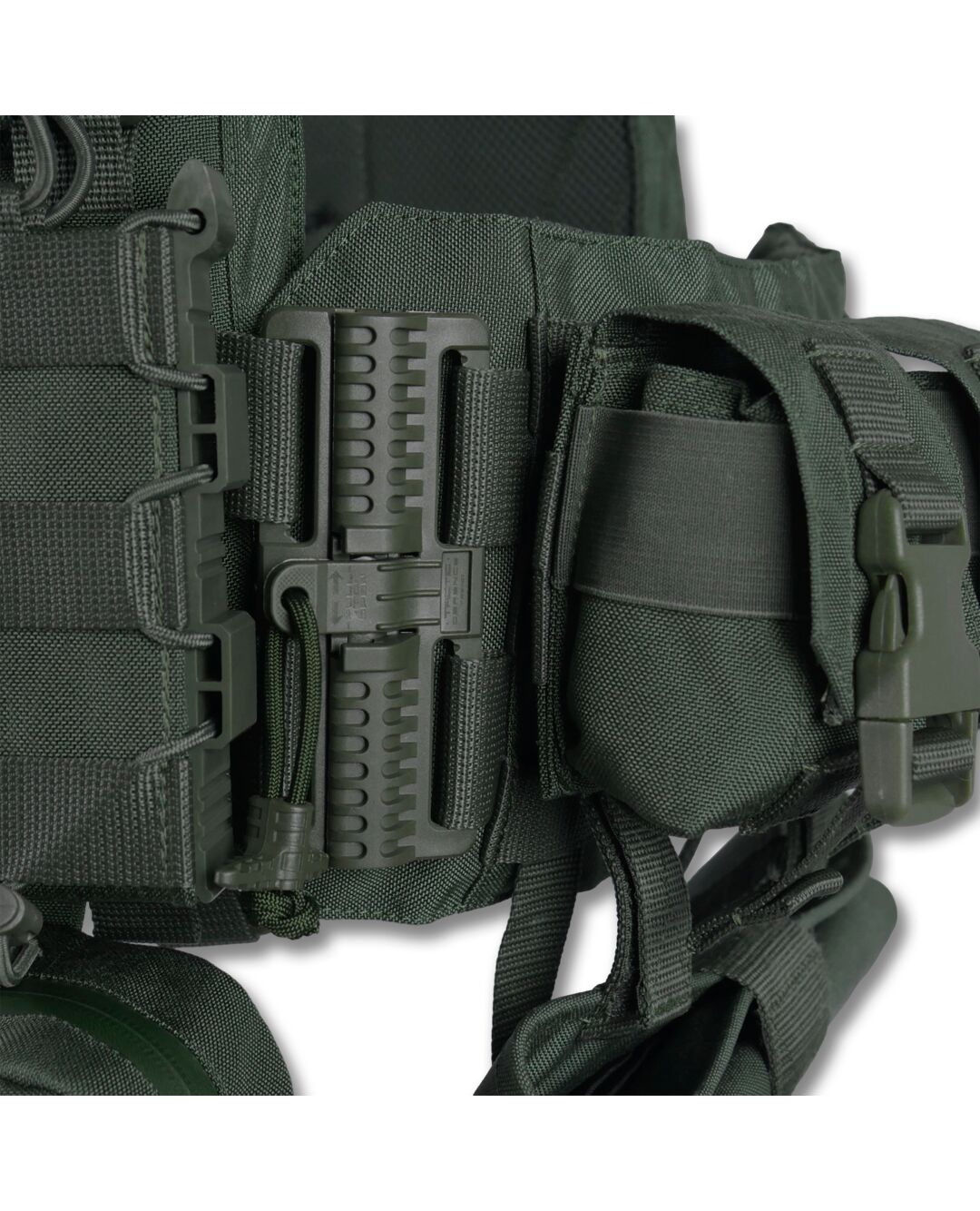 Плитоноска оснащена съемной передней Molle панелью, которая крепится к основанию на Velcro и дополнительно двумя карабинами Woojin. На ней удобно размещаются 3 итога под 1 или два магазина, или другое Molle-совместимое снаряжение. Эту панель можно быстро заменить другой с закрёклым на нее заранее набором нужных итогов.