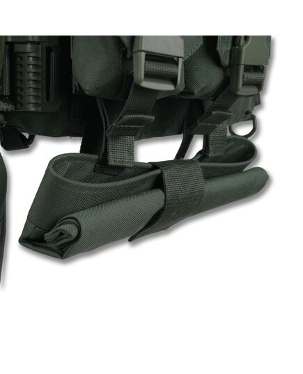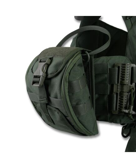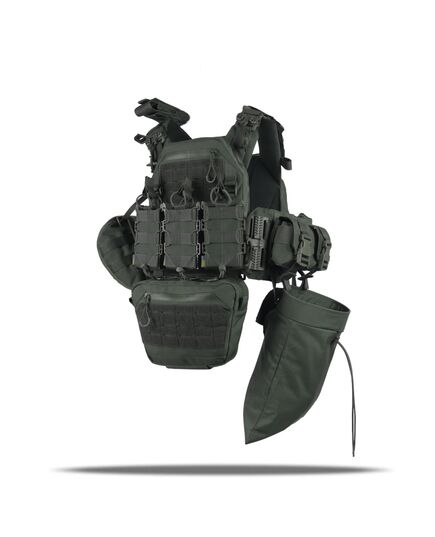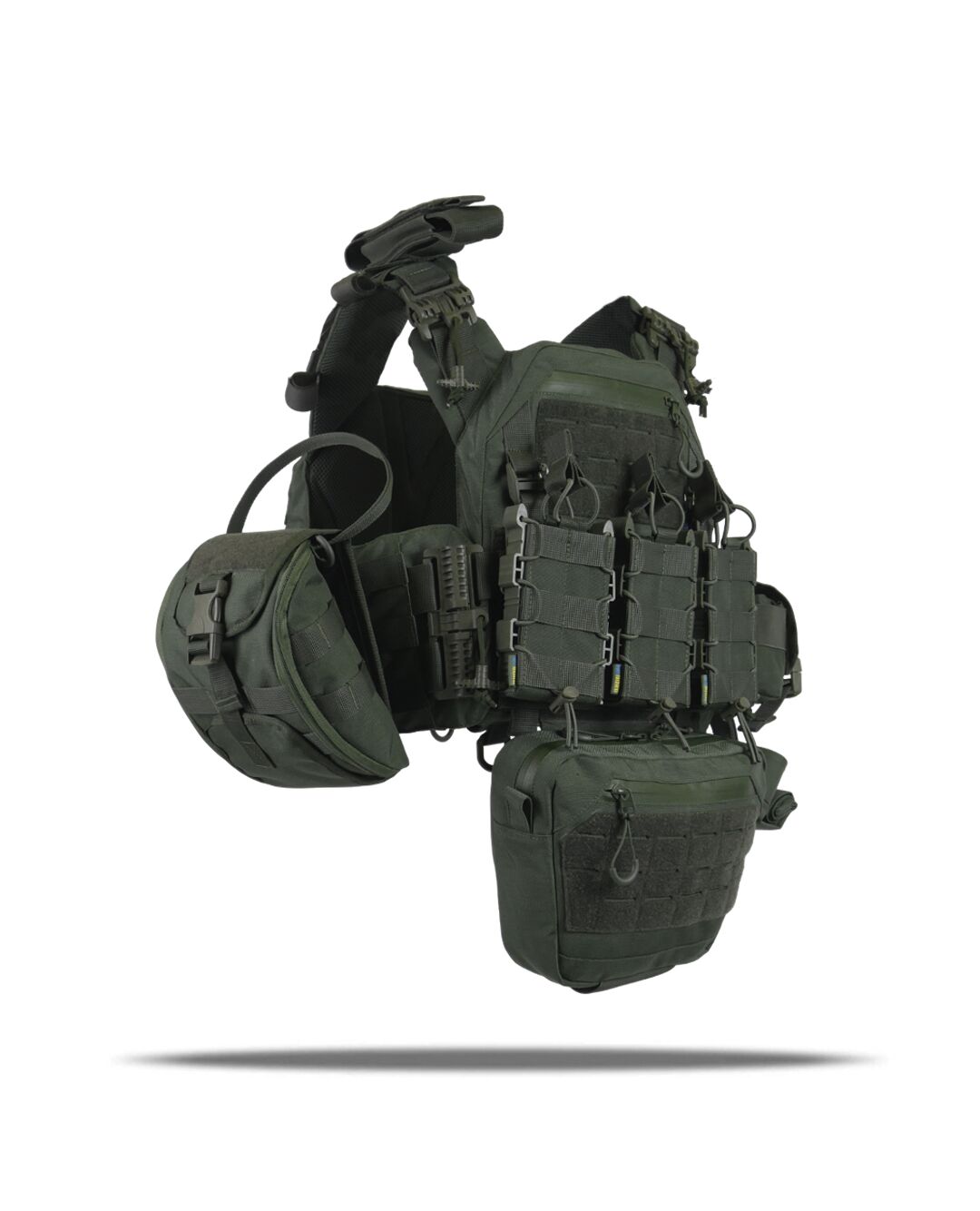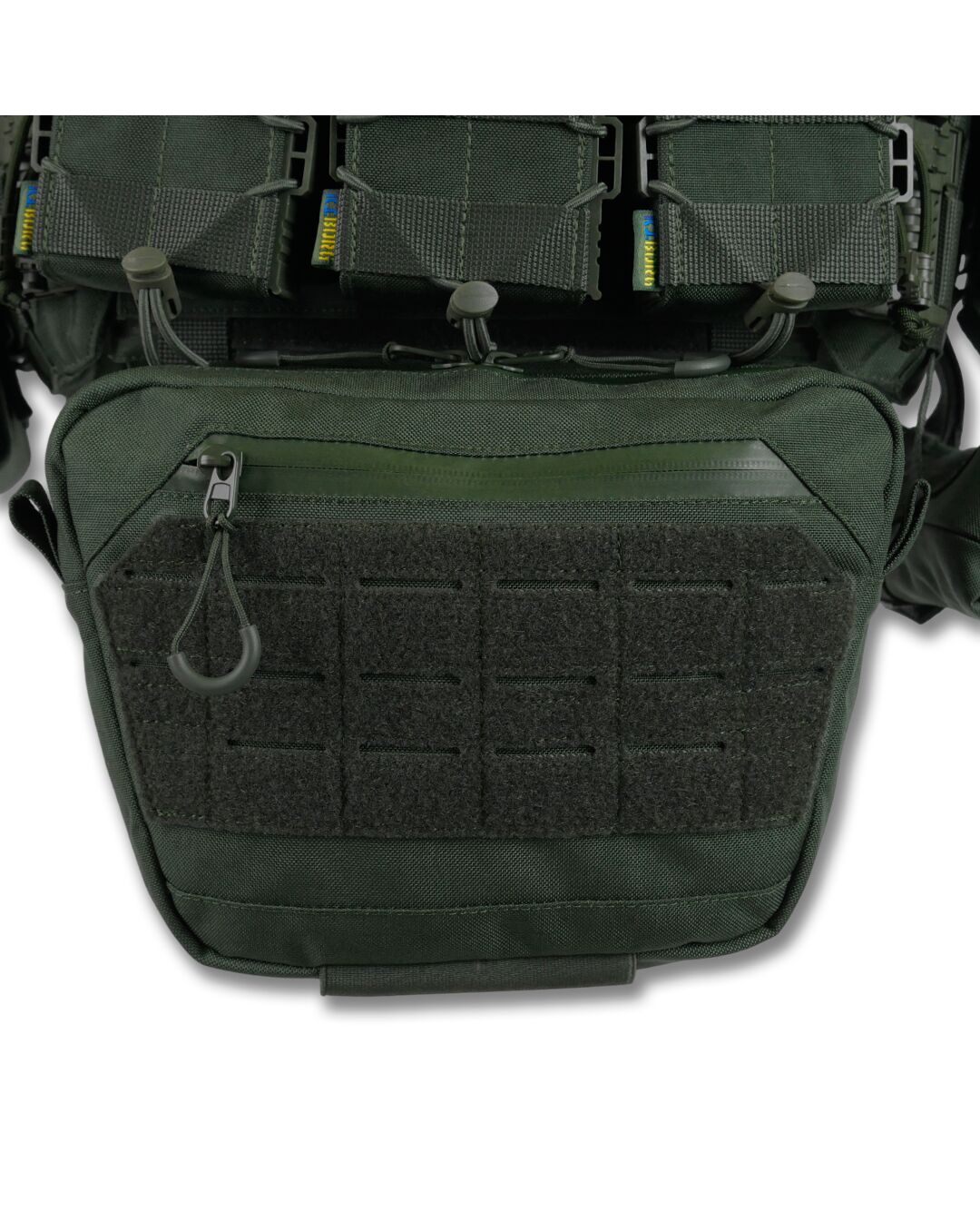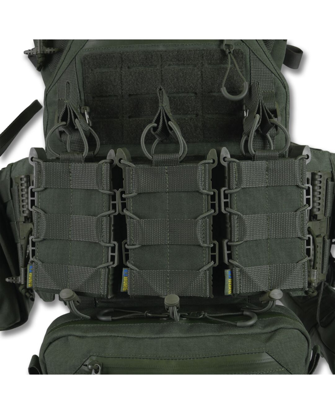 Плитоноска оснащена съемной передней Molle панелью, которая крепится к основанию на Velcro и дополнительно двумя карабинами Woojin. На ней удобно размещаются 3 итога под 1 или два магазина, или другое Molle-совместимое снаряжение. Эту панель можно быстро заменить другой с закрёклым на нее заранее набором нужных итогов.