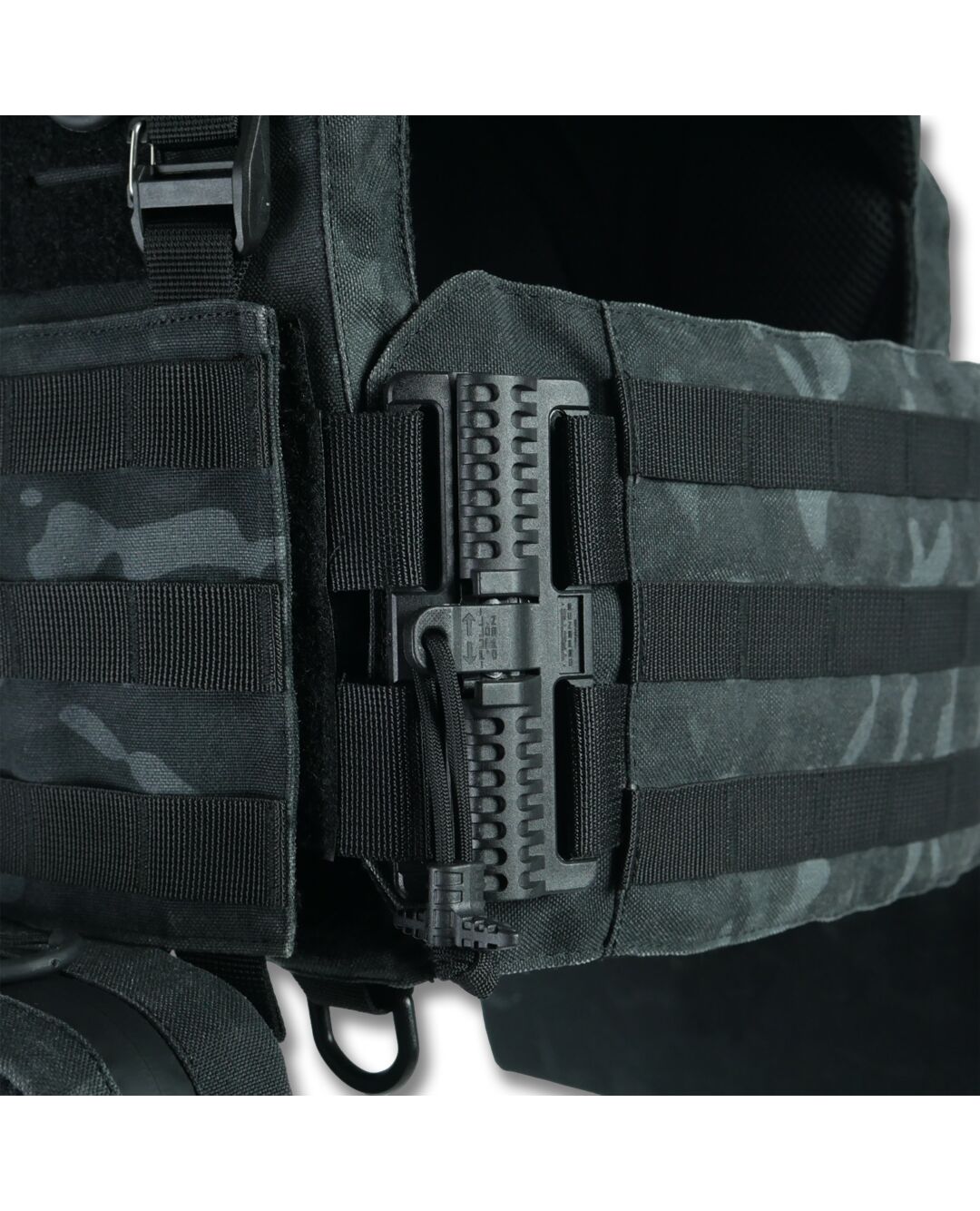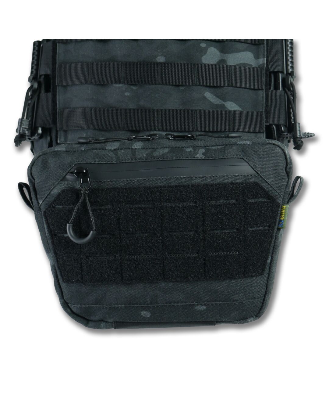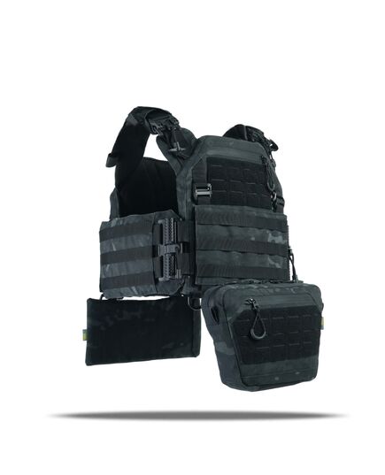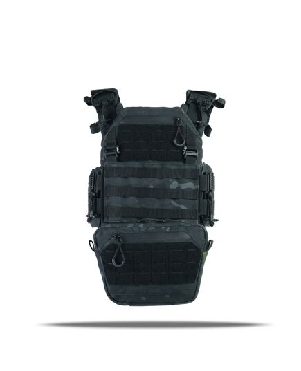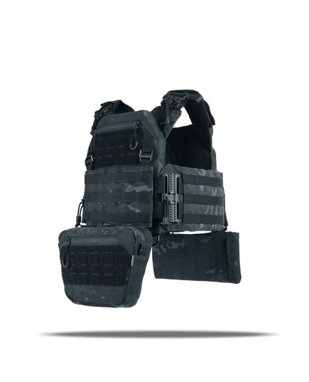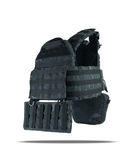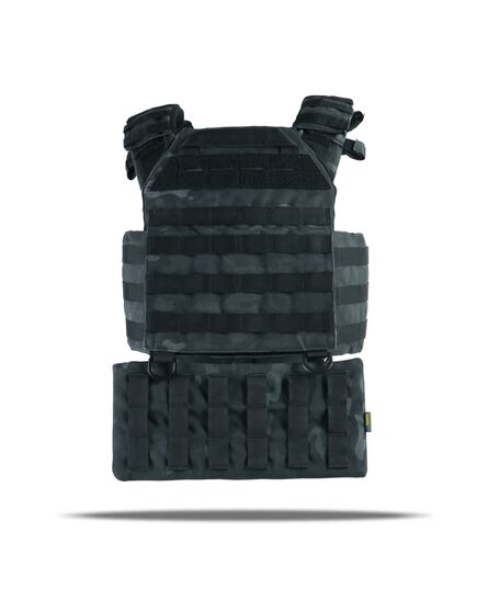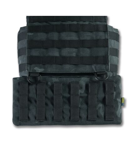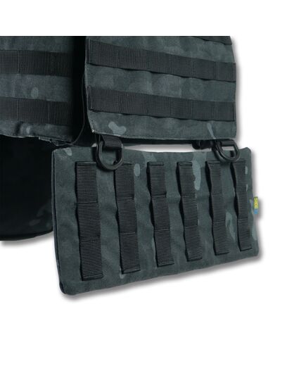 Плитоноска оснащена съемной передней Molle панелью, которая крепится к основанию на Velcro и дополнительно двумя карабинами Woojin. На ней удобно размещаются 3 итога под 1 или два магазина, или другое Molle-совместимое снаряжение. Эту панель можно быстро заменить другой с закрёклым на нее заранее набором нужных итогов.
