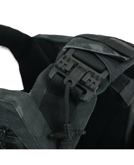 Верхние эргономичные плечевые лямки с мягким демпфером и 3D-сеткой органически повторяют контуры тела, правильно распределяют нагрузку и сильно не нажимают на плечи. На лямках присутствует система регулировки по длине (размеру), полноценные стропы Molle для крепления дополнительных итогов, чаще всего турникета или рации и дополнительные крепления для трубки гидратора. Мягкие подушки полностью перекрывают пластиковые пряжки быстрого сброса, что предотвращает натирку во время ношения.